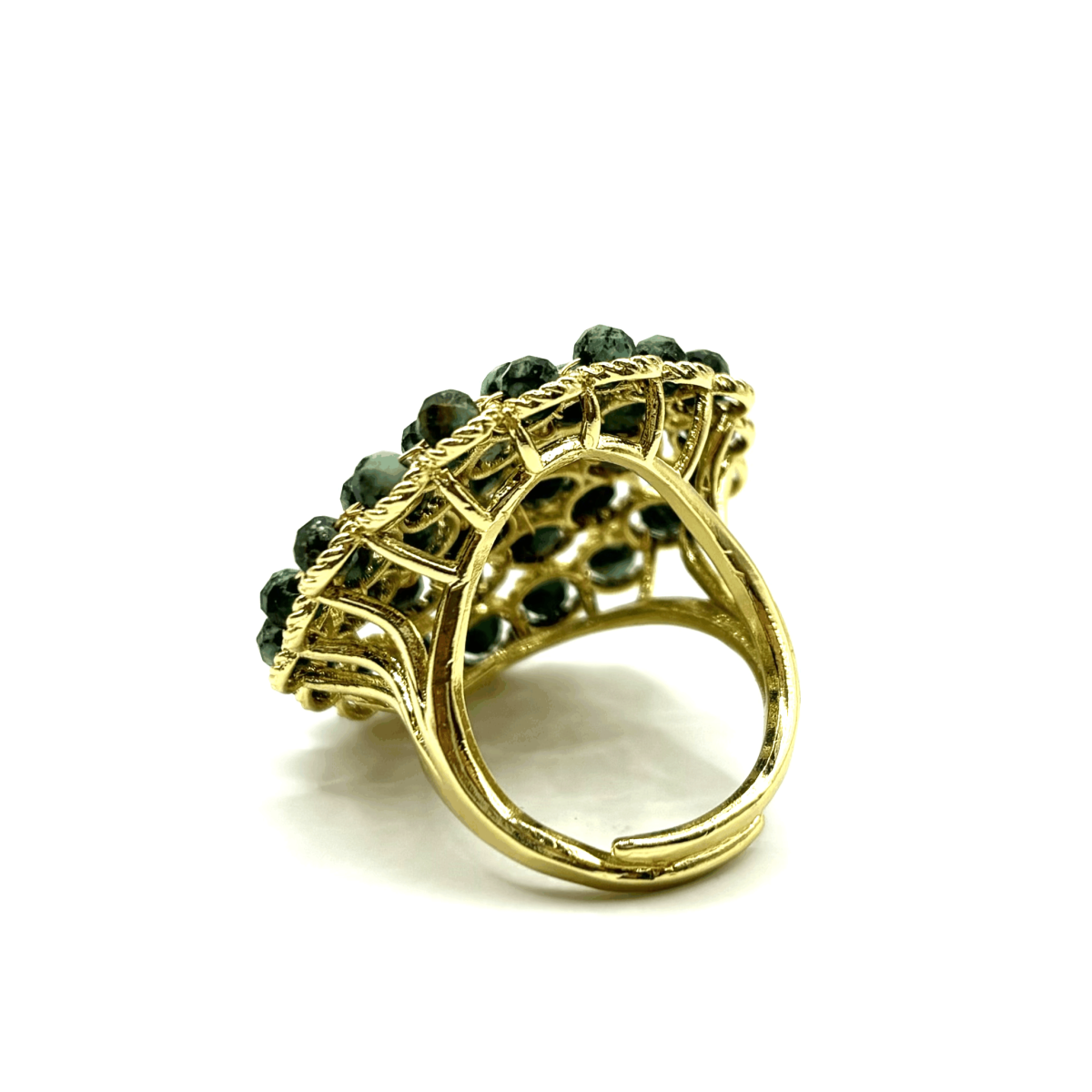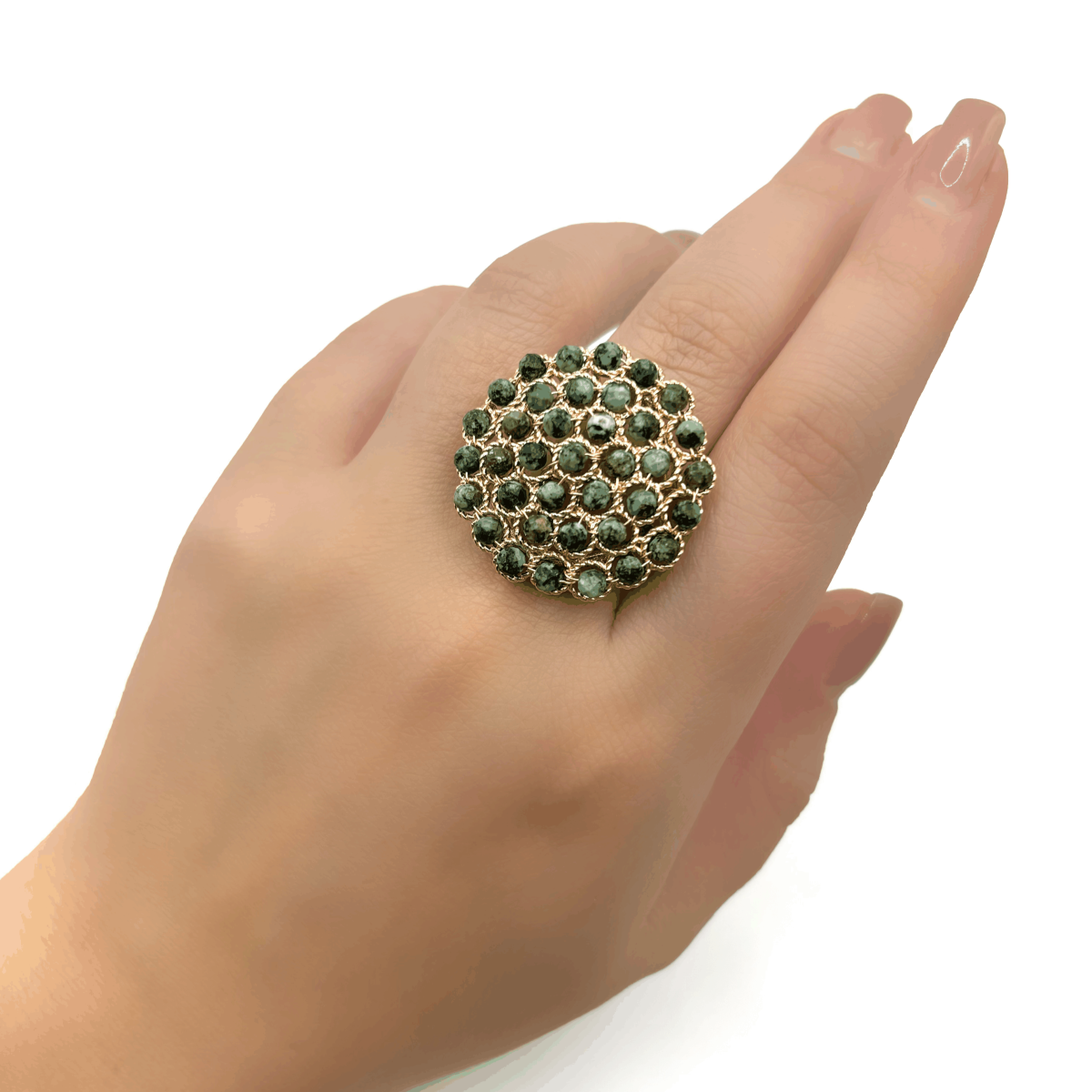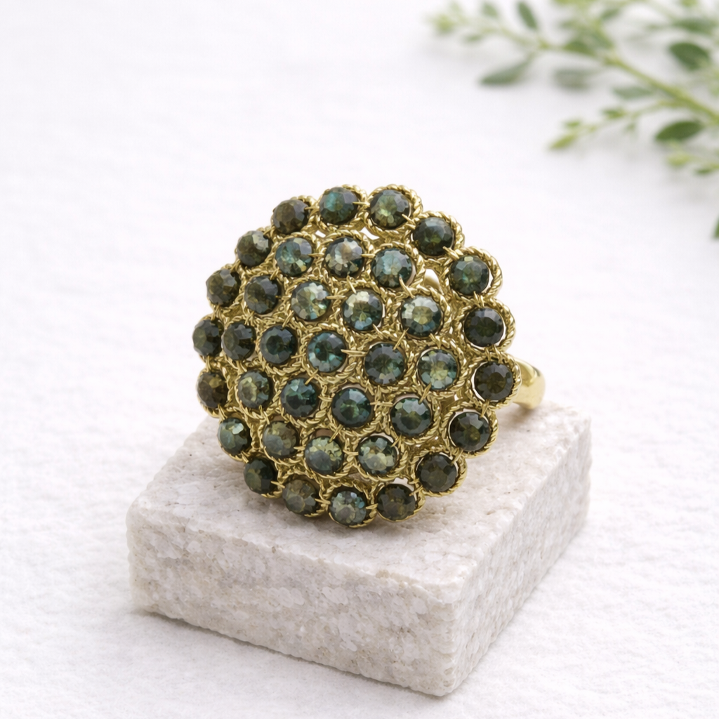 Круглое кольцо с натуральной бирюзой сразу притягивает взгляд своим свежим бирюзово-зелёным оттенком. Гладкая гранёная вставка подчёркивает аккуратный дизайн, а позолоченная основа из высококачественного бижутерного сплава делает кольцо выразительным и при этом удобным для ежедневной носки. Регулируемая конструкция позволяет надеть его на любой размер. Природный рисунок бирюзы придаёт кольцу особую живость и подчёркивает натуральное происхождение камня.