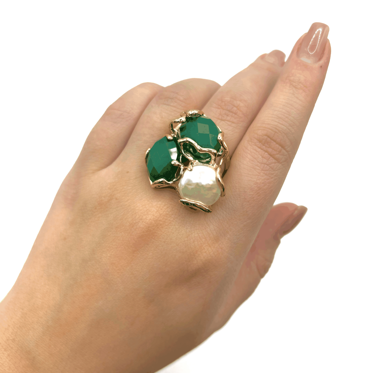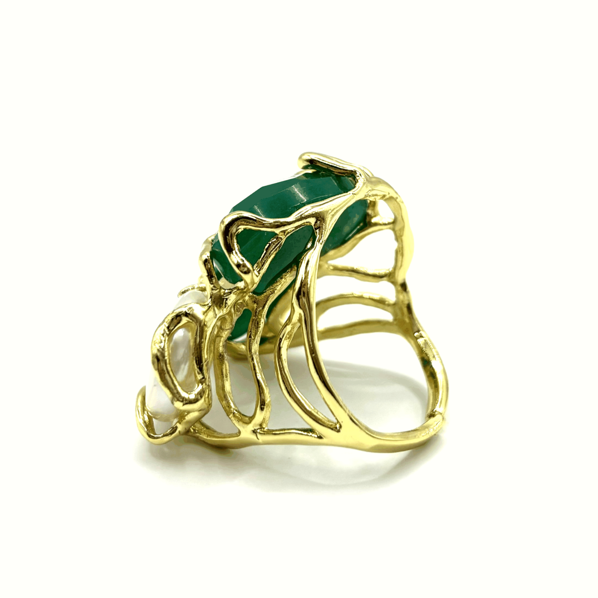 Ажурное кольцо с натуральным зелёным кварцем и пресноводным жемчугом выделяется сочетанием текстур и продуманной композицией из трёх крупных вставок. Контраст блестящего жемчуга и глубокого оттенка кварца делает модель заметной, но не перегруженной. Основа выполнена из высококачественного бижутерного сплава и покрыта позолотой, благодаря чему кольцо сохраняет аккуратный вид при ежедневной носке. Регулируемая конструкция позволяет удобно носить его на любом размере.