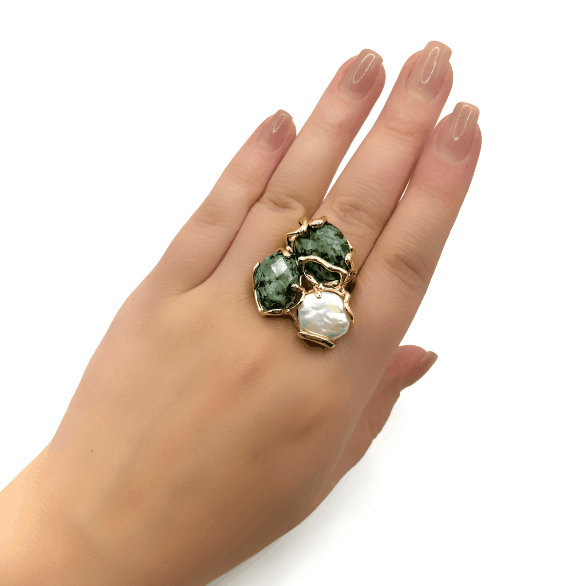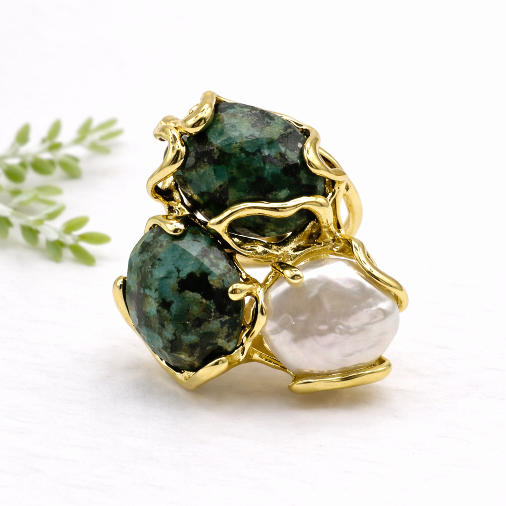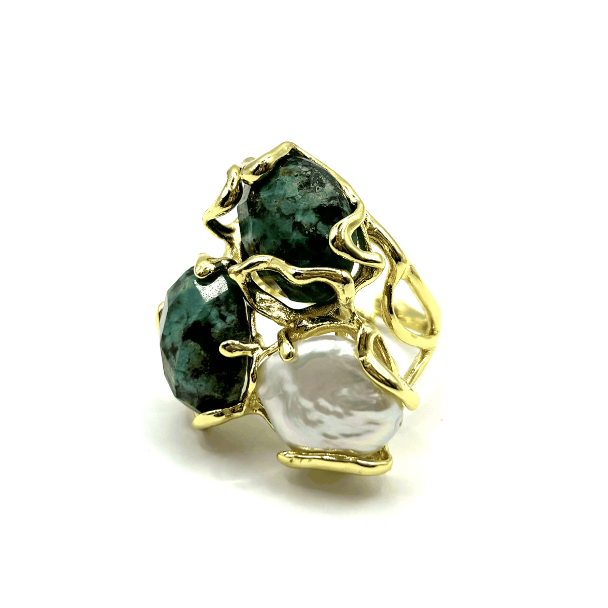 Ажурное кольцо с натуральной бирюзой и барочным жемчугом выделяется контрастом холодного бирюзово-зелёного оттенка и тёплого перламутра. Три крупные вставки создают выразительную композицию, а сочетание гладкой и гранёной обработки делает дизайн особенно эффектным. Основа выполнена из высококачественного бижутерного сплава с позолотой, сохраняющей благородный вид при ежедневной носке. Регулируемая конструкция позволяет комфортно носить кольцо на любом размере.