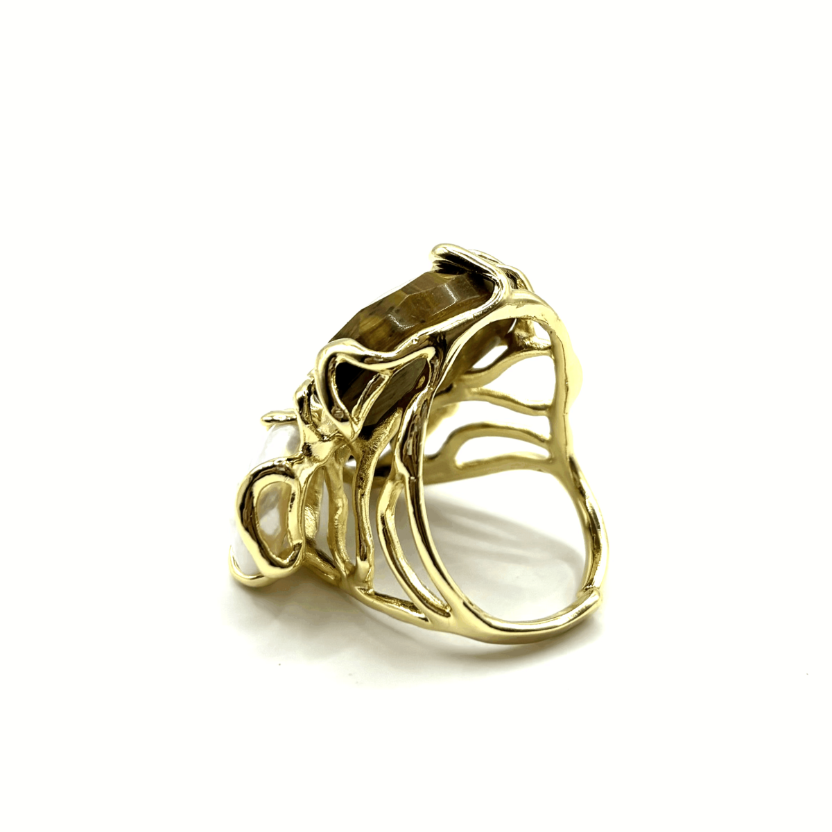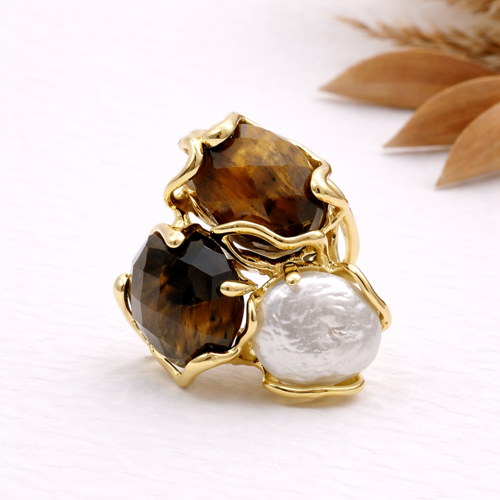 Ажурное кольцо с натуральным тигровым глазом и барочным жемчугом выделяется глубоким тёмно-горчичным оттенком камня и контрастным перламутровым блеском. Сочетание гладкой и гранёной обработки делает композицию из трёх вставок особенно выразительной. Основа выполнена из высококачественного бижутерного сплава и покрыта позолотой, что обеспечивает украшению аккуратный, благородный вид. Регулируемая конструкция позволяет комфортно носить кольцо на любом размере.