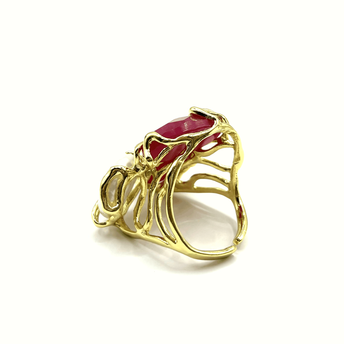 Ажурное кольцо с натуральным тонированным малиново-красным кварцем и барочным жемчугом выделяется насыщенной палитрой и выразительными крупными вставками. Сочетание гладкого перламутра и гранёного кварца создаёт эффектный контраст, благодаря которому модель сразу привлекает внимание. Основа выполнена из высококачественного бижутерного сплава и покрыта позолотой, что обеспечивает аккуратный внешний вид при регулярной носке. Регулируемая конструкция позволяет легко подстроить кольцо под любой размер.