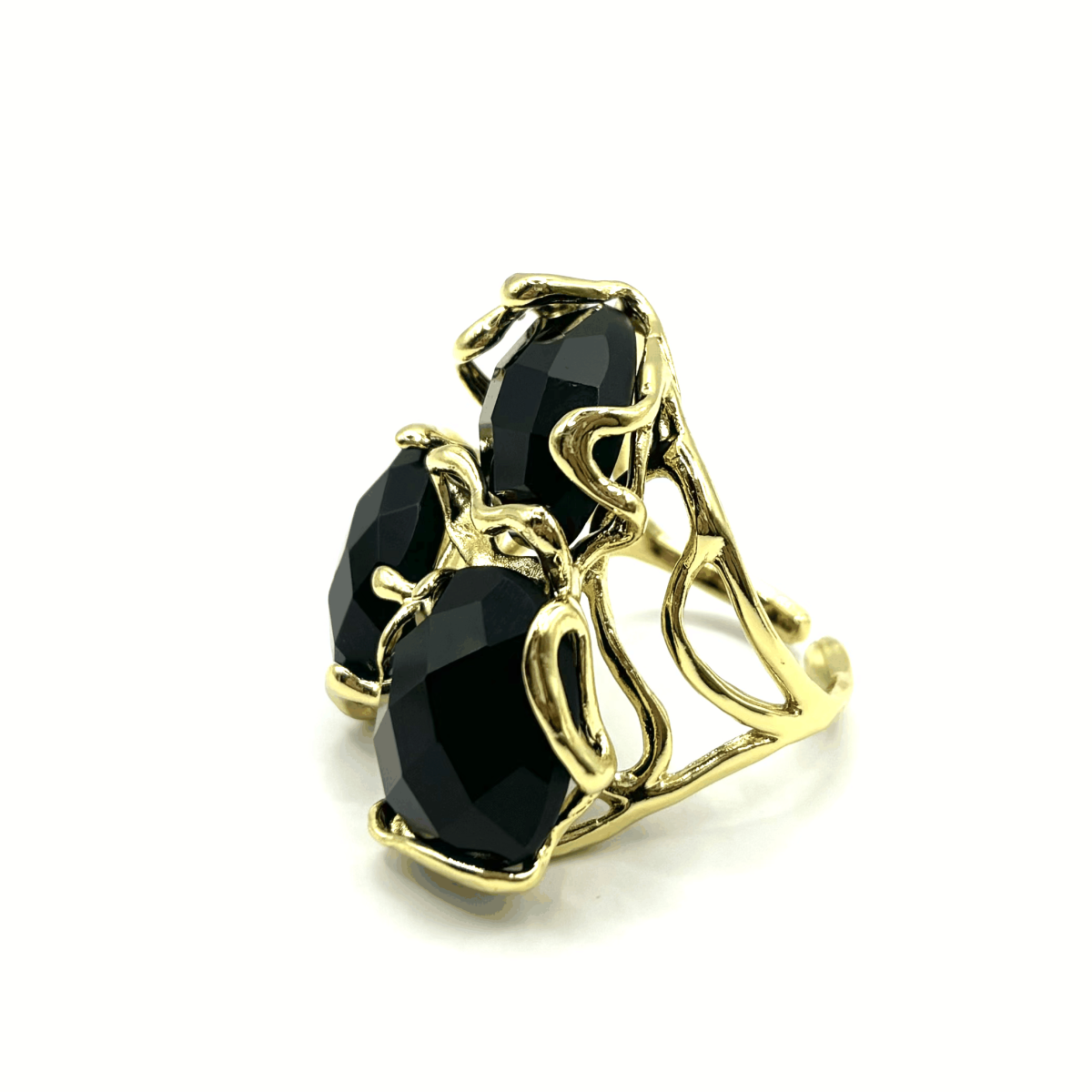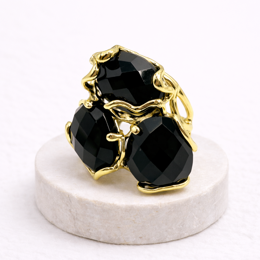 Ажурное кольцо с глубоким чёрным агатом создано для тех, кто любит украшения с характером. Тёмный минерал подчёркивает изящный рисунок основы, усиливая контраст между гладкими линиями сплава и блеском гранёного камня. Позолоченное покрытие придаёт кольцу благородный оттенок и помогает сохранять аккуратный вид при регулярной носке. Безразмерная конструкция позволяет комфортно адаптировать кольцо под любой палец, а натуральный агат делает модель выразительной и элегантной.