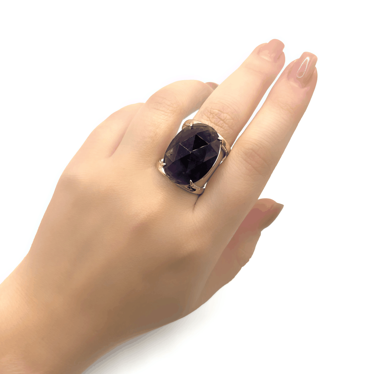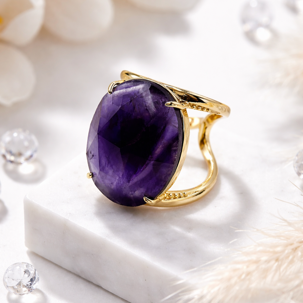 Кольцо с крупным аметистом создано для тех, кто любит выразительные акценты в образе. Объёмный природный камень оттенка глубокого фиолета красиво играет на свету благодаря гранёной огранке, а позолоченная основа подчёркивает его благородство. Массивная вставка размером 18×25 мм делает кольцо действительно заметным, но остаётся комфортной благодаря удобной безразмерной конструкции. Прочный бижутерный сплав с позолотой обеспечивает долговечность, а натуральный аметист — уникальность каждого изделия.