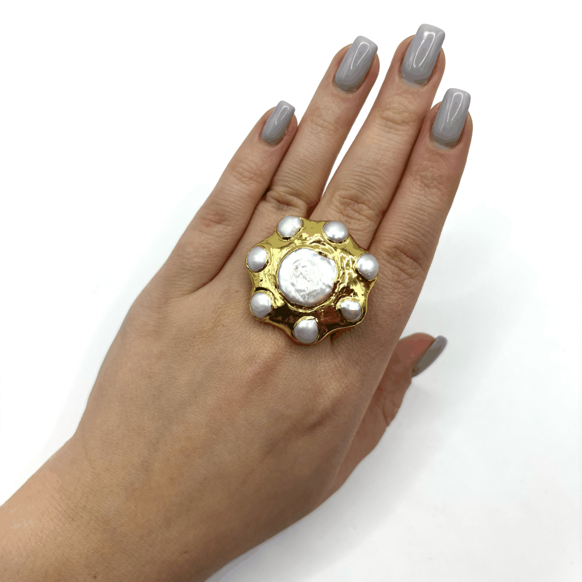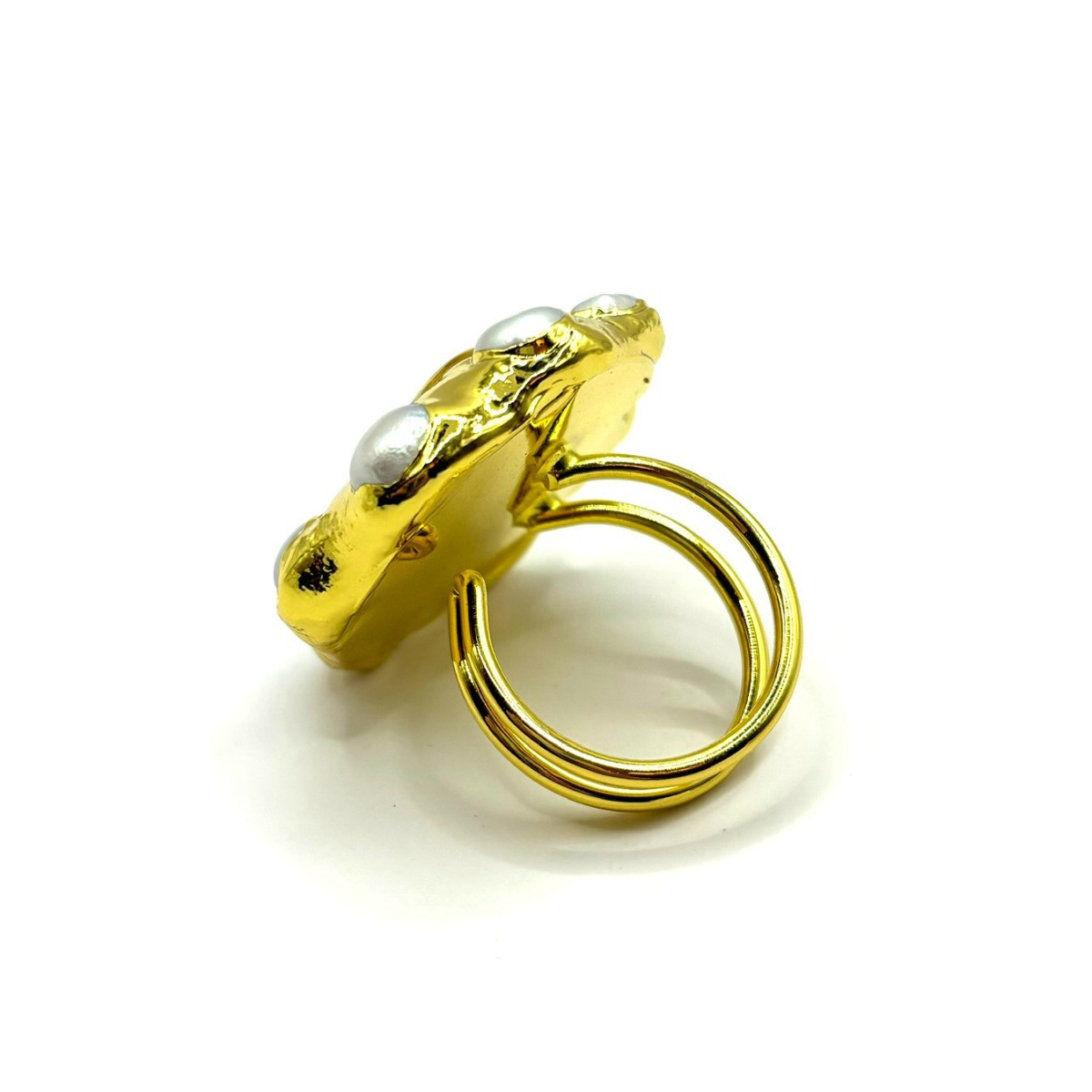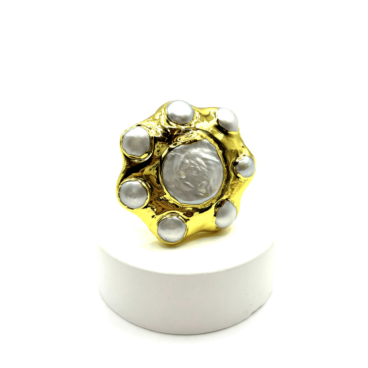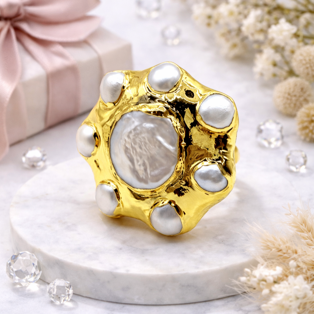 Эффектное безразмерное кольцо с барочным жемчугом — смелый акцент для тех, кто любит выразительные детали. Крупная позолоченная основа подчёркнута жемчужиной в центре и жемчужинами по окружности, создавая динамичный, запоминающийся дизайн. Разъёмная основа обеспечивает комфортную посадку и делает кольцо универсальным для любого образа.