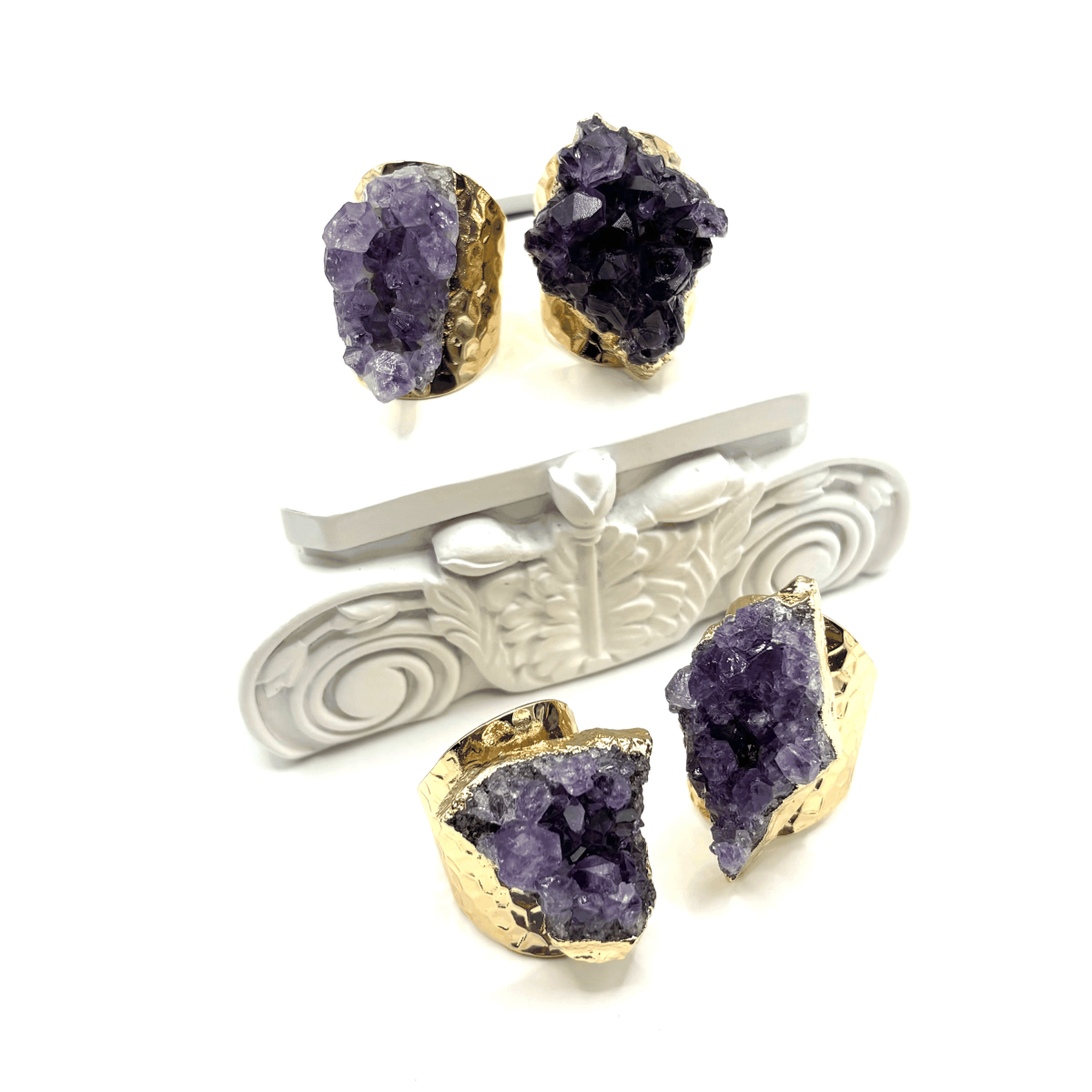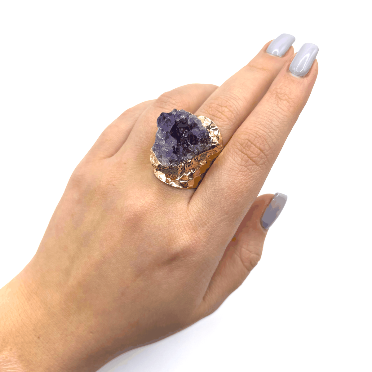Безразмерное кольцо с друзой аметиста выделяется природной красотой необработанного камня: каждая друза формирует уникальную фактуру и неповторимую форму. Глубокий аметистовый оттенок эффектно контрастирует с позолоченным бижутерным сплавом, а разъёмная основа обеспечивает удобную посадку. Яркий акцент для тех, кто выбирает индивидуальность.