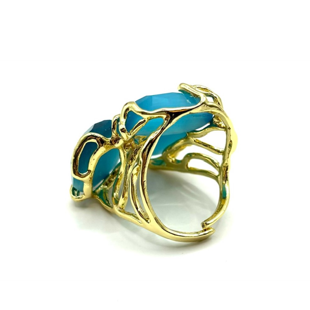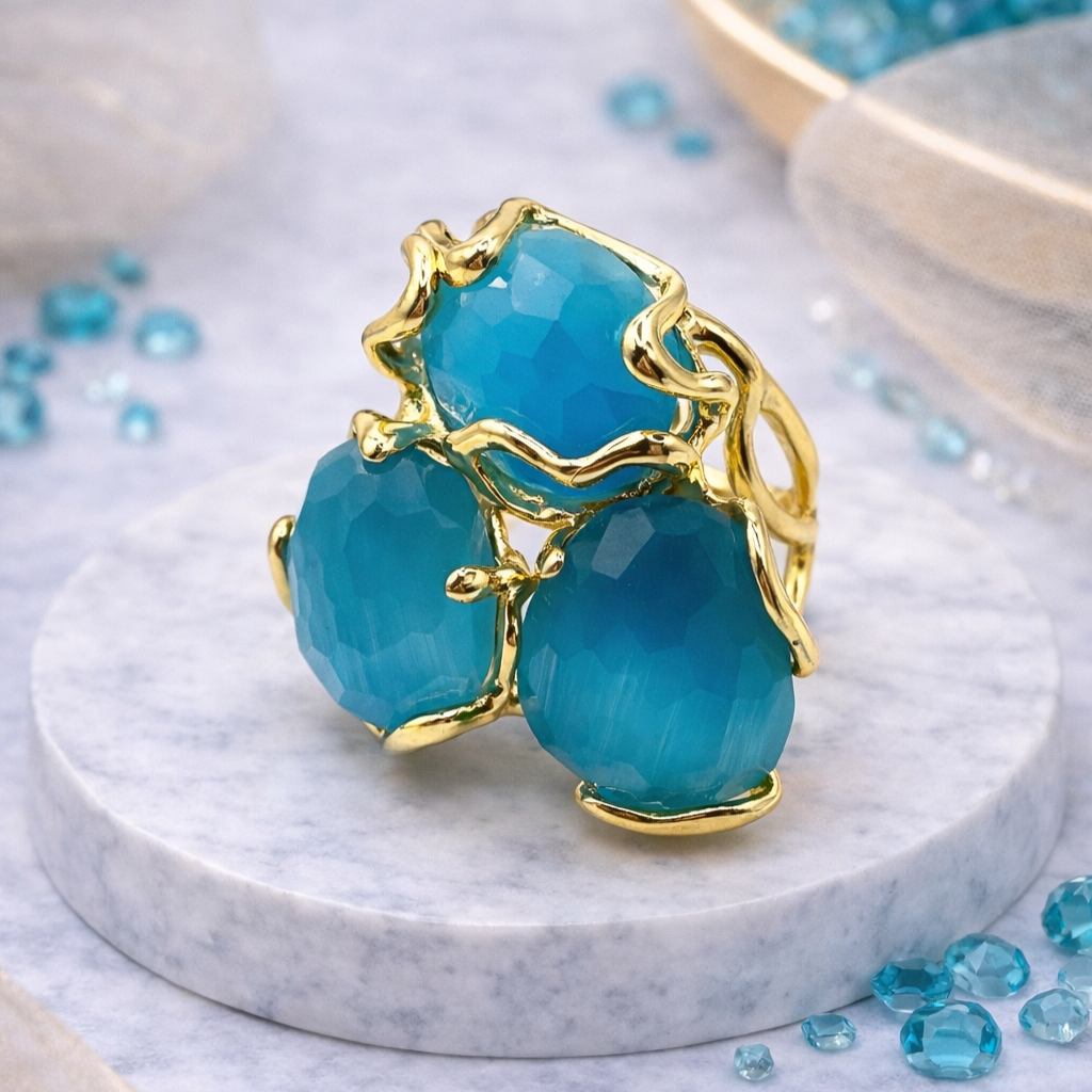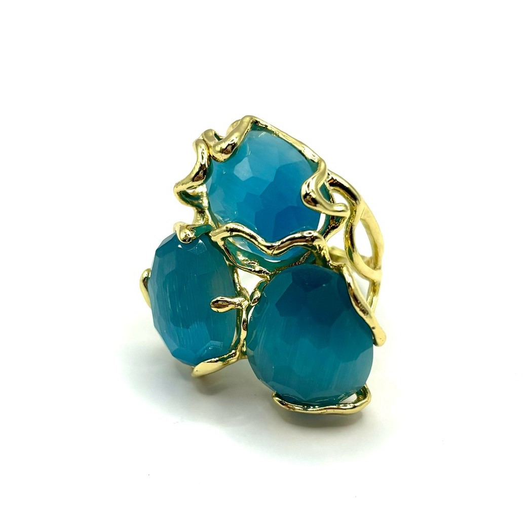 Ажурное кольцо с голубым тонированным кошачьим глазом привлекает внимание сочетанием воздушного дизайна и выразительных камней. Холодный «ледяной» оттенок вставок красиво контрастирует с тёплой позолотой, создавая эффектное свечение при движении. Безразмерная основа обеспечивает комфорт и универсальность, а крупные натуральные камни добавляют кольцу характер и стиль, делая его ярким дополнением к любому образу.