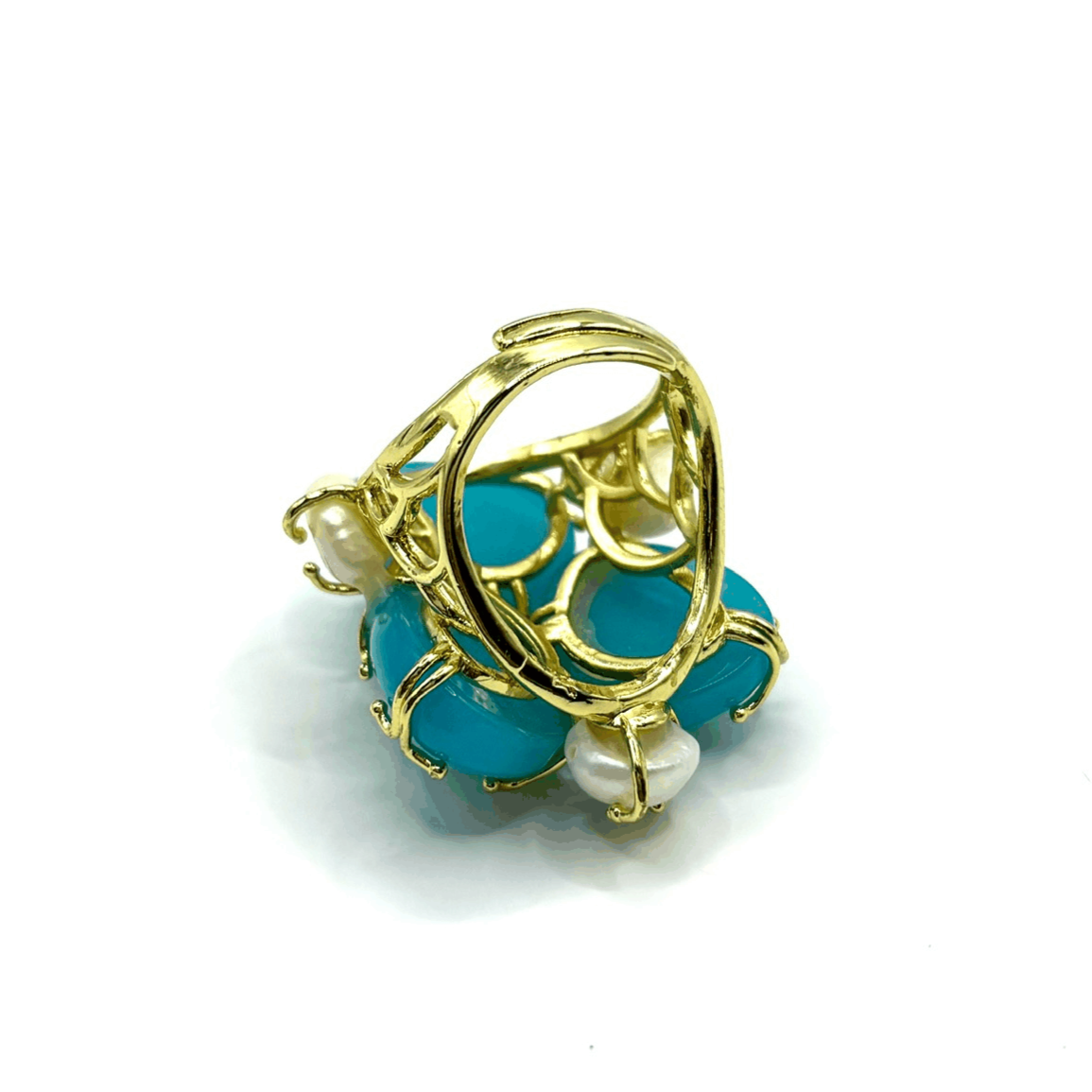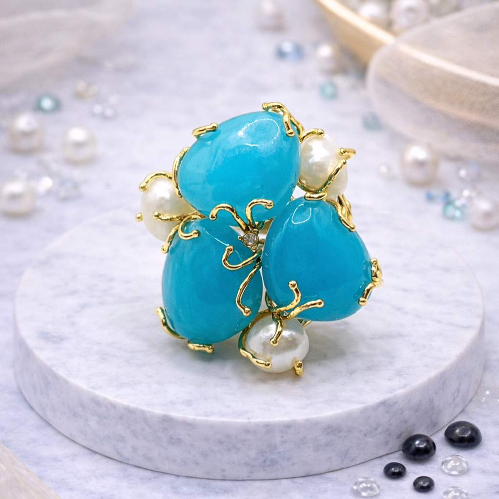 Ажурное кольцо с речным жемчугом и голубым тонированным кварцем создаёт лёгкий, свежий акцент в образе. Мягкое сияние речного жемчуга гармонирует с блеском натурального кварца, усиливая креативность дизайна. Позолоченная основа из высококачественного бижутерного сплава делает кольцо износостойким, а безразмерная конструкция обеспечивает удобную посадку. Идеальный выбор для тех, кто любит заметные, но утончённые детали.