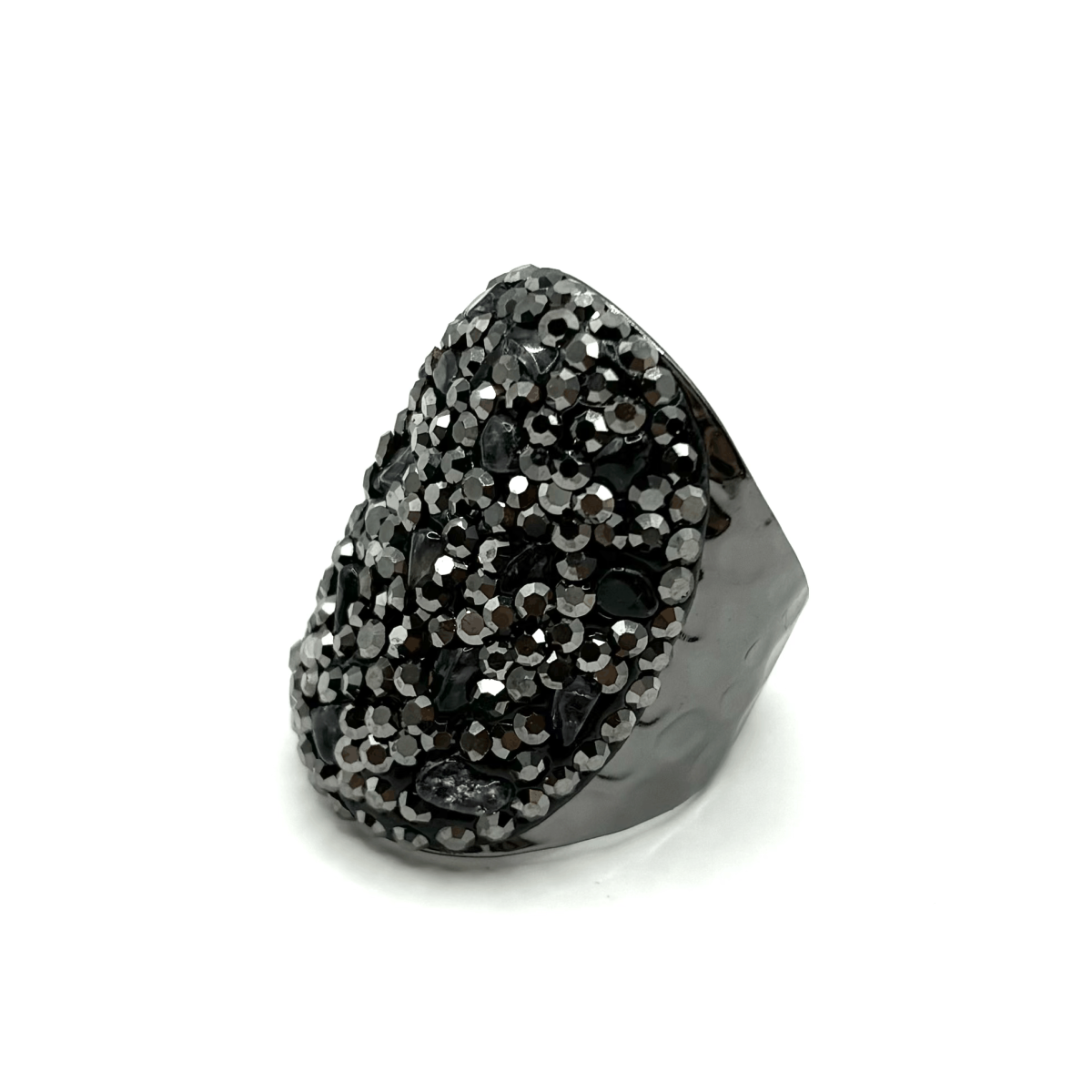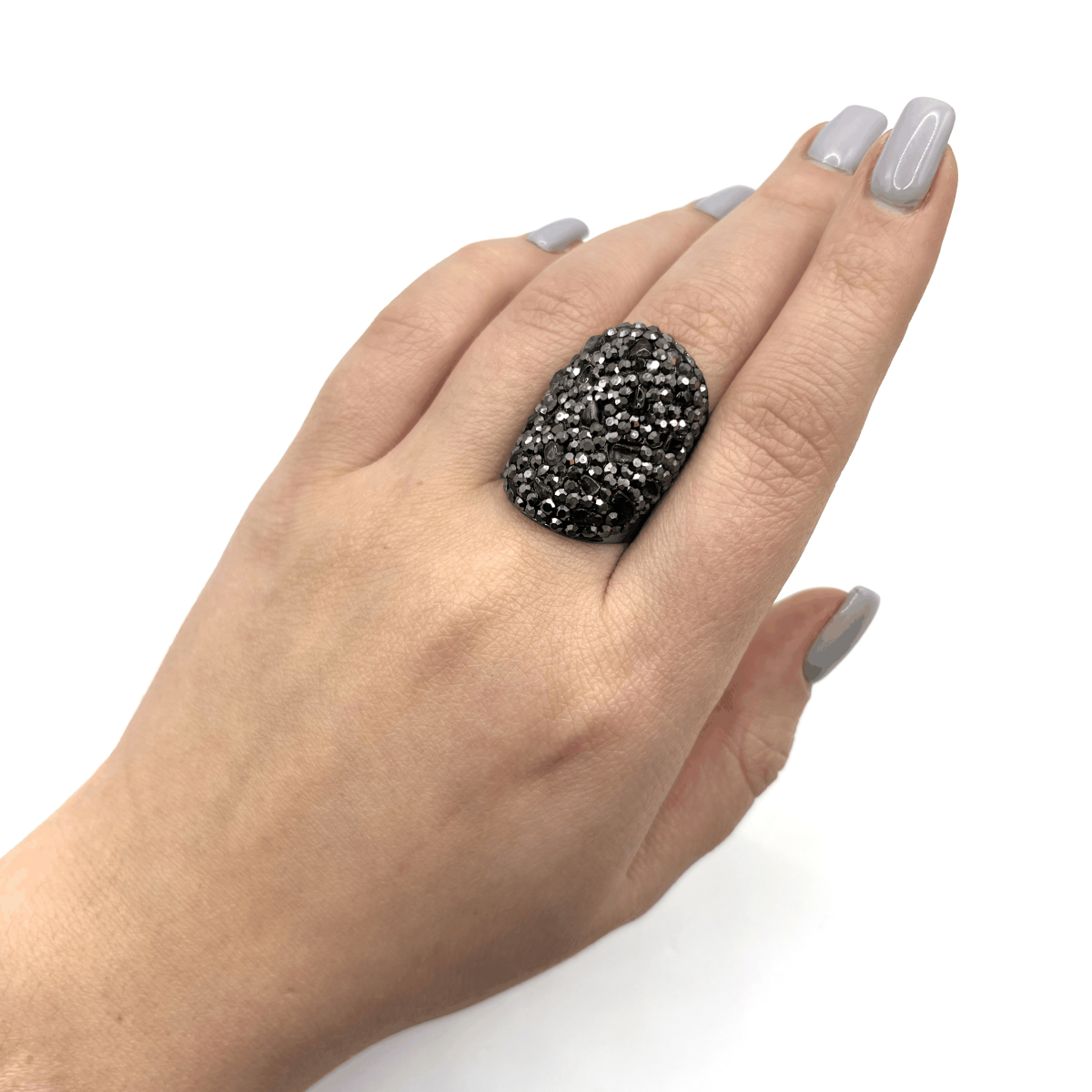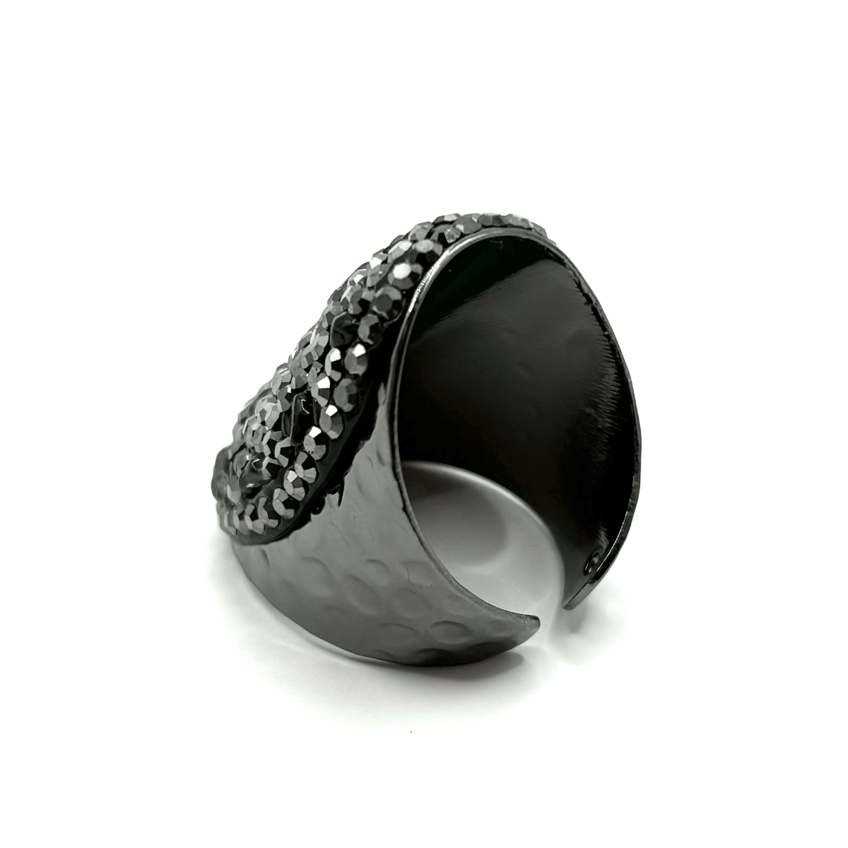Черное кольцо с марказитом и глубоким темным аметистом создаёт эффектный контраст и привлекает внимание с первого взгляда. Комбинация холодного металлического блеска и насыщенного темно-фиолетового оттенка придаёт украшению таинственный, почти мистический характер. Прочная регулируемая основа обеспечивает комфортную посадку, а натуральные камни добавляют изделию характер и выразительность.