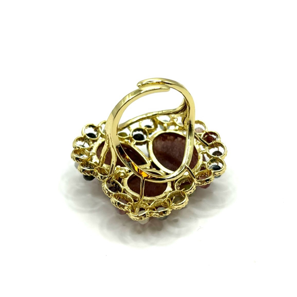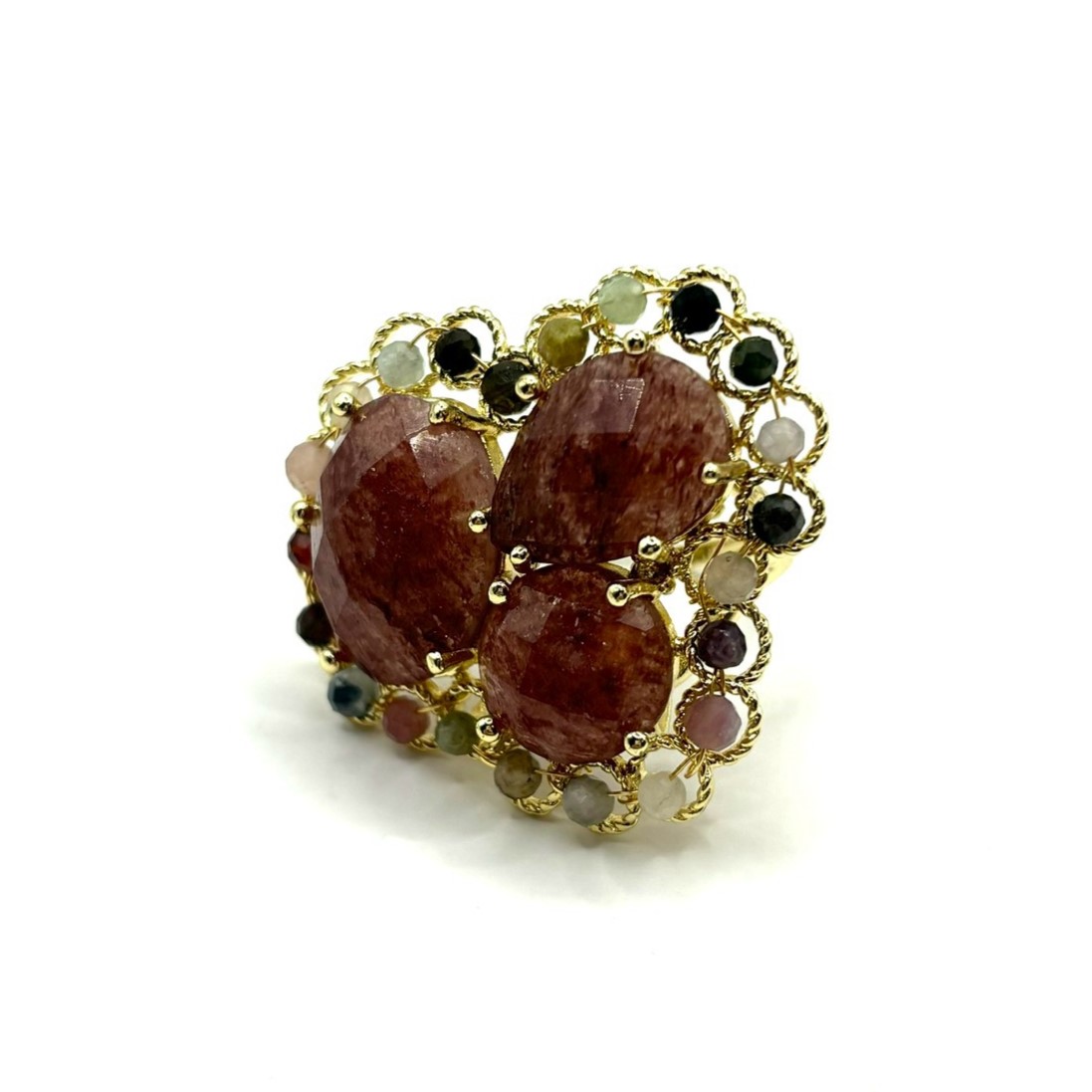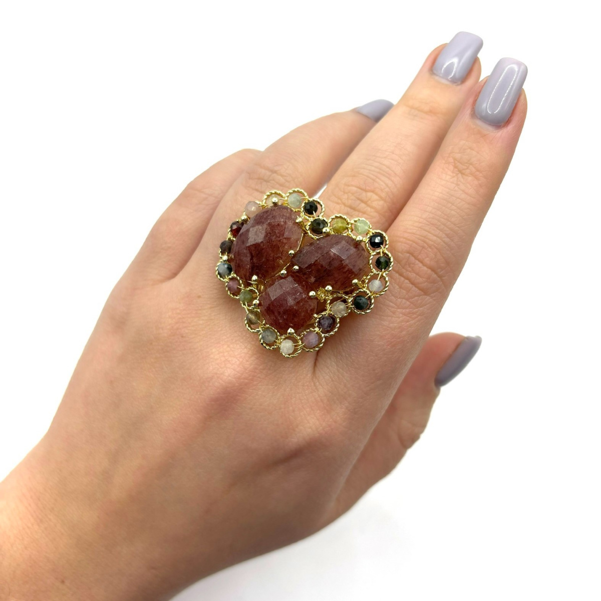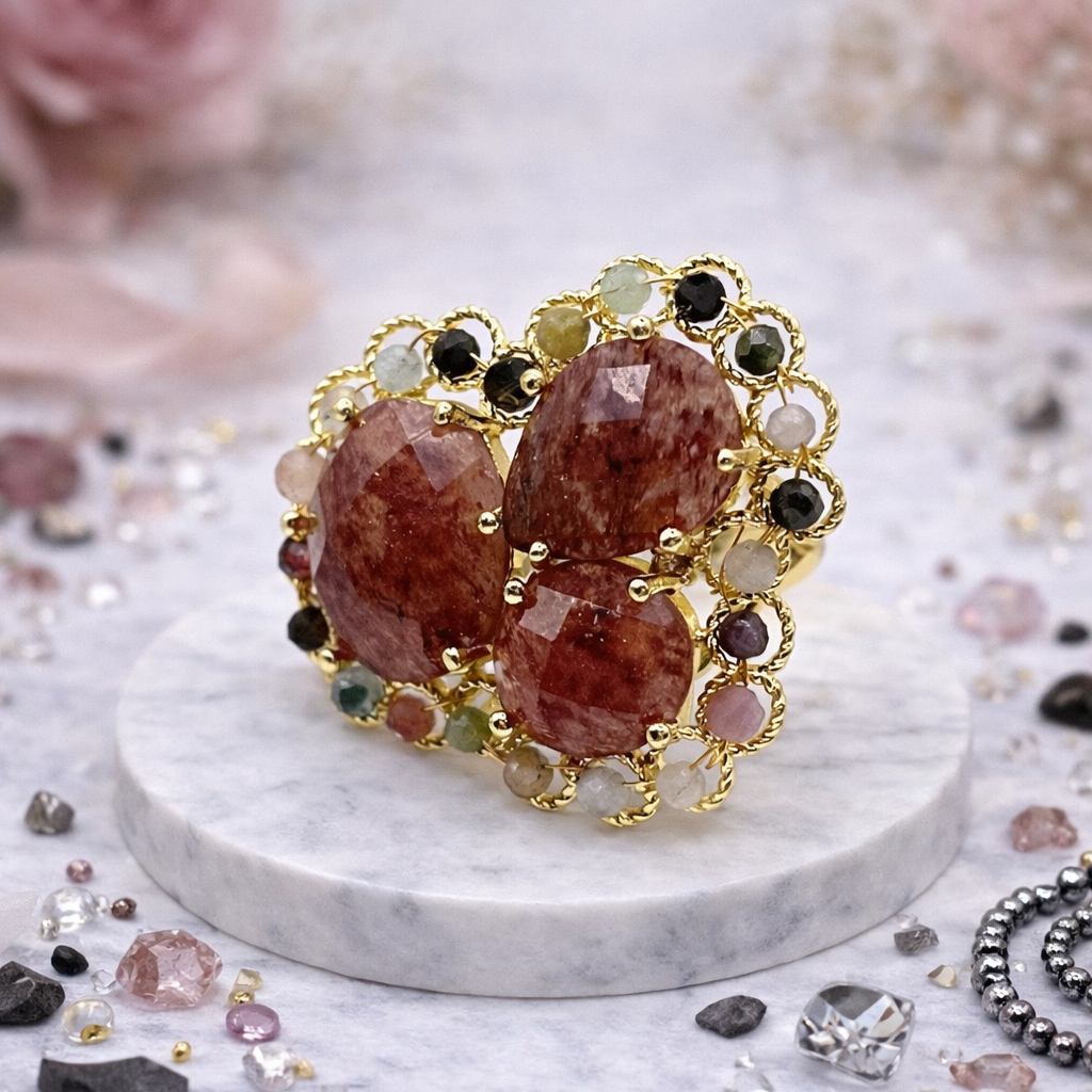 Кружевное кольцо с клубничным кварцем и турмалином привлекает мягким сиянием и глубокими оттенками натуральных камней. Тонкая узорная основа подчёркивает благородство минералов, создавая гармоничное и запоминающееся сочетание. Украшение выглядит эффектно и женственно, добавляя образу утончённости. Надёжный бижутерный сплав обеспечивает долговечность и комфорт в носке.