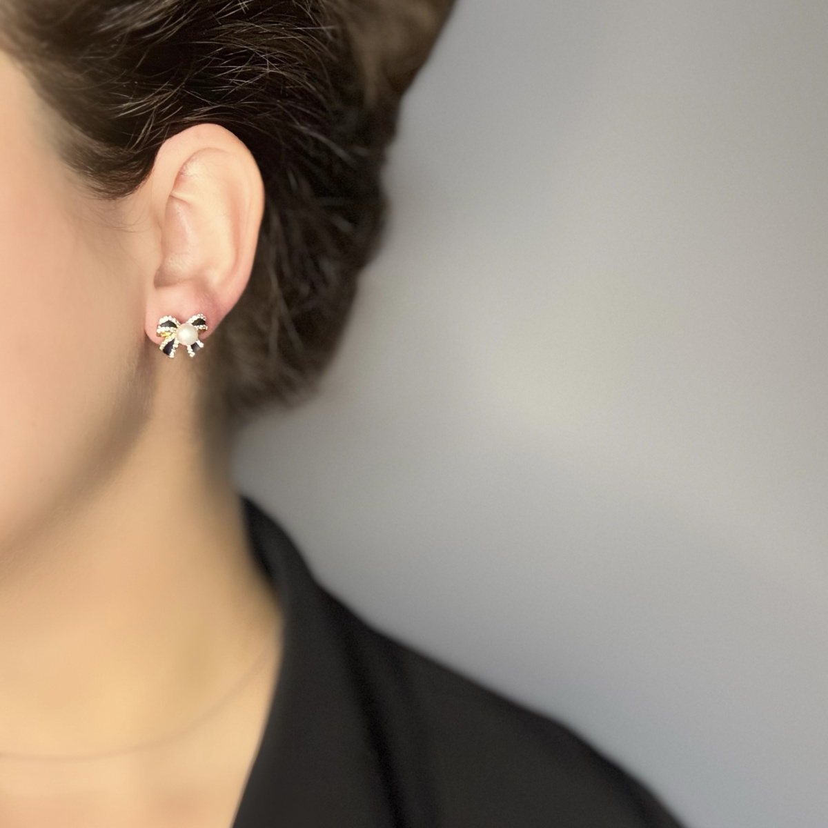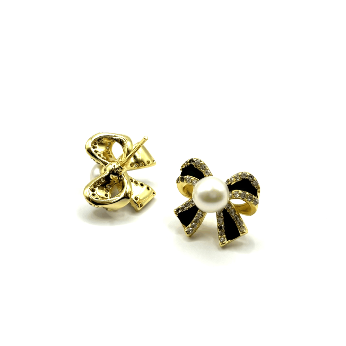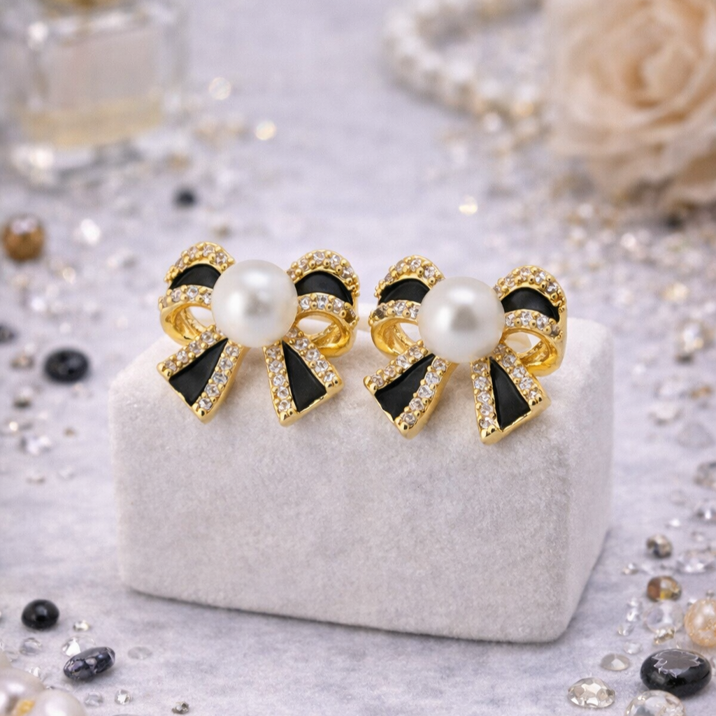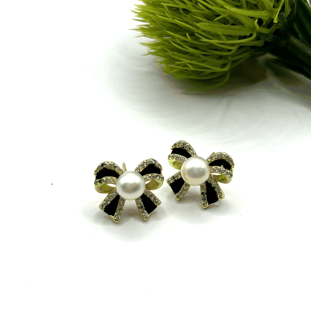Стильные серьги-бантики с речным жемчугом, эмалью и мерцающими цирконами создают нежный, выразительный акцент. Жемчуг мягко подсвечивает лицо, а эмаль добавляет изящную графичность. Универсальный размер и лёгкий блеск делают их подходящими и для повседневных сочетаний, и для вечерних образов. Прекрасный выбор, если хочется аксессуара, который подчеркнёт утончённость и аккуратно завершит стиль.