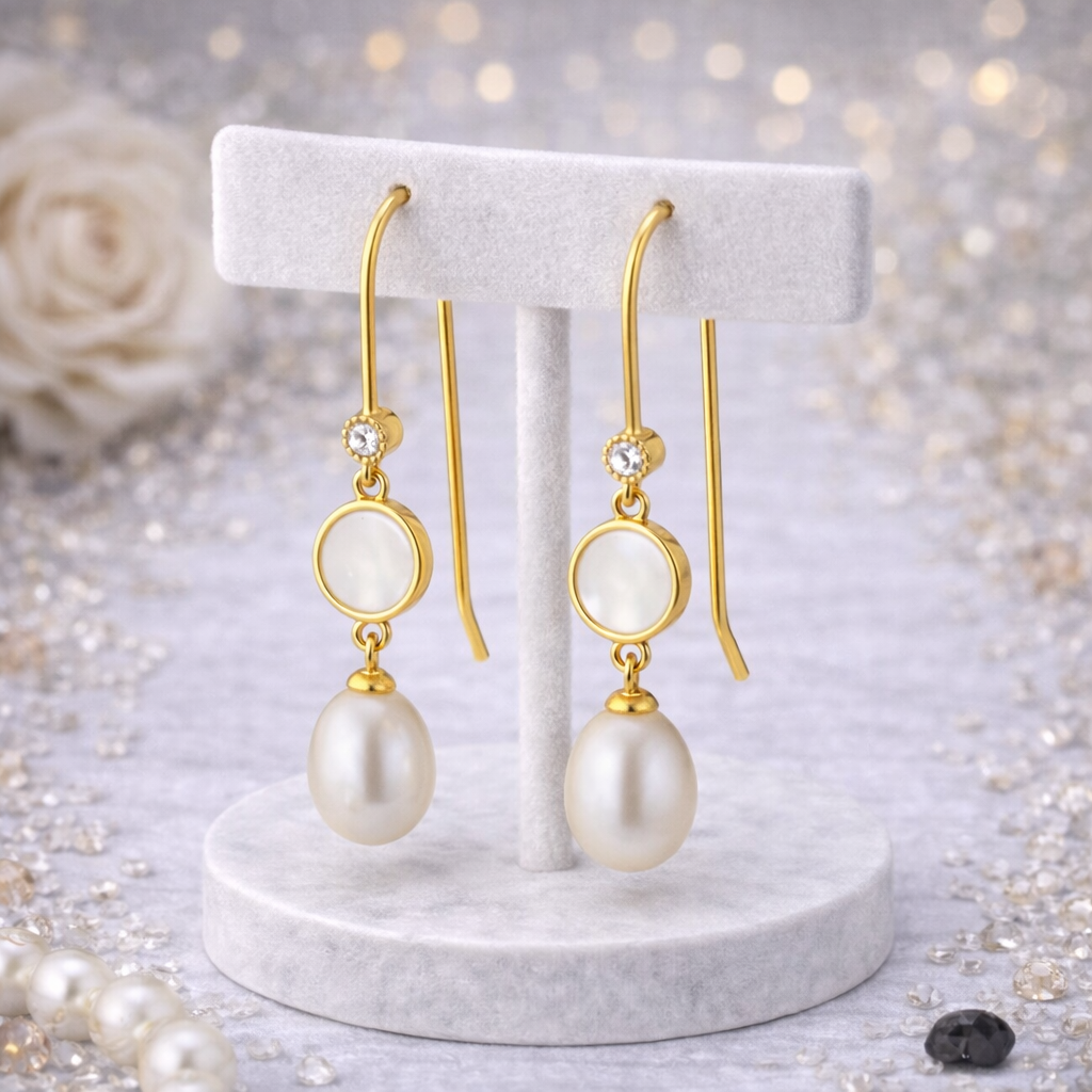 Серьги с жемчугом, перламутром и цирконами в позолоте выглядят особенно тёпло и выразительно. Золотистый оттенок подчёркивает природное сияние перламутра, жемчуг добавляет мягкости, а цирконы — лёгкий блеск. Высококачественный бижутерный сплав делает украшение надёжным и удобным. Такие серьги становятся акцентом образа и подчёркивают нежные черты.