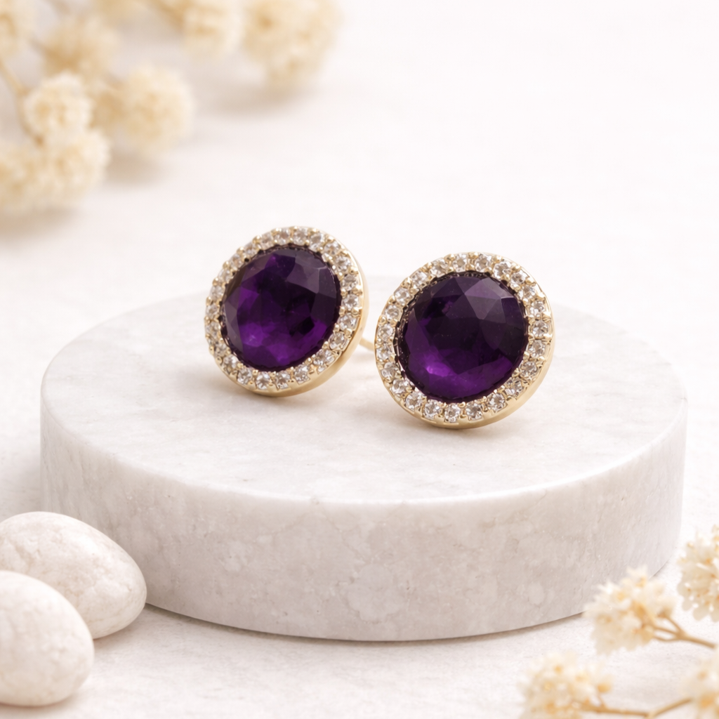 Пусеты с аметистом и цирконами выделяются мягким, глубоким фиолетовым оттенком камня и его чистой игрой на свету, дополненной сиянием маленьких цирконов. Высококачественный бижутерный сплав с позолотой обеспечивает износостойкость и комфорт. Замок-гвоздик надёжно фиксирует серьги и делает их универсальными для любого стиля.
