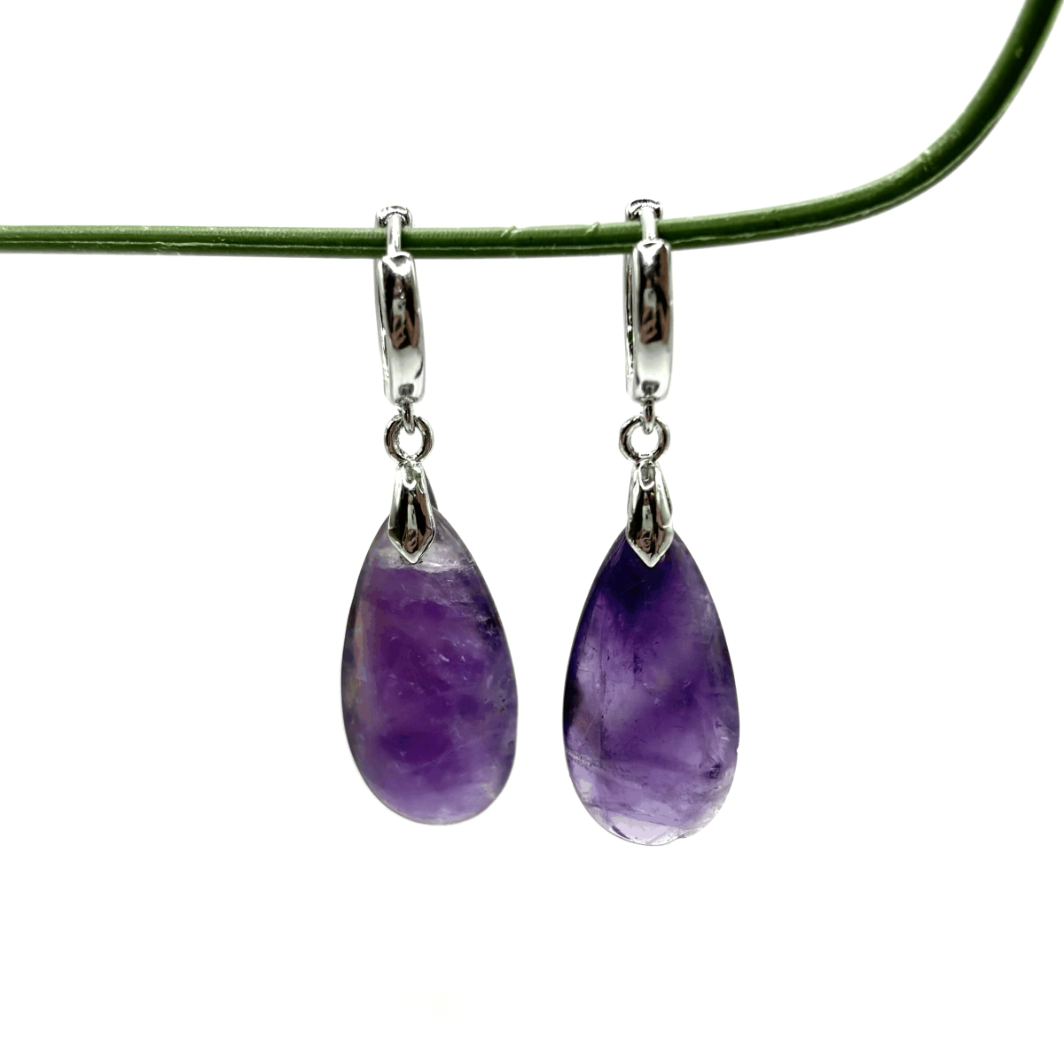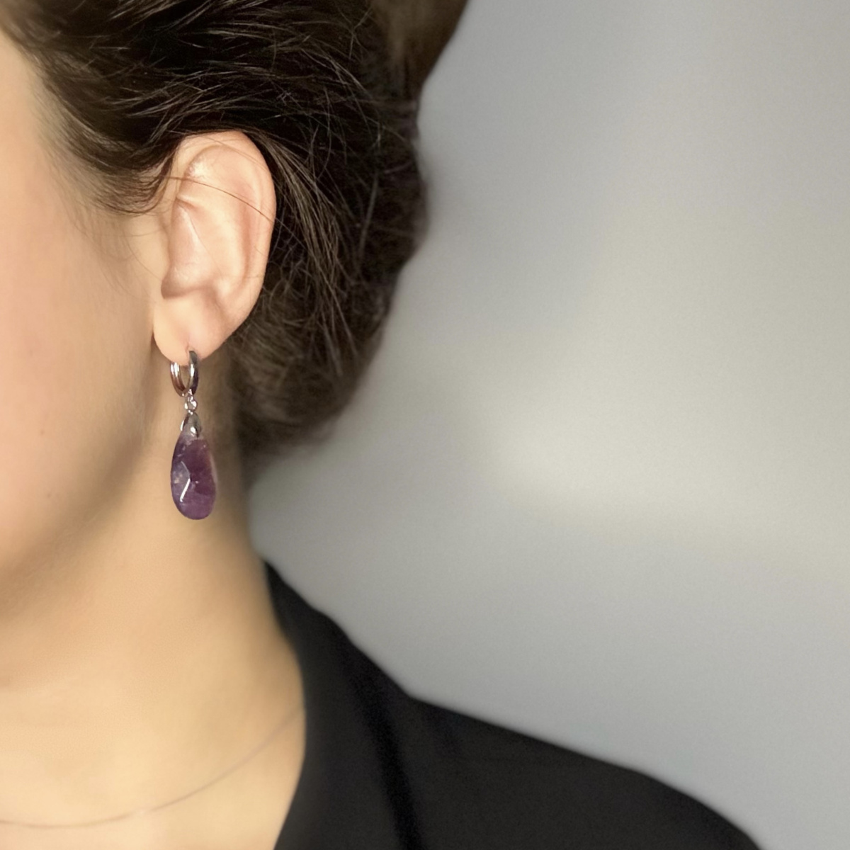 Серьги-конго с аметистом на серебристой основе подойдут тем, кто любит прохладные, сдержанные сочетания. Гранёный фиолетовый камень даёт аккуратные блики и добавляет образу выразительности без лишнего блеска. Высококачественный бижутерный сплав обеспечивает долговечность, а практичный замок-конго быстро застёгивается и не мешает в течение дня.