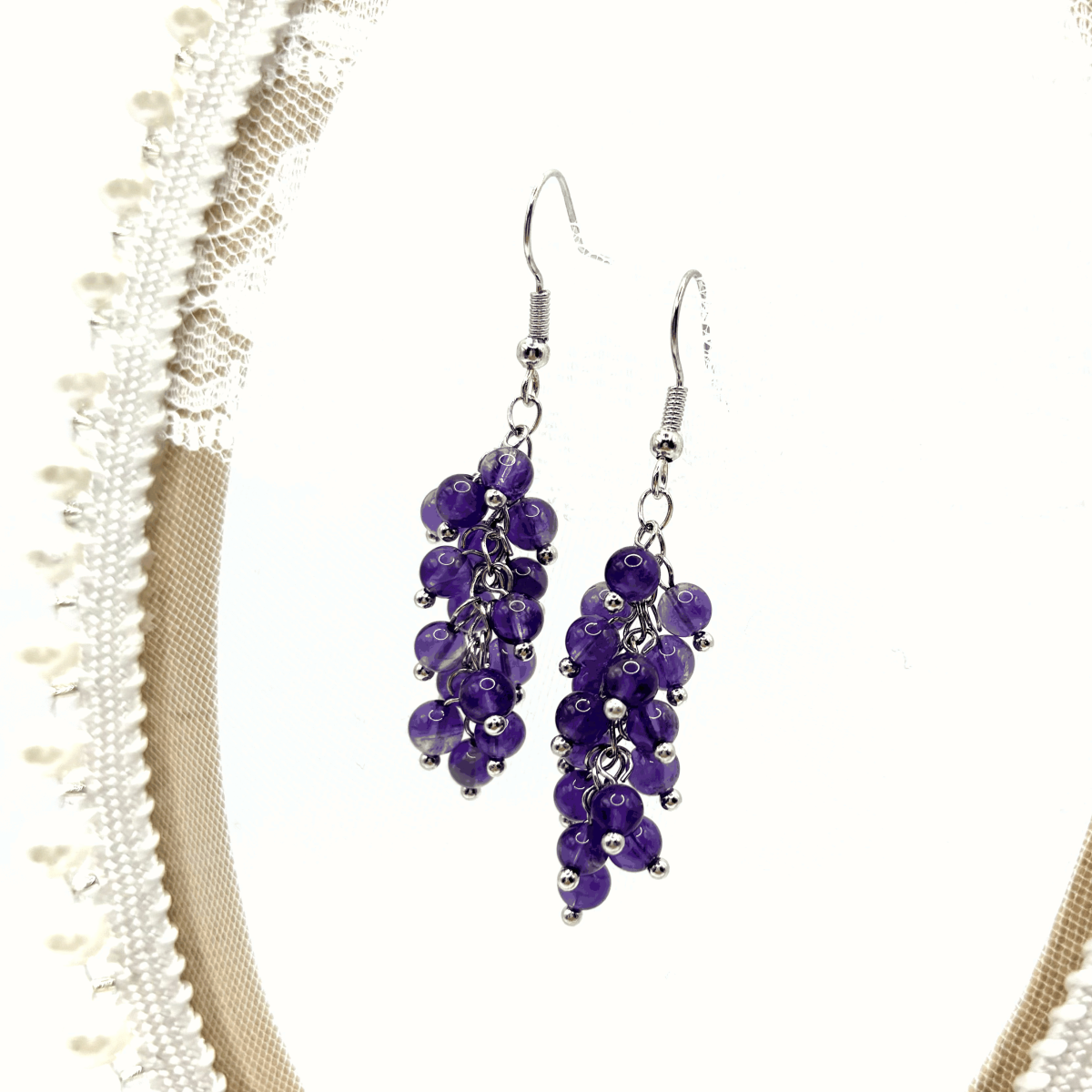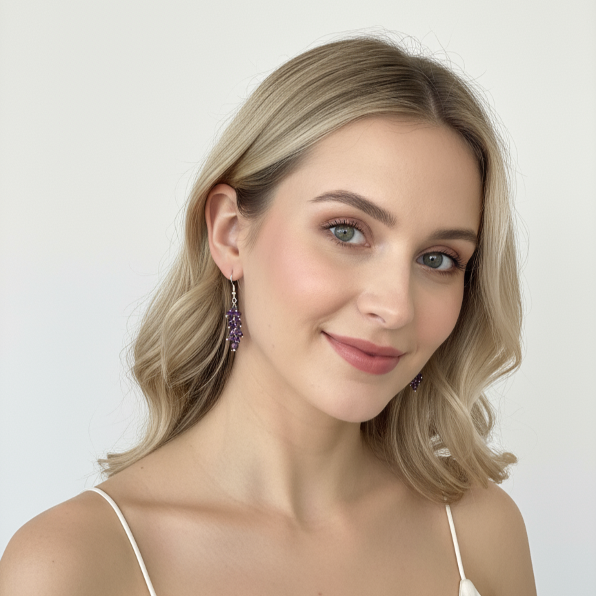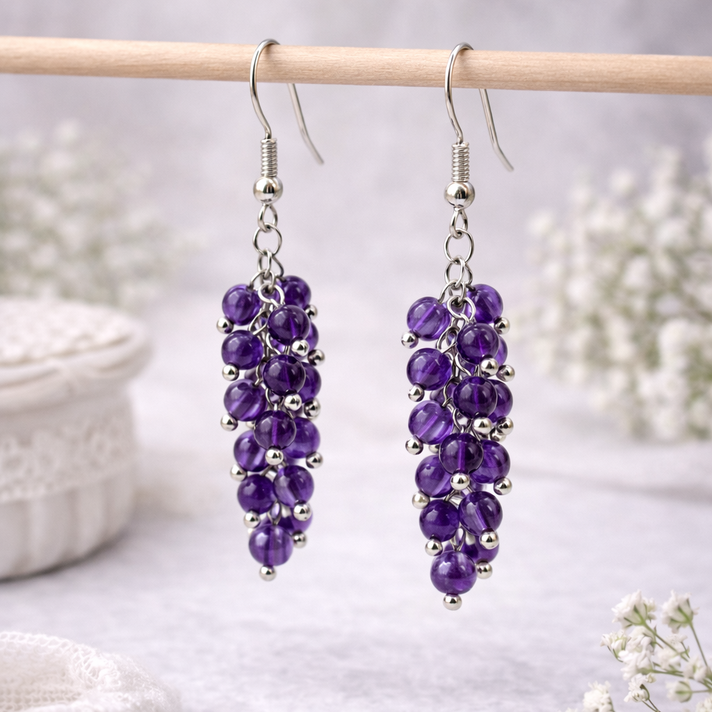 Серьги «Виноград» с натуральным аметистом придают образу мягкий цветовой акцент: фиолетовые камни делают черты лица более выразительными и утончёнными. Лаконичный дизайн позволяет сочетать серьги и с платьем, и с базовыми рубашками. Высококачественный бижутерный сплав обеспечивает износостойкость. Замок-петля удобен и практически не ощущается в течение дня.