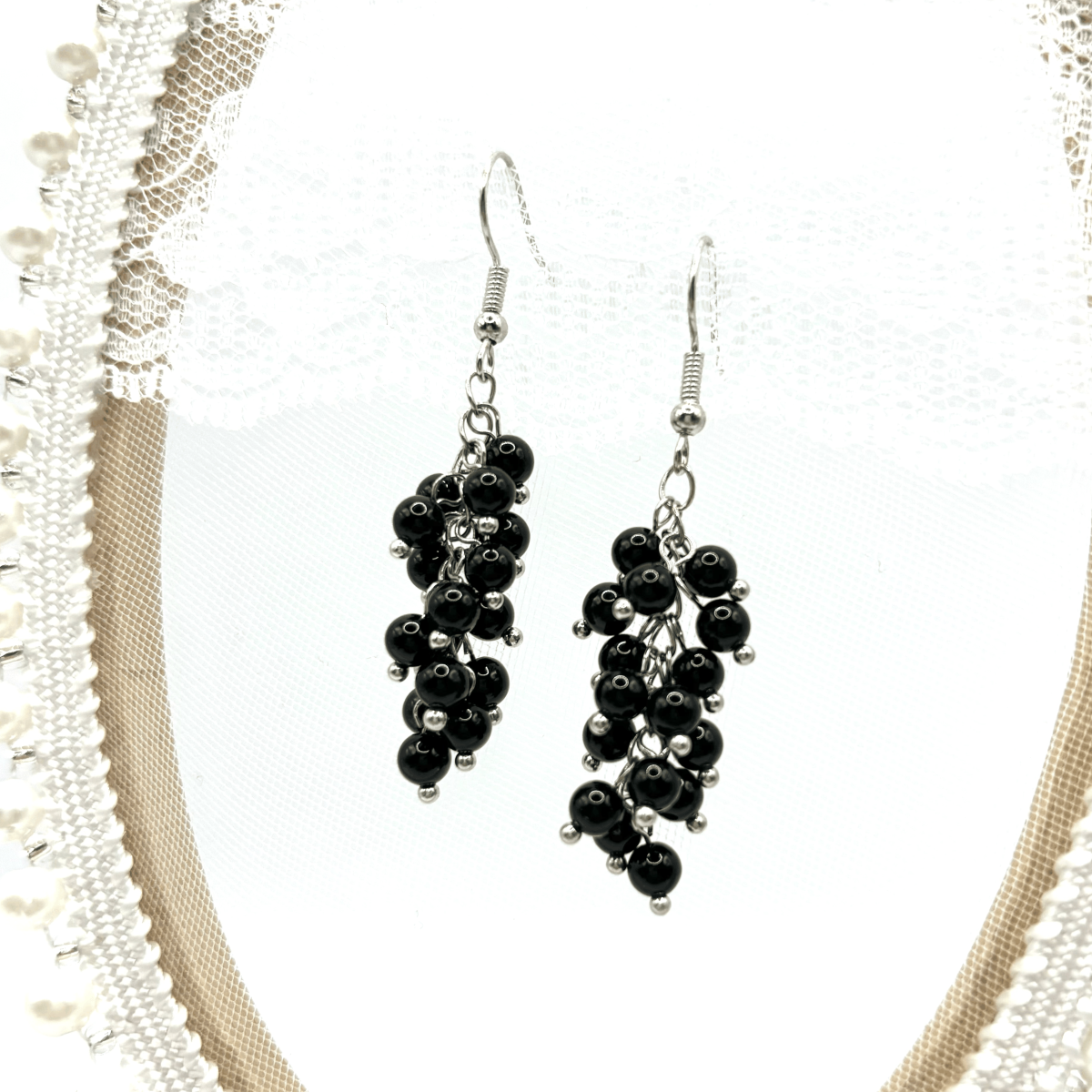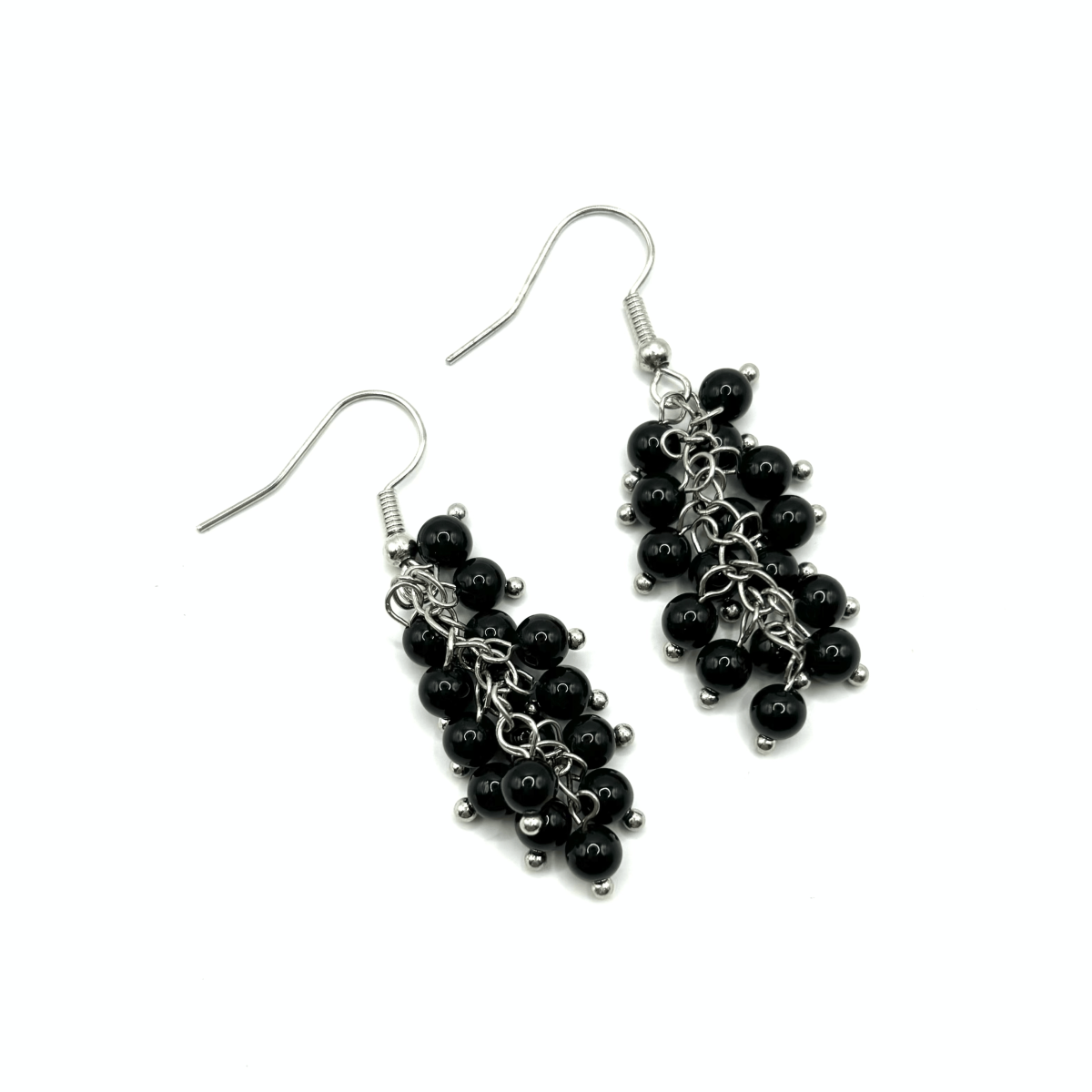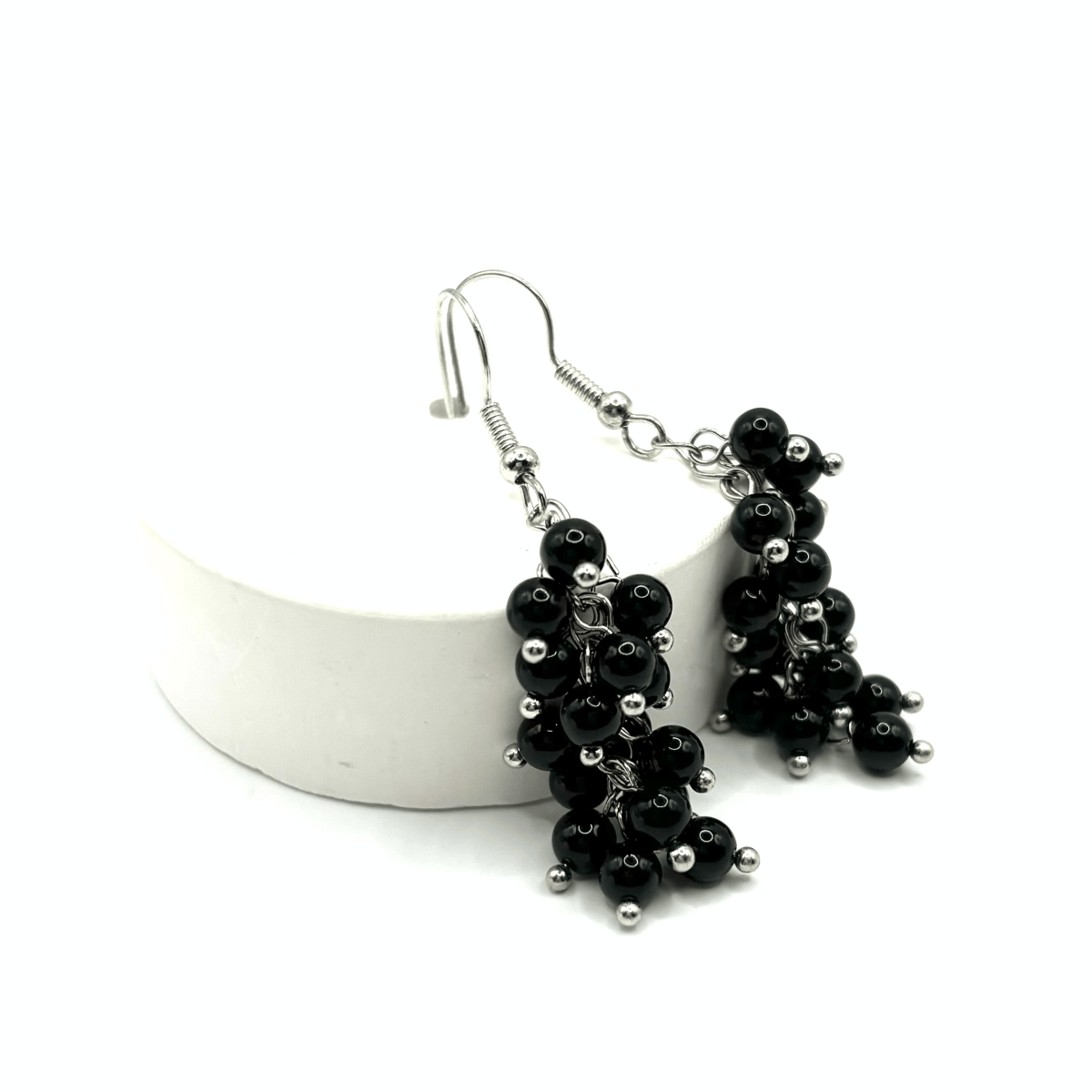 Серьги «Виноград» с натуральным чёрным агатом создают элегантный контраст: глубокий тёмный камень подчёркивает блеск металла и добавляет образу собранности. Лаконичная вертикальная форма делает серьги универсальными — от офиса до вечернего выхода. Высококачественный бижутерный сплав обеспечивает долговечность. Замок-петля удобен, не давит и хорошо держит серьги.