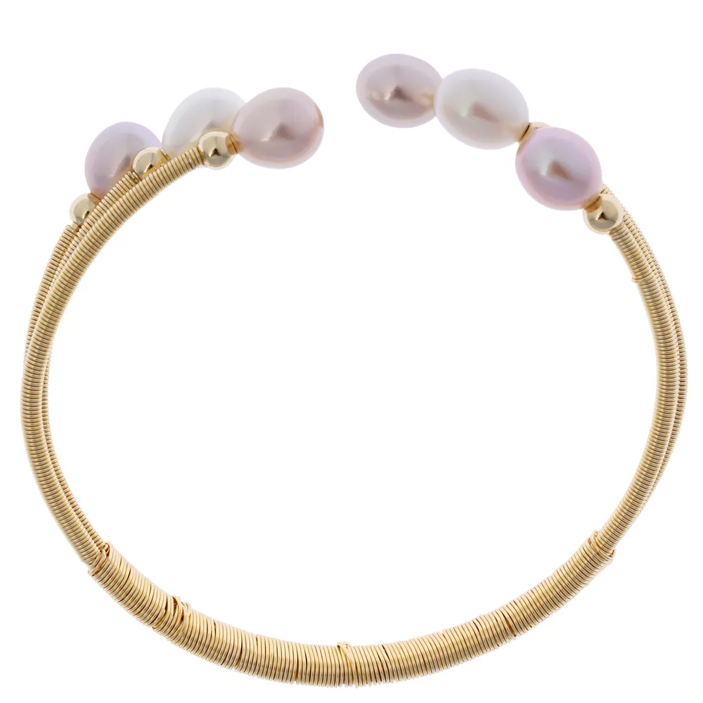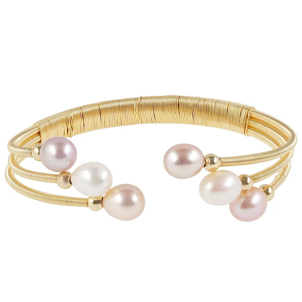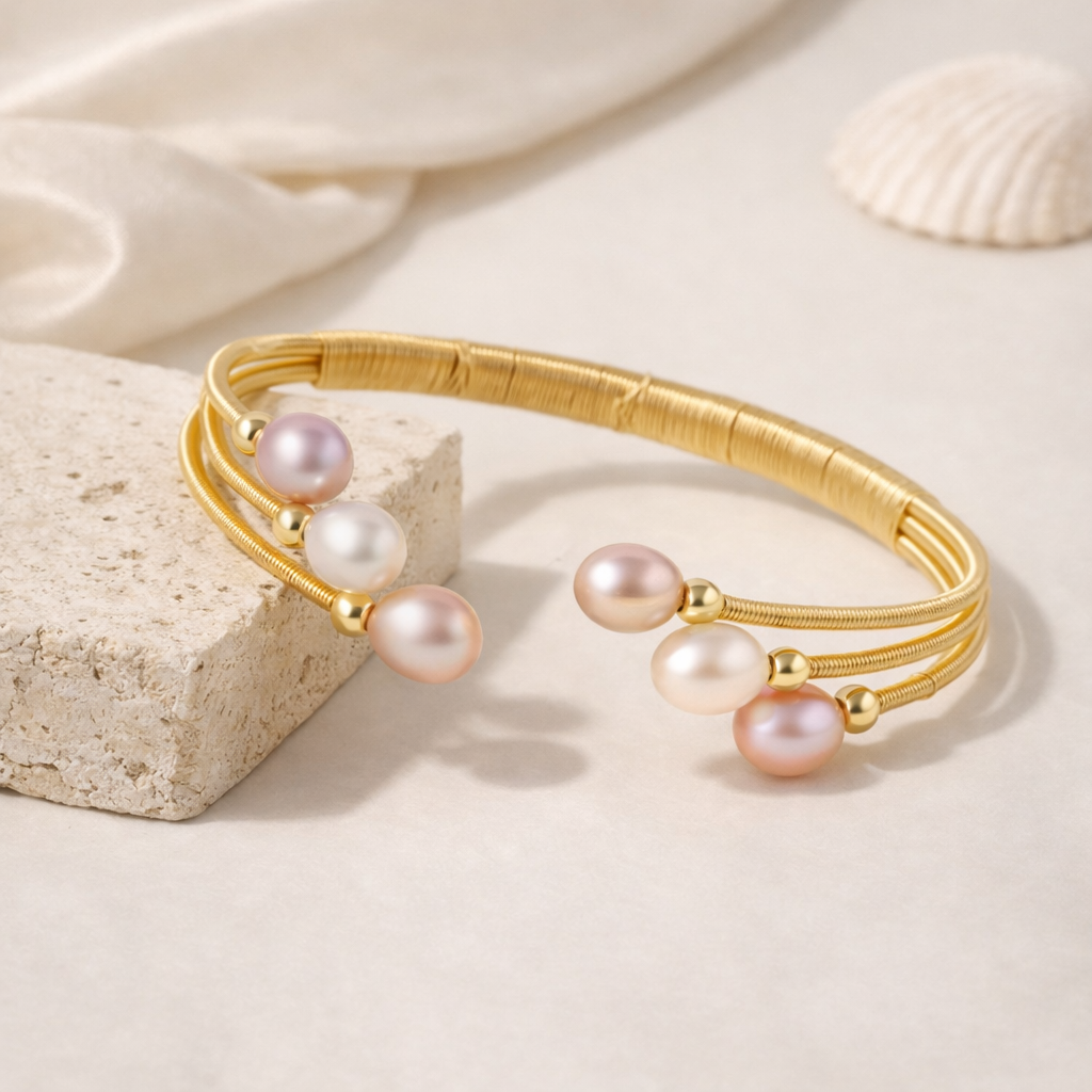 Браслет из коллекции «Жемчуг в золоте» с несколькими крупными жемчужинами розового и белого оттенков выглядит выразительно и при этом остаётся лаконичным. Контраст тёплой позолоты и гладкой перламутровой поверхности делает аксессуар универсальным и к вечернему платью, и к минималистичным образам. Безразмерная основа на проволоке мягко повторяет контур запястья и не сковывает движения.