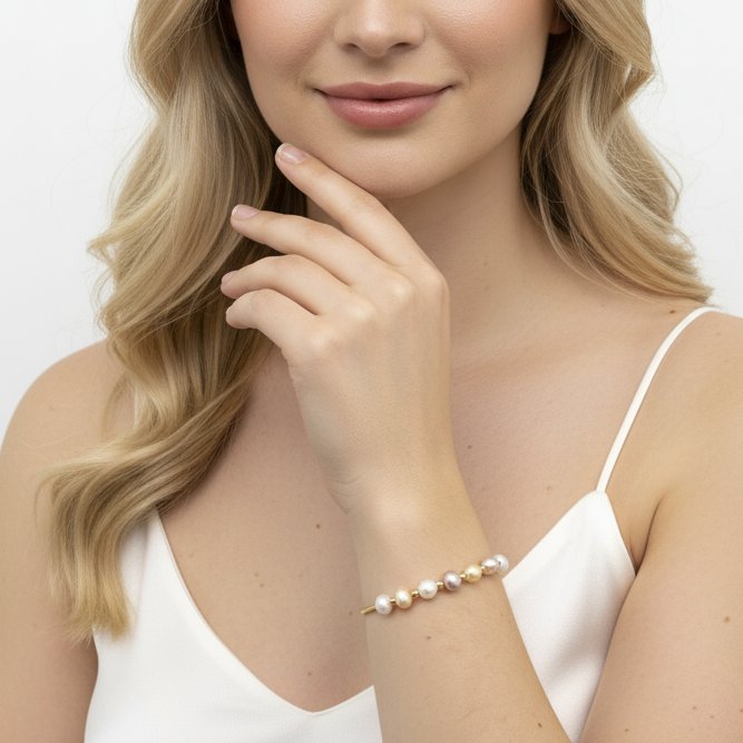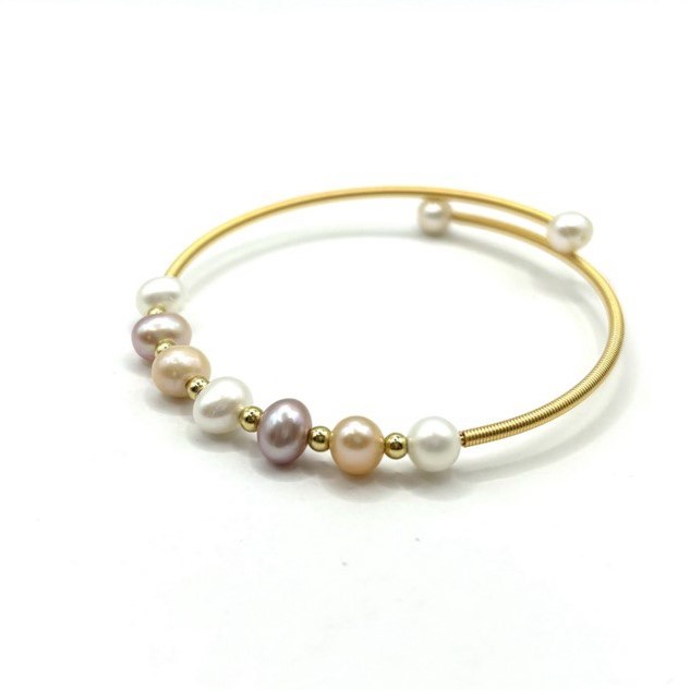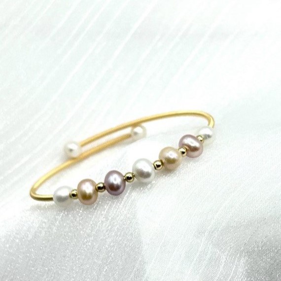 Браслет из коллекции «Жемчуг в золоте» сочетает культивированный пресноводный жемчуг розового, лилового и белого оттенков, создавая плавный цветовой градиент. Позолоченный бижутерный сплав добавляет ощущение тепла и элегантности. Безразмерный фасон на проволоке из бижутерного сплава комфортно садится на запястье и легко комбинируется с другими украшениями. Отличный вариант для многослойных наборов.