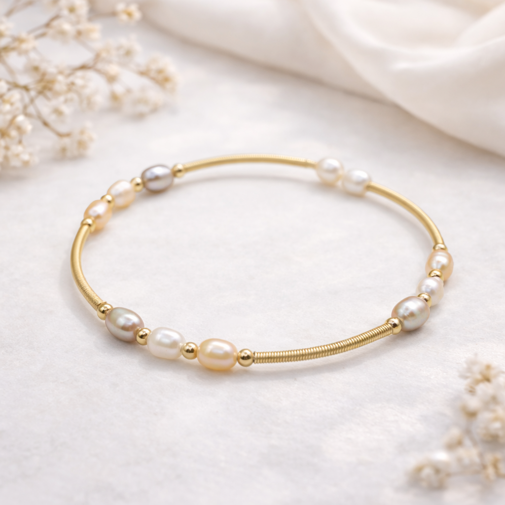 Браслет из коллекции «Жемчуг в золоте» с розовым барочным жемчугом подчёркивает естественную, чуть «живую» фактуру камня — неровные формы делают каждое изделие немного уникальным. Позолоченный бижутерный сплав визуально «подсвечивает» жемчуг и добавляет украшению тепла. Безразмерный фасон браслета на проволоке из высококачественного бижутерного сплава комфортно облегает запястье и подходит для повседневной носки.