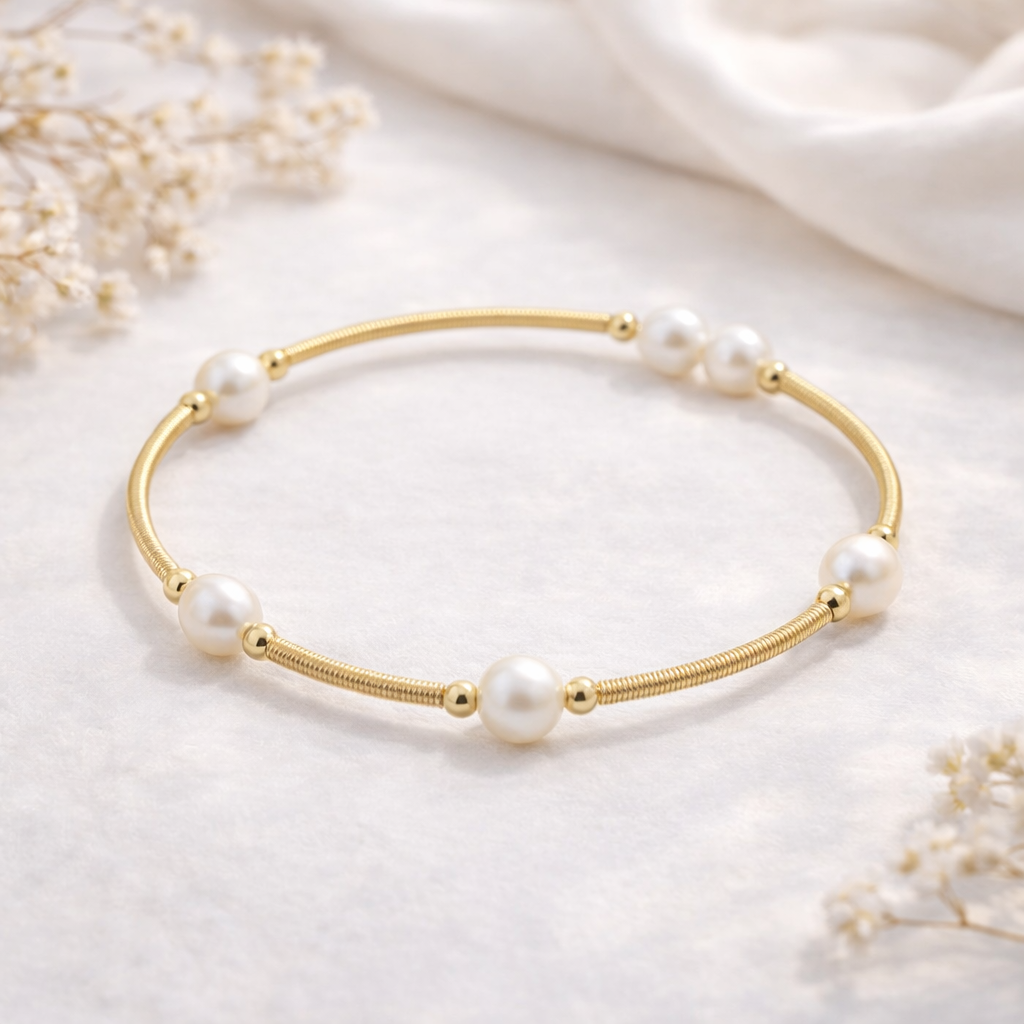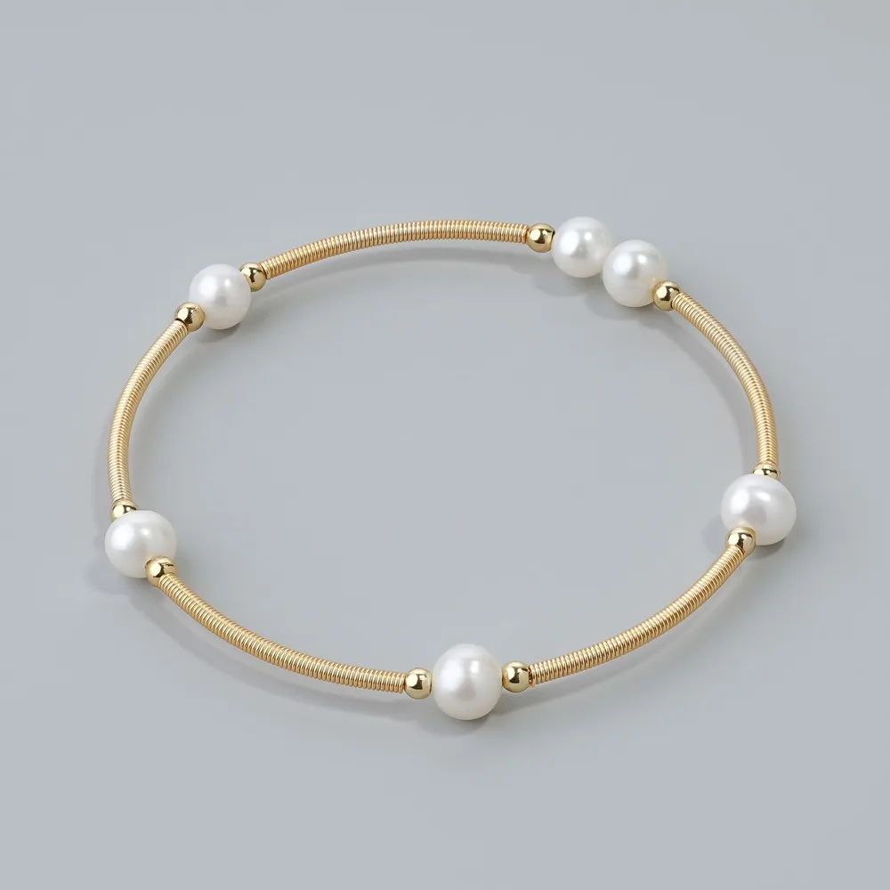 Браслет «Жемчуг в золоте» с белым барочным пресноводным жемчугом акцентирует индивидуальность за счёт неровной формы бусин: лёгкие изгибы и неровности создают живую игру света. Тёплая позолота подчёркивает перламутровый блеск и делает украшение универсальным — от базового трикотажа до лаконичных платьев. Безразмерная модель браслета на проволоке из высококачественного бижутерного сплава удобно сидит и не требует регулировки.