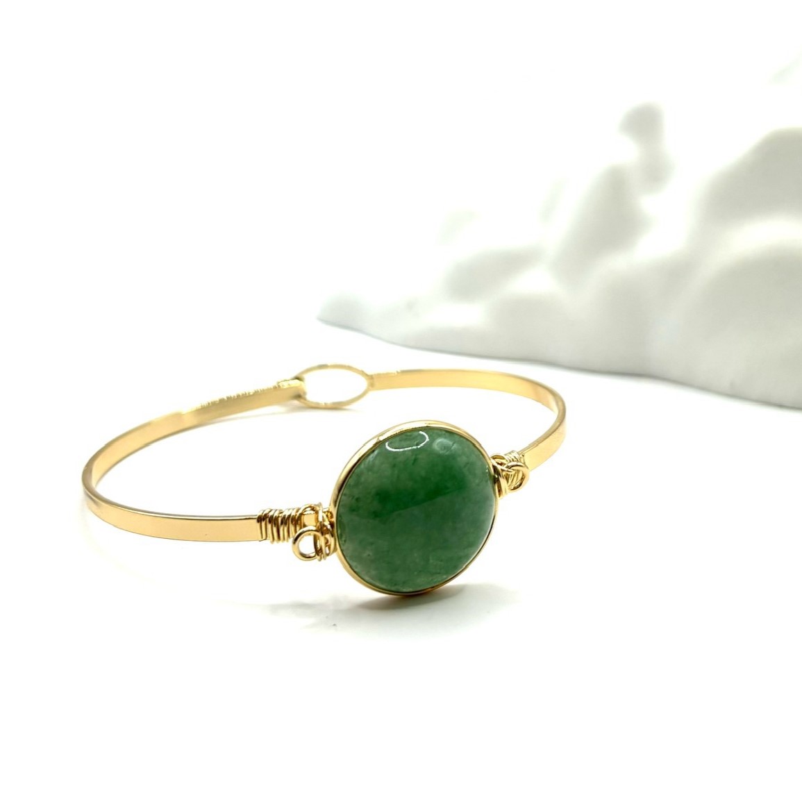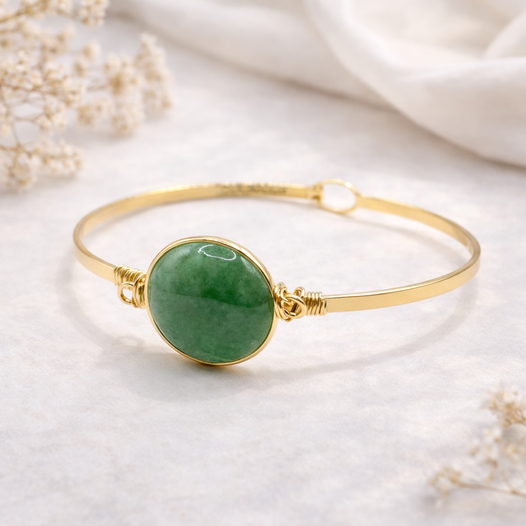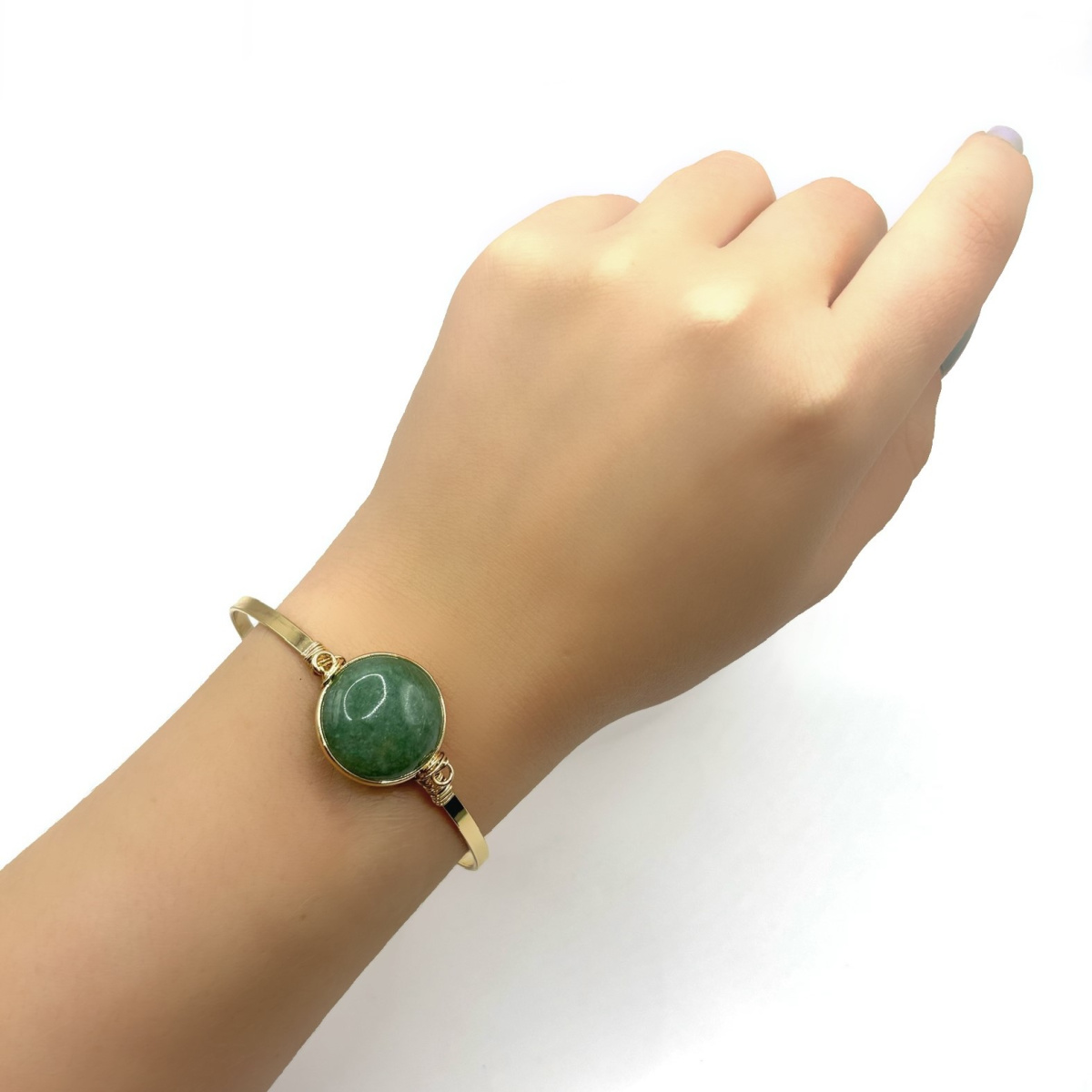 Жёсткий браслет с натуральным зелёным авантюрином сочетает минималистичную форму и выразительный натуральный зеленый камень. Круглая вставка смотрится аккуратным цветовым акцентом, а позолоченный бижутерный сплав добавляет браслету благородное звучание. Размер 17–20 удобно садится на запястье, крючковый замок легко застёгивается и надёжно фиксирует украшение в течение дня.