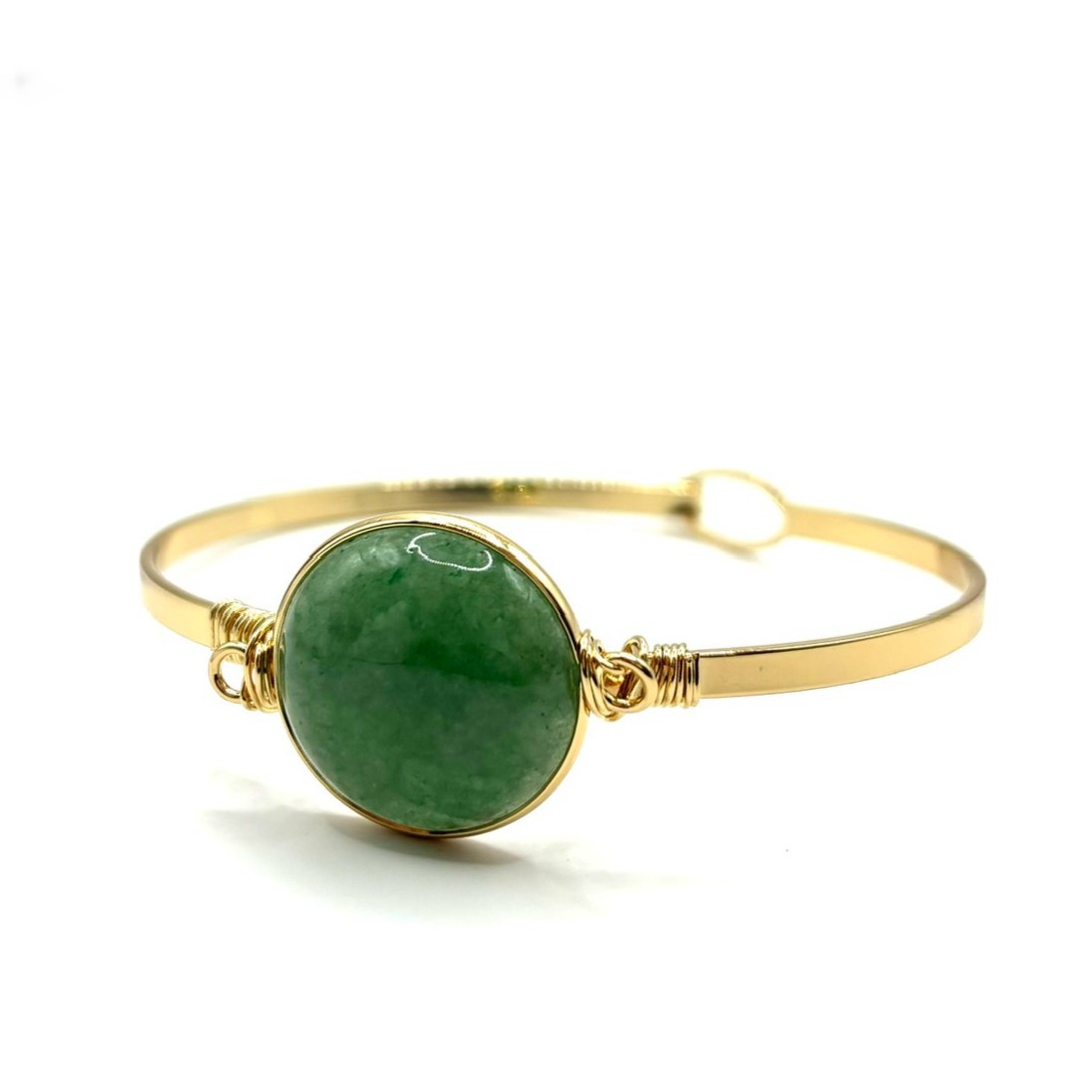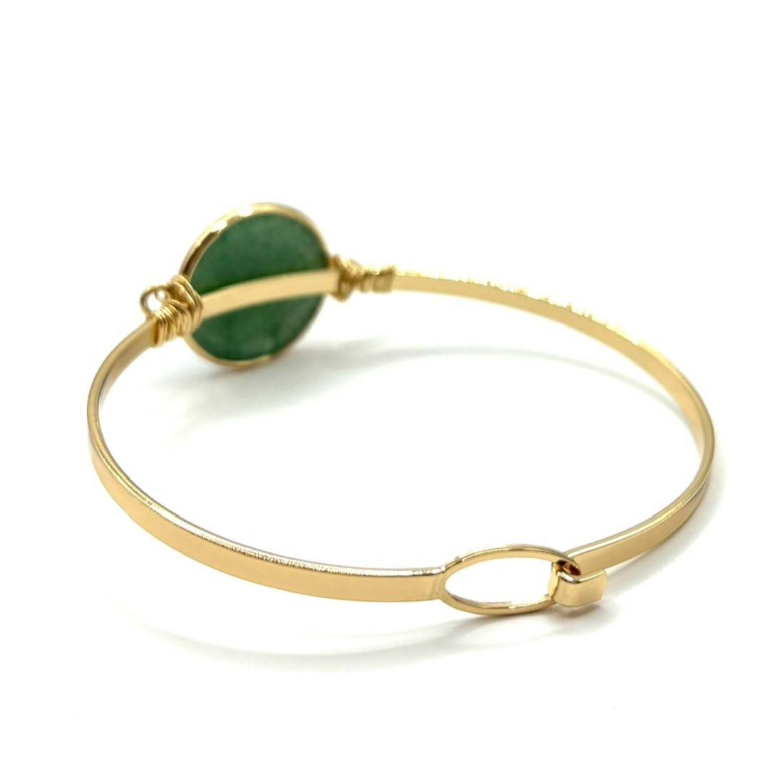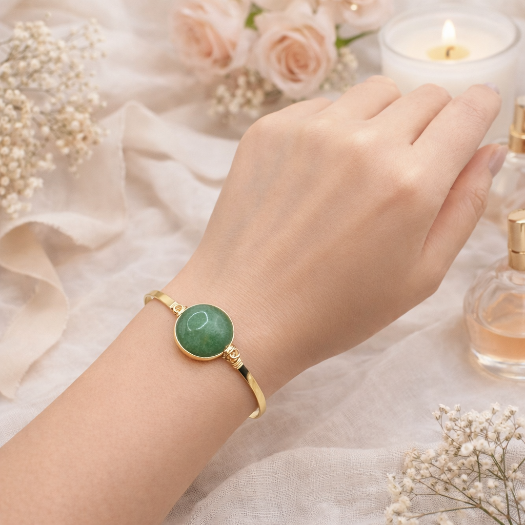 Жёсткий браслет с натуральным зелёным авантюрином сочетает минималистичную форму и выразительный натуральный зеленый камень. Круглая вставка смотрится аккуратным цветовым акцентом, а позолоченный бижутерный сплав добавляет браслету благородное звучание. Размер 17–20 удобно садится на запястье, крючковый замок легко застёгивается и надёжно фиксирует украшение в течение дня.