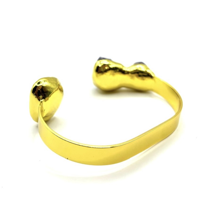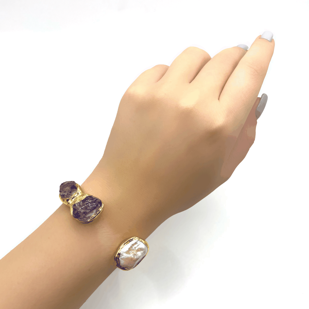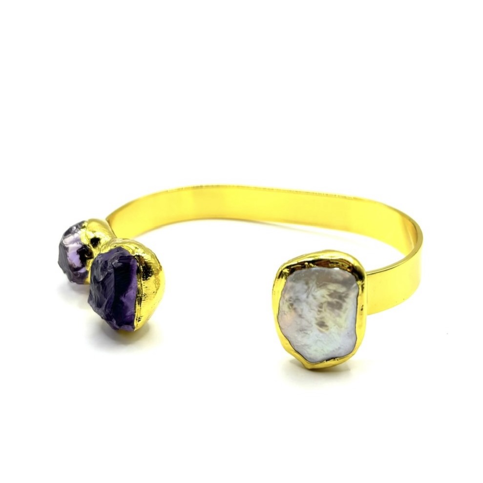 Жёсткий браслет ДИНОСА с необработанным аметистом и речным жемчугом создаёт выразительный, но аккуратный акцент на запястье. Неровные кристаллы аметиста и натуральный жемчуг смотрятся живо и объемно, а тёплая позолота подчёркивает их оттенки. Жёсткая основа удобно садится на запястье 17–20 см и легко надевается без замка, оставаясь комфортной в течение дня. Такое украшение органично дополняет как повседневные, так и более нарядные образы.