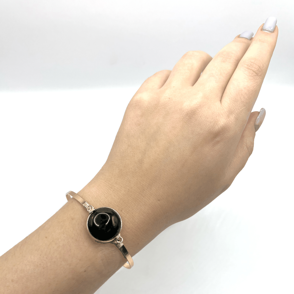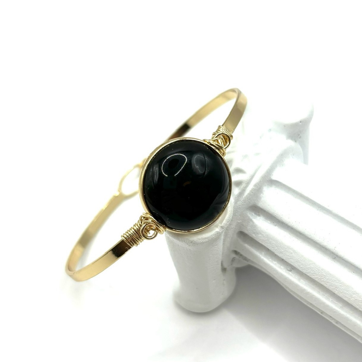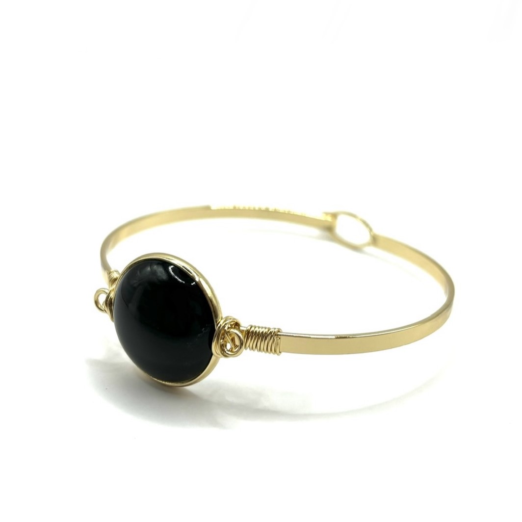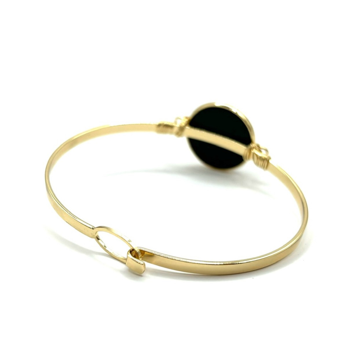 Жёсткий браслет ДИНОСА с чёрным агатом — лаконичный аксессуар, который легко вписывается и в повседневные, и в вечерние комплекты. Крупный круглый камень подчёркивает запястье и добавляет образу элегантности, а позолоченный бижутерный сплав придаёт браслету благородный блеск. Удобный крючковый замок надёжно фиксирует украшение на размере 17–20 см. Браслет хорошо сочетается с часами и минималистичными кольцами в тёплом металле.