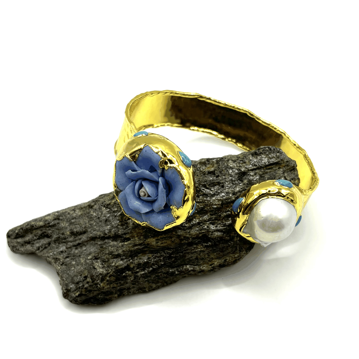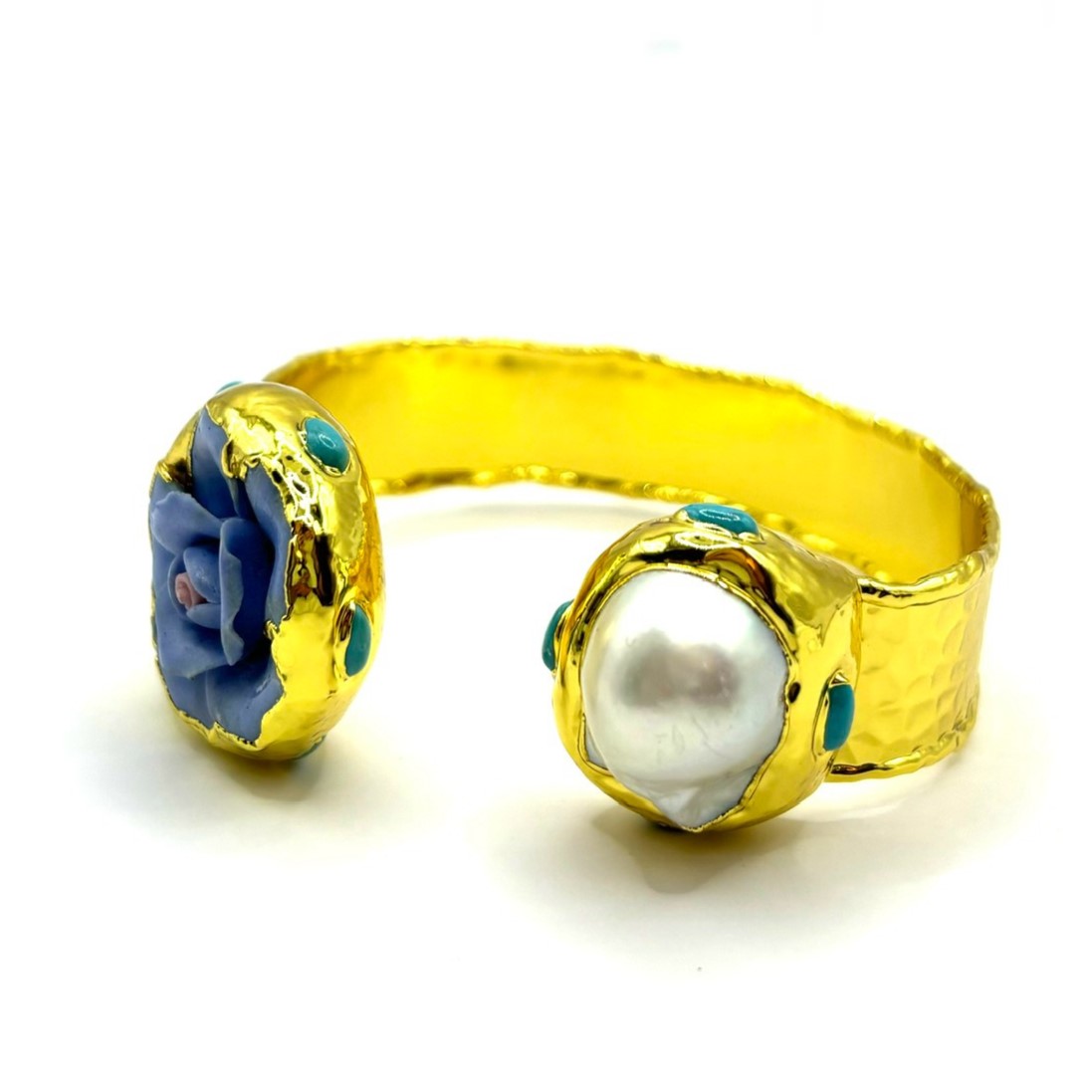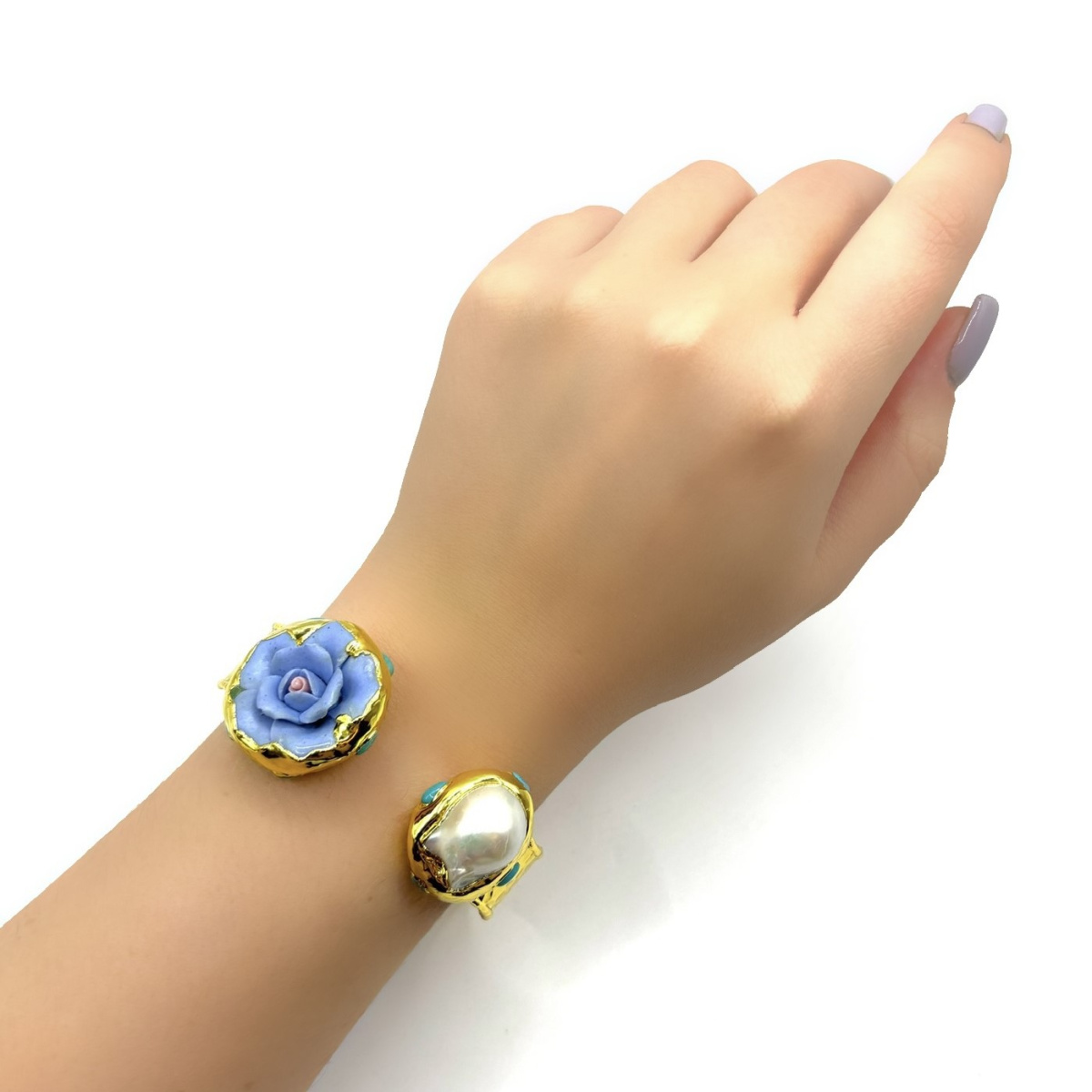 Жёсткий браслет ДИНОСА с цветком и барочным жемчугом выделяется сложным сочетанием фактур и оттенков. Объёмный синий цветок из полимерной глины, бирюзовые элементы и неровный барочный жемчуг создают заметный, но продуманный акцент. Позолоченная основа заставляет цвета звучать ярче. Жёсткий браслет подстраивается под запястье 17–20 см и не требует застёжки. Идеален для тех, кто любит необычные детали в образе и авторский характер украшений.
