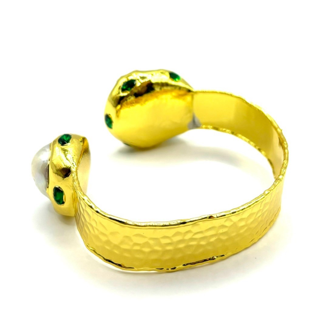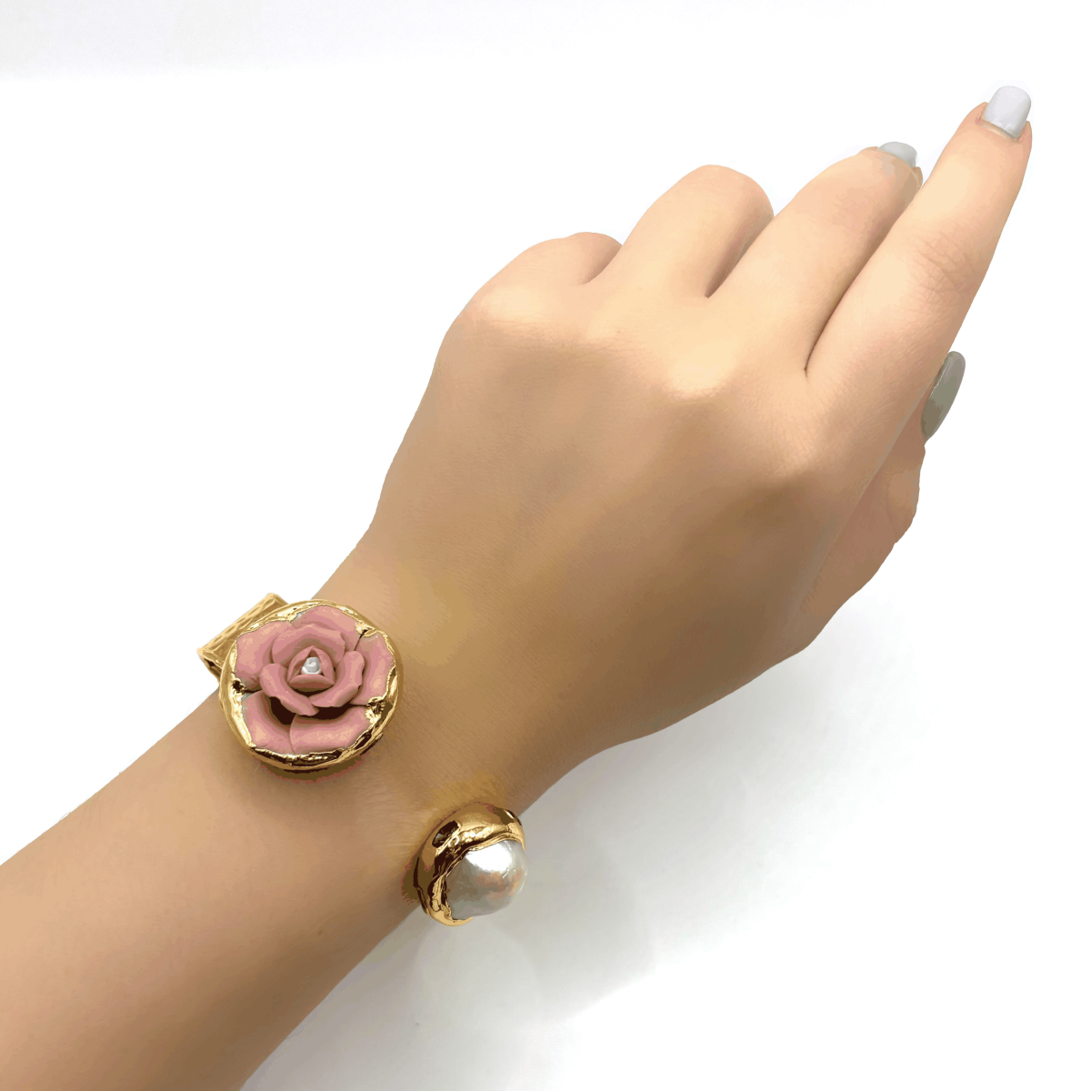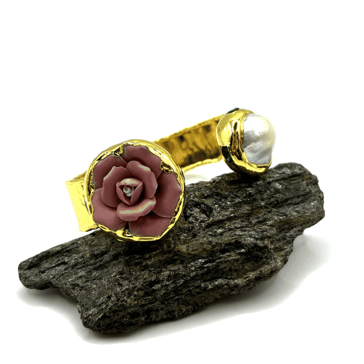 Жёсткий браслет ДИНОСА с розовым цветком, барочным жемчугом и кварцем создаёт нежный, но выразительный акцент. Пастельный цветок из полимерной глины, мягкий блеск жемчуга и полупрозрачные вставки кварца поддержаны тёплой позолотой основы. Неровные формы камней делают каждый браслет немного уникальным. Жёсткая конструкция подходит на запястье 17–20 см и удобно надевается без замка. Украшение особенно гармонично смотрится с лёгкими платьями и блузами.