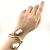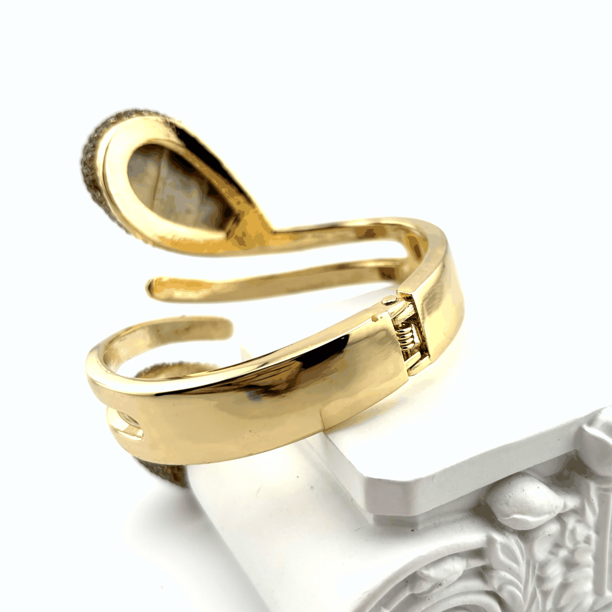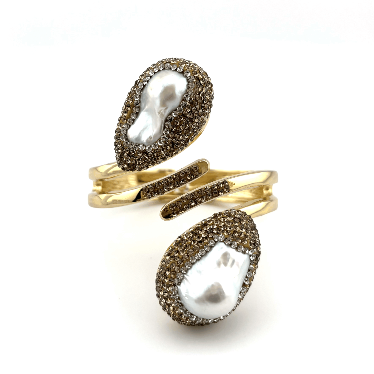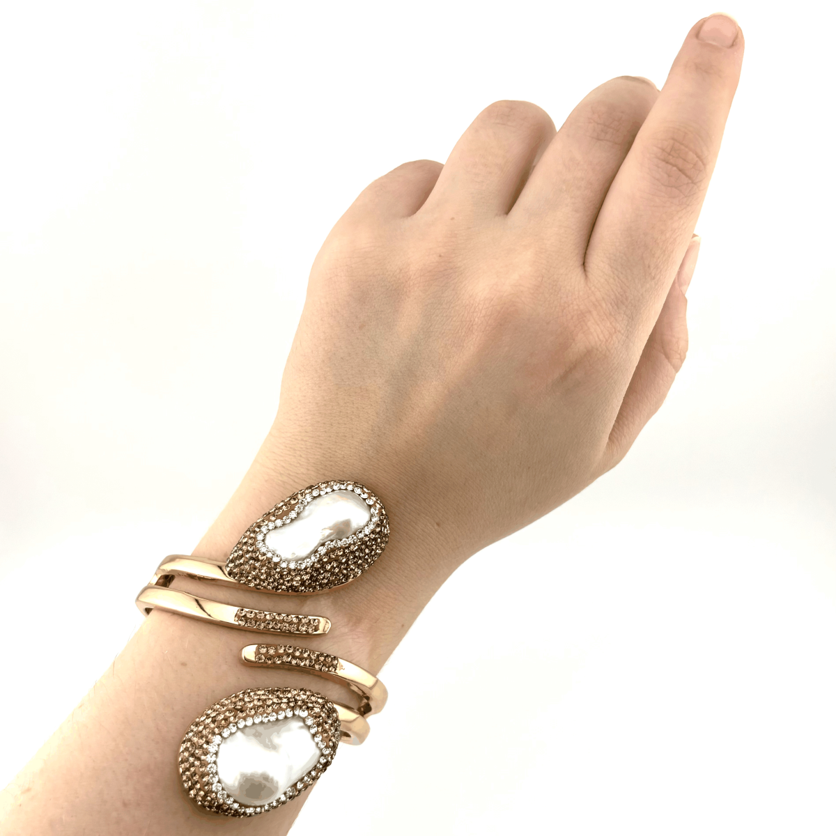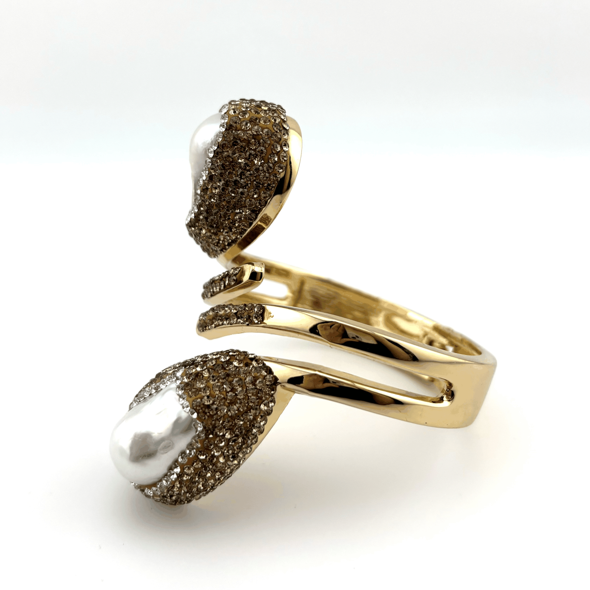 Жёсткий браслет ДИНОСА с речным жемчугом и кристаллами добавляет образу мягкого сияния. Небольшие неровные жемчужины и аккуратные светлые вставки создают сложную фактуру, а позолоченная основа придаёт браслету тёплый благородный оттенок. Безразмерная шарнирная конструкция удобно раскрывается, плотно облегает запястье и подходит к разным вариантам посадки на руке. Украшение станет удачным акцентом как к строгой рубашке, так и к вечерному платью.
