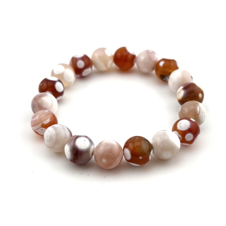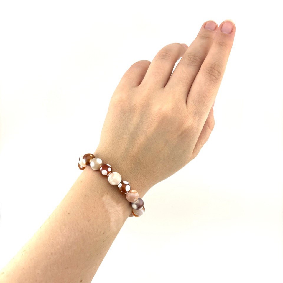 Браслет ДИНОСА с агатом в молочно-оранжевой гамме привлекает вниманием мягким природным контрастом. Гладкие круглые камни комфортно сидят на руке благодаря прочной эластичной нити. Украшение подходит как для повседневных образов, так и для более нежных романтичных сочетаний. Добавляет образу тепла и естественности.