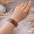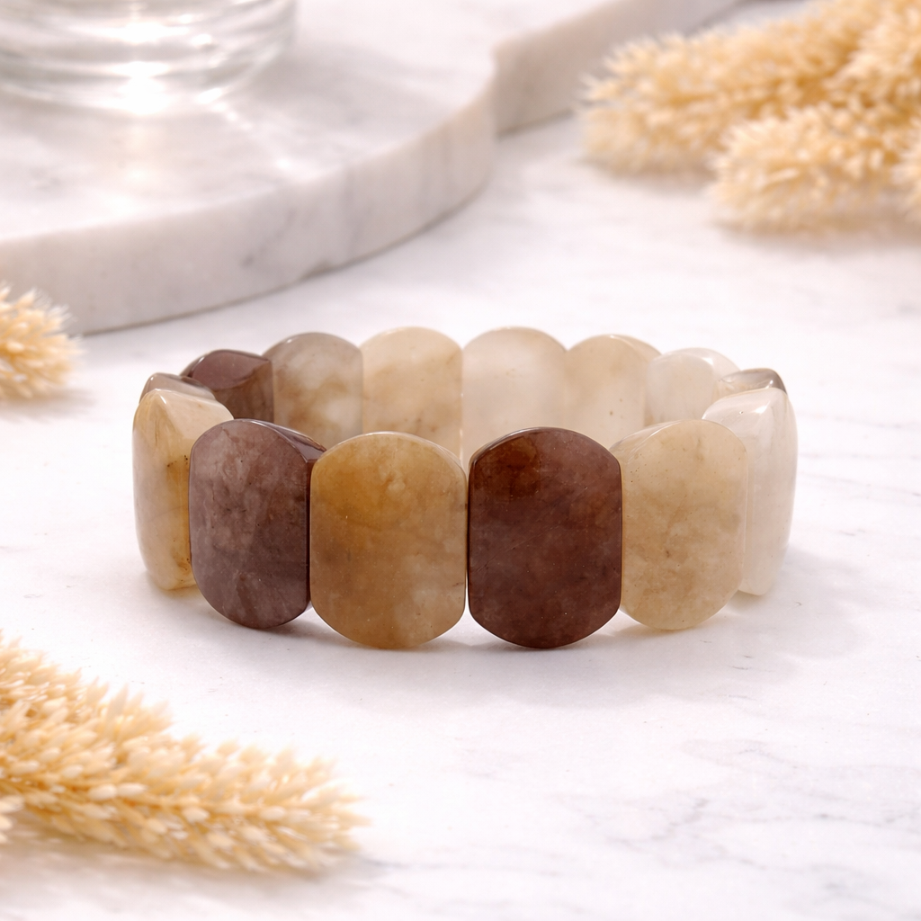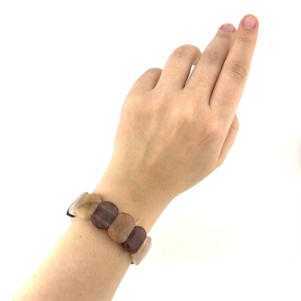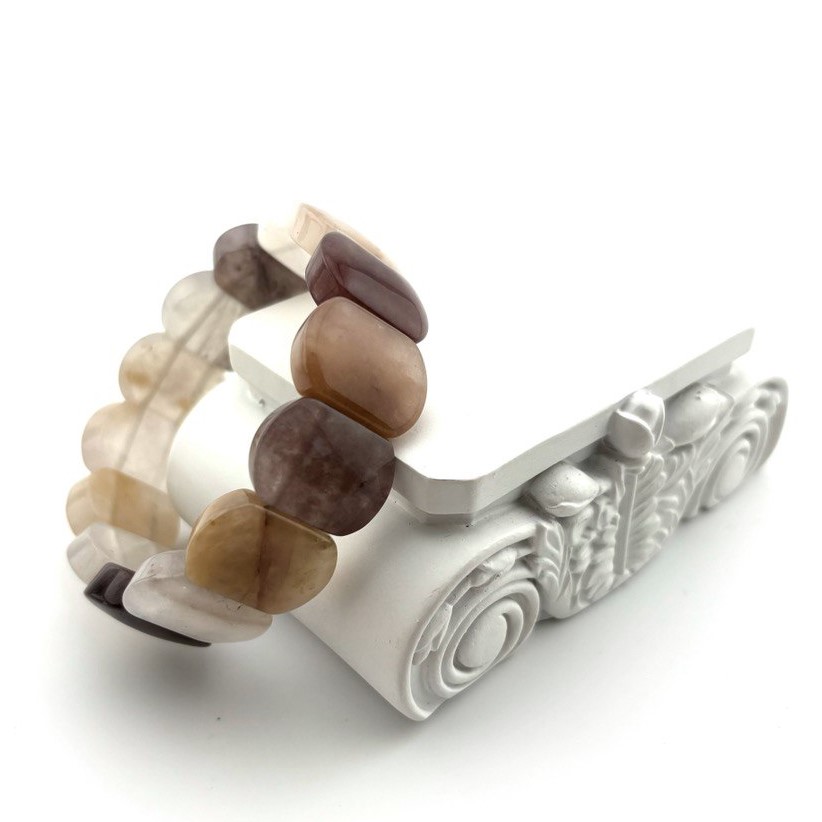 Браслет ДИНОСА с крупным агатом выполнен в спокойных молочных и кофейных оттенках. Гладкие камни красиво смотрятся на запястье и создают гармоничный натуральный акцент. Эластичная основа обеспечивает удобную посадку. Универсальная расцветка делает браслет подходящим для любых образов — от офисных до расслабленных.