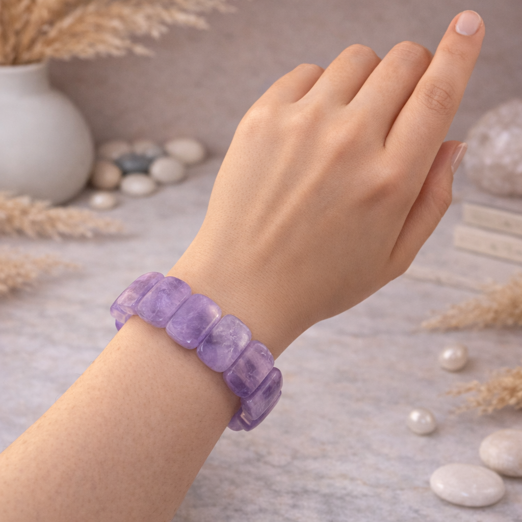 Браслет ДИНОСА с аметистом состоит из крупных гладких камней лавандового оттенка. Натуральный аметист мягко играет на свету, создавая утончённый цветовой акцент. Эластичная резинка позволяет надевать браслет за секунду и носить с комфортом весь день. Украшение хорошо сочетается с минималистичными изделиями и светлой одеждой.