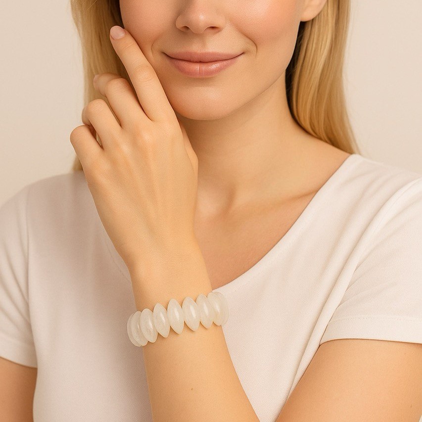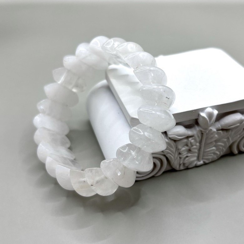 Браслет с горным хрусталем выделяется прозрачной белизной и лёгкой текстурностью камня. Продолговатые гладкие вставки создают чистый, свежий акцент, который красиво смотрится на коже. Эластичная резинка обеспечивает максимальный комфорт при надевании и носке. Такой браслет подходит тем, кто любит светлые, воздушные украшения и ценит натуральную эстетику.