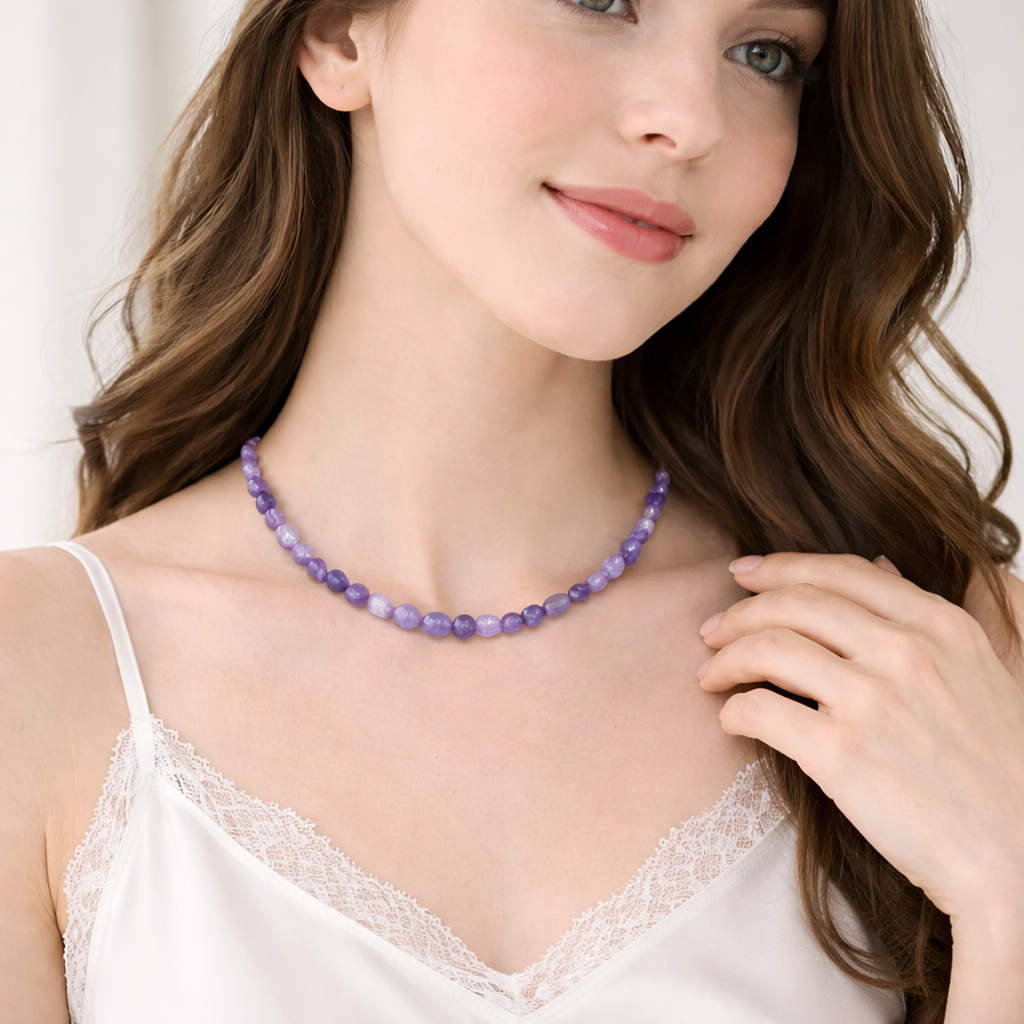 Бусы из натурального аметиста отличаются выразительным фиолетовым цветом, который играет от светлой лаванды до глубокого сиреневого. Гладкие камни 6×8 мм создают мягкую струящуюся линию. Замок карабин из высококачественного бижутерного сплава — удобный, устойчивый к износу. Идеальны для тех, кто любит украшения с характером и спокойной энергетикой.