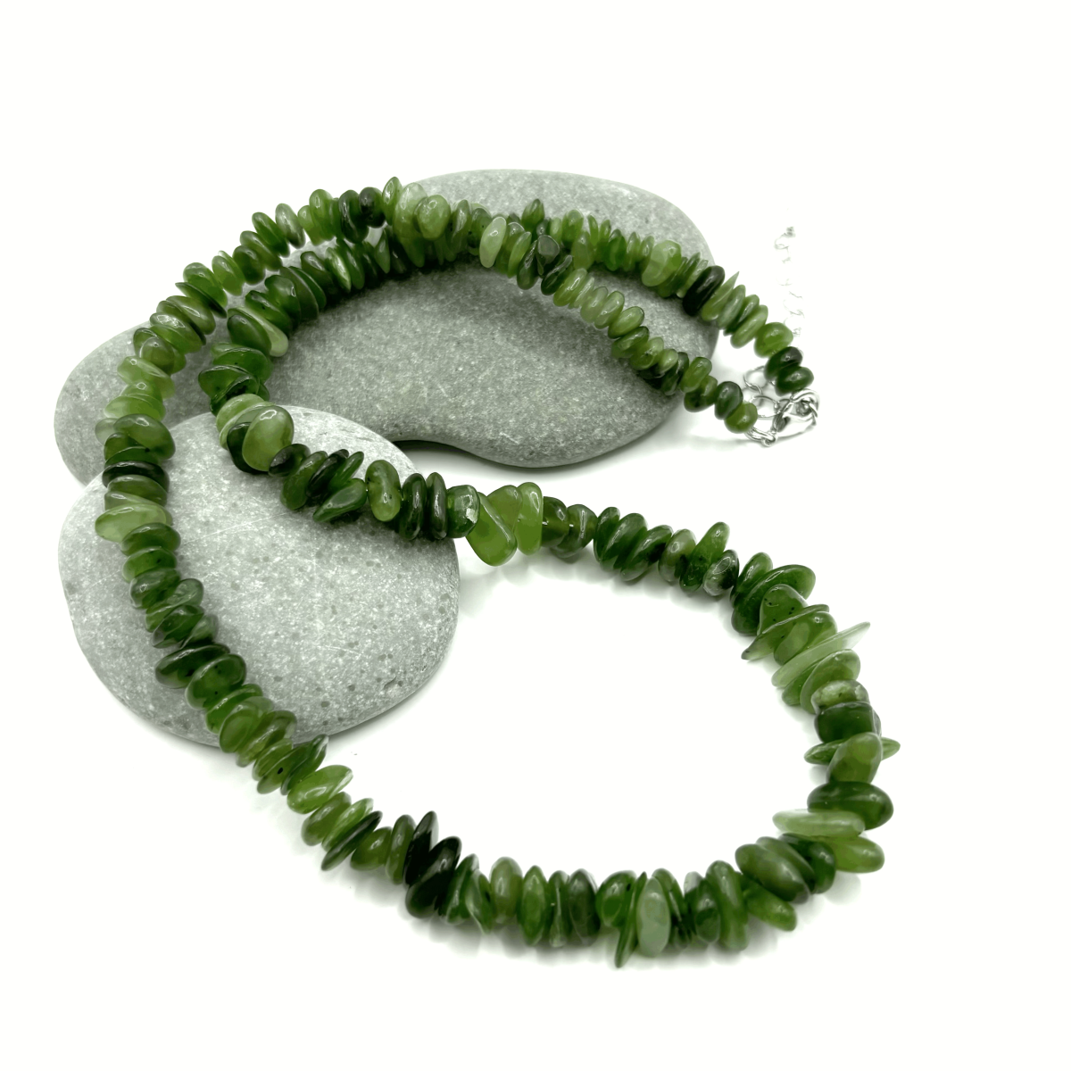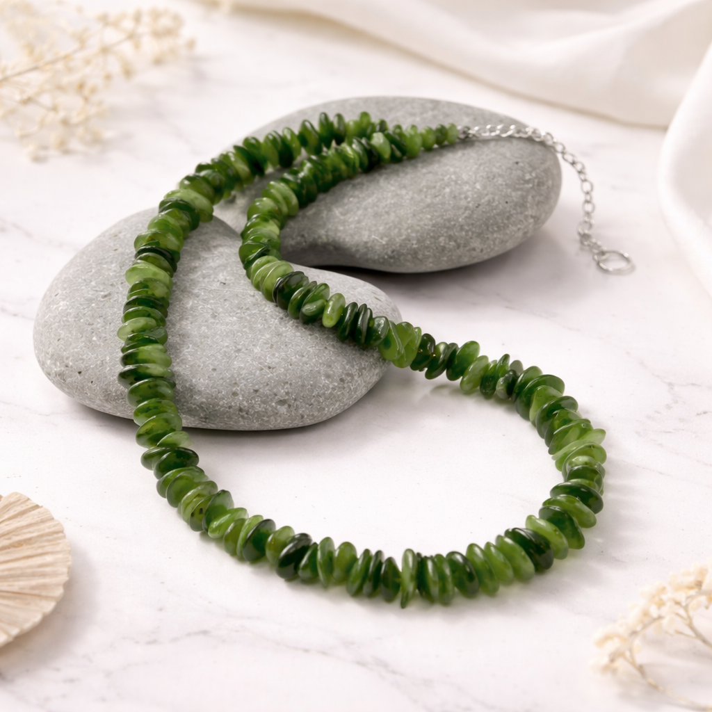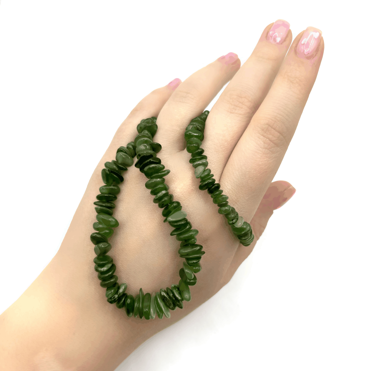 Бусы с жадеитом в свежем зелёном оттенке создают натуральный и свежий акцент. Крошка камня даёт мягкую, природную текстуру, а оттенки варьируются от светлого нефритового до более глубоких зелёных тонов. Карабин обеспечивает удобство ношения. Универсальный вариант для тех, кто любит природные, гармоничные украшения.