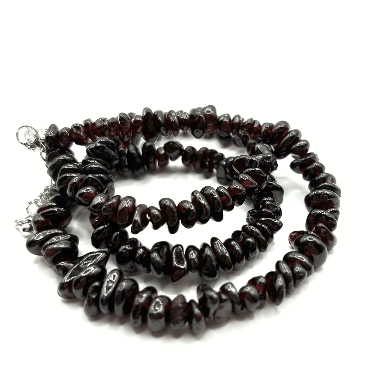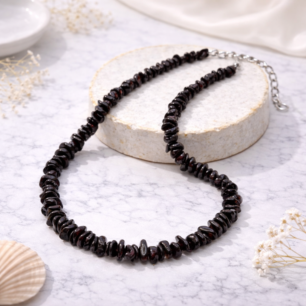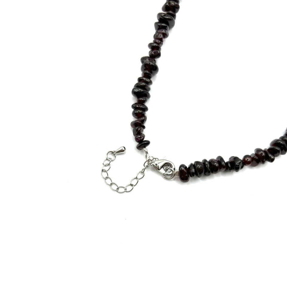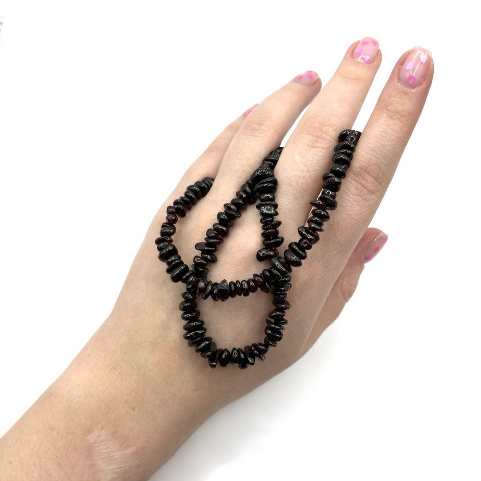 Бусы с натуральным гранатом придают образу насыщенный винный акцент: гладкие округлые элементы камня создают глубокий блеск и элегантное сияние. Гранат известен своей плотностью, тёмной драматичностью и красивыми рубиновыми переливами. Карабин прочный и удобный в носке. Украшение подходит для вечерних и классических образов.