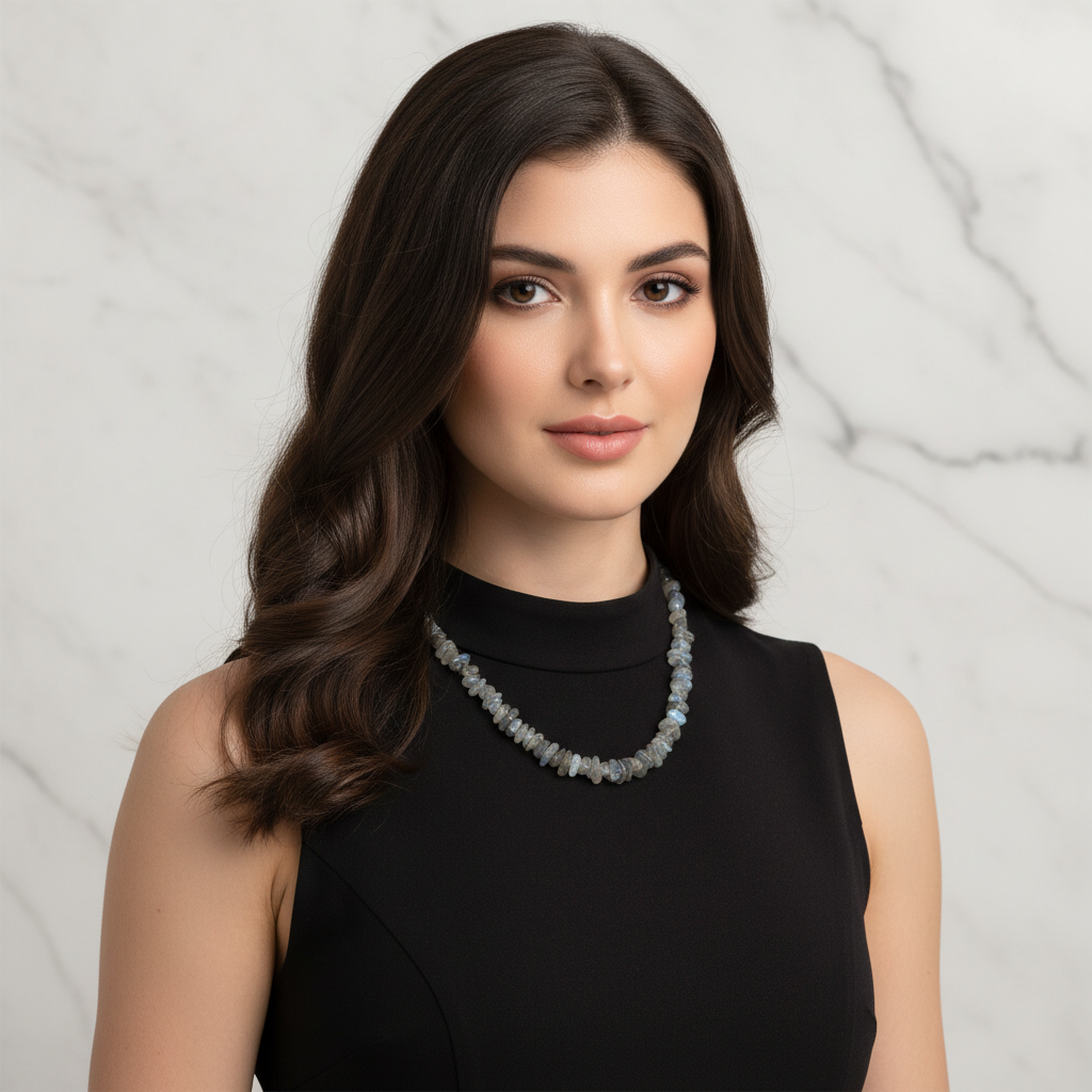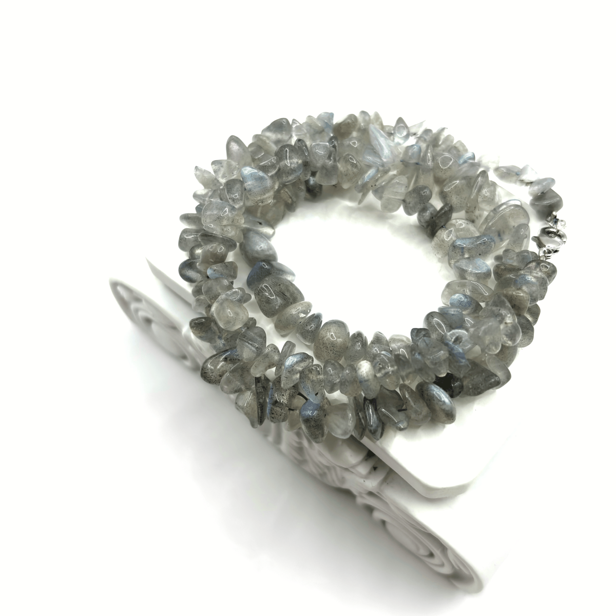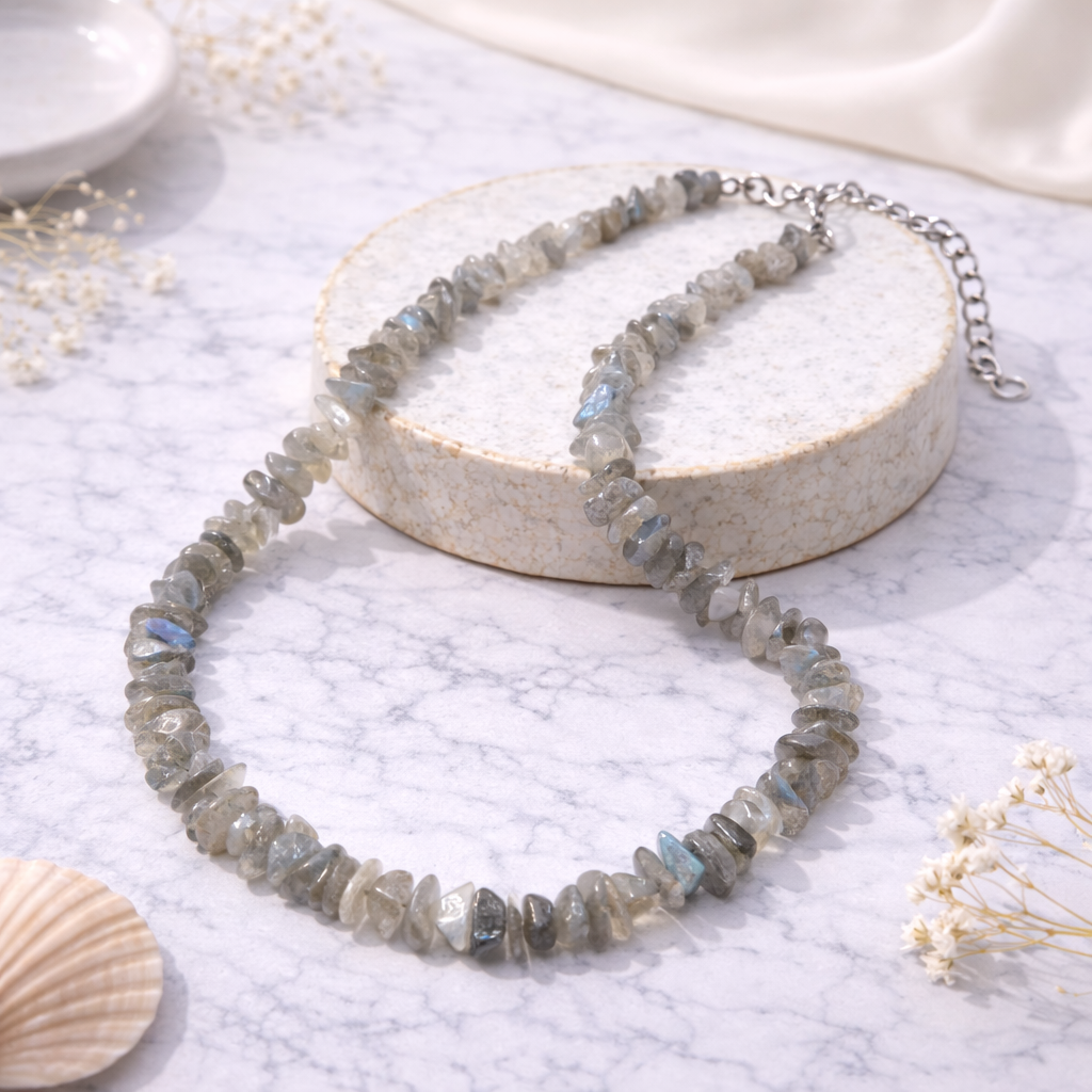 Бусы с натуральным лабрадоритом впечатляют мистическими переливами: серо-дымчатая крошка вспыхивает голубыми и зелёными отблесками при каждом движении. Лабрадорит знаменит эффектом иризации, делающим каждый камень уникальным. Замок карабин выполнен из высококачественного бижутерного сплава, а цепочка позволяет регулировать длину. Украшение подходит для стильных строгих и современных образов.