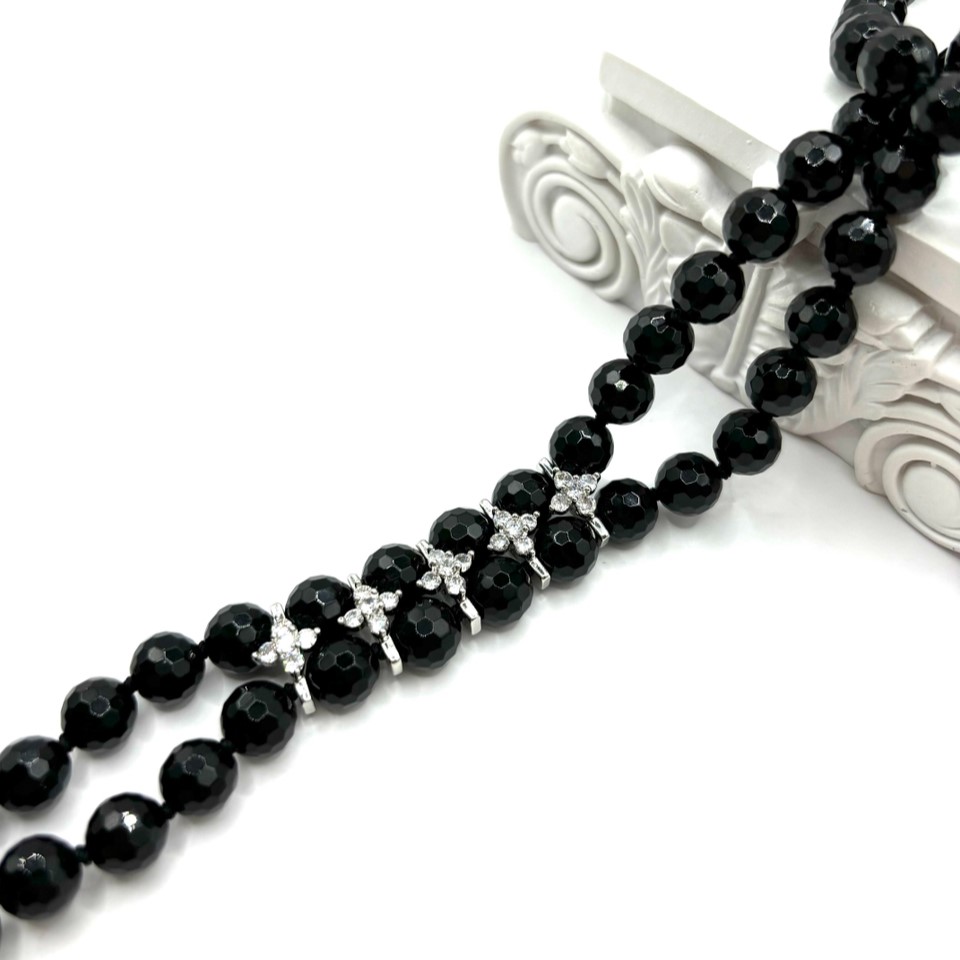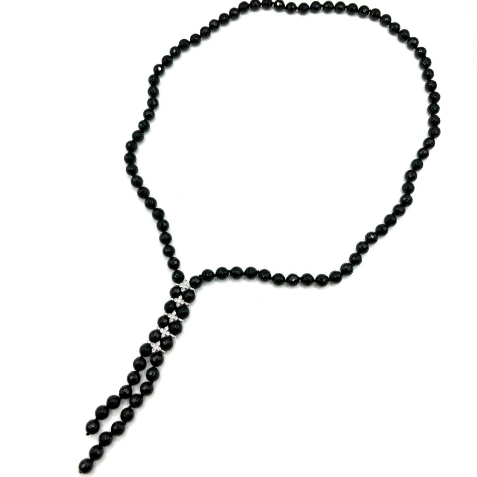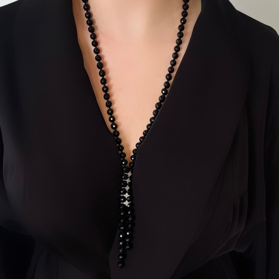 Бусы-галстук с черным агатом сочетают выразительную фактуру натурального камня и блеск небольших фианитов, создавая насыщенный контраст и эффектный акцент в образе. Агат отличается плотным глубоким цветом, а гранёная поверхность делает украшение более динамичным. Фурнитура выполнена из высококачественного бижутерного сплава, изделие легко носить и сочетать с разными стилями.