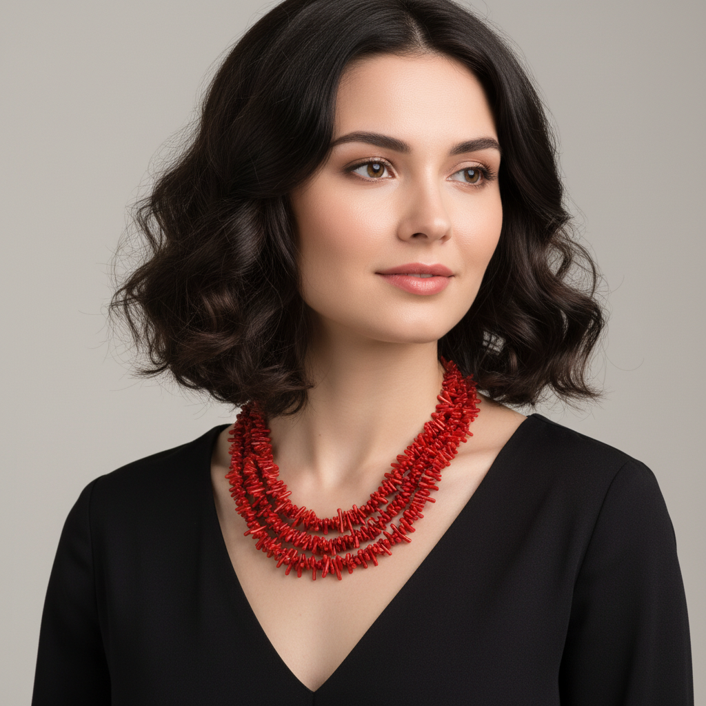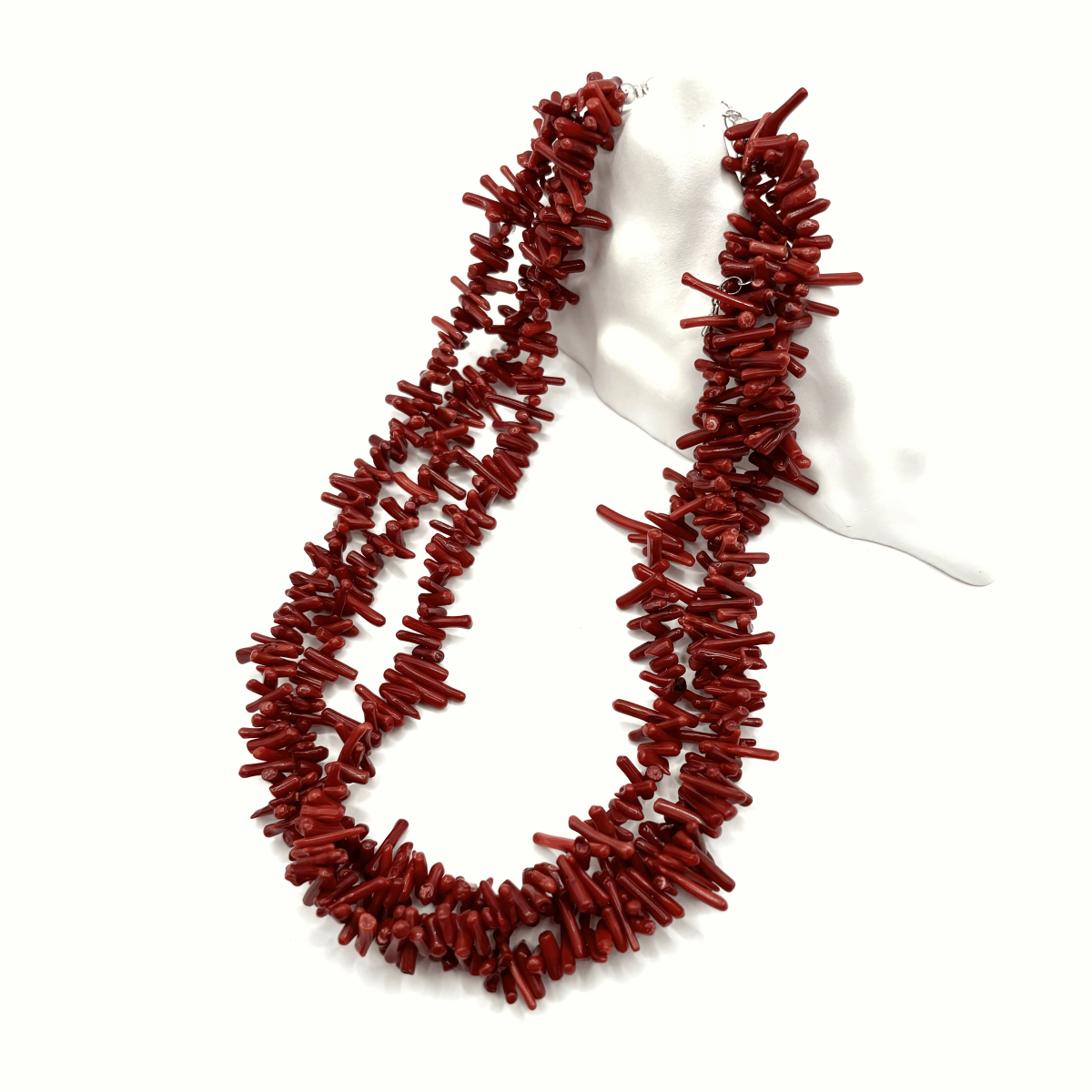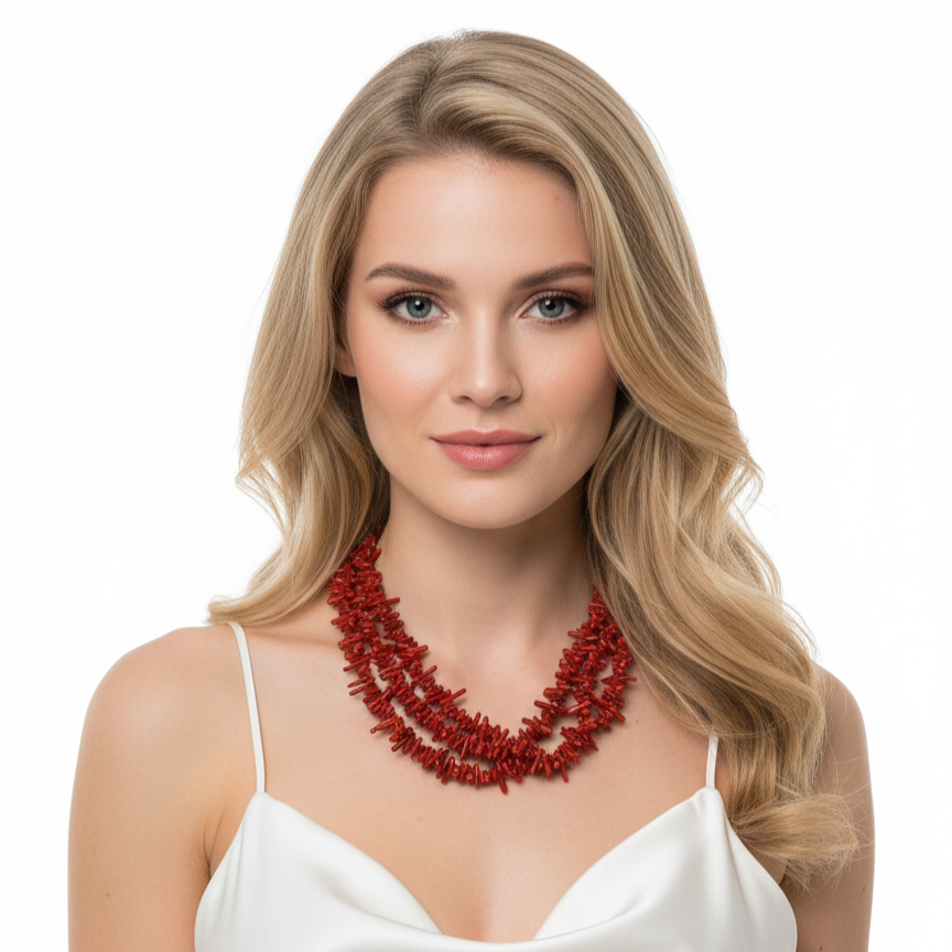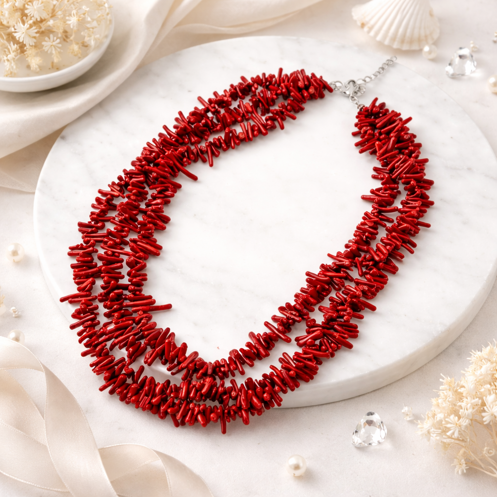 Коралловые бусы из трёх нитей привлекают насыщенным окрашенным оттенком и природной фактурой камня: необработанные элементы создают объём и богатую текстуру. Глубокий яркий коралловый цвет добавляет тепла и выразительности любому образу. Фурнитура выполнена из высококачественного бижутерного сплава, изделие удобно сидит и остаётся долговечным при ежедневном ношении.