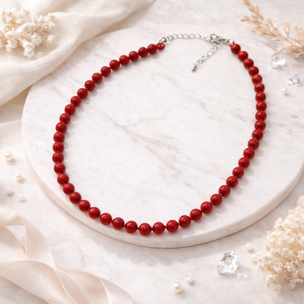 Коралловые бусы окрашены в глубокий вишнёво-красный оттенок и выделяются гладкой поверхностью камня и классической круглой формой. Цвет добавляет насыщенности и подчёркивает женственность. Бусы подходят как к строгим, так и к ярким образам. Фурнитура выполнена из высококачественного бижутерного сплава, что обеспечивает комфорт и долговечность изделия.