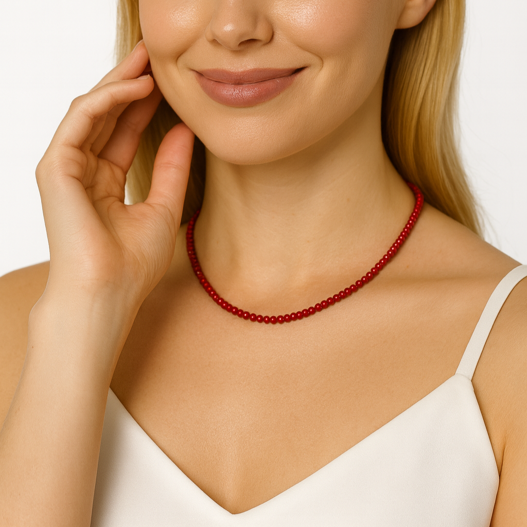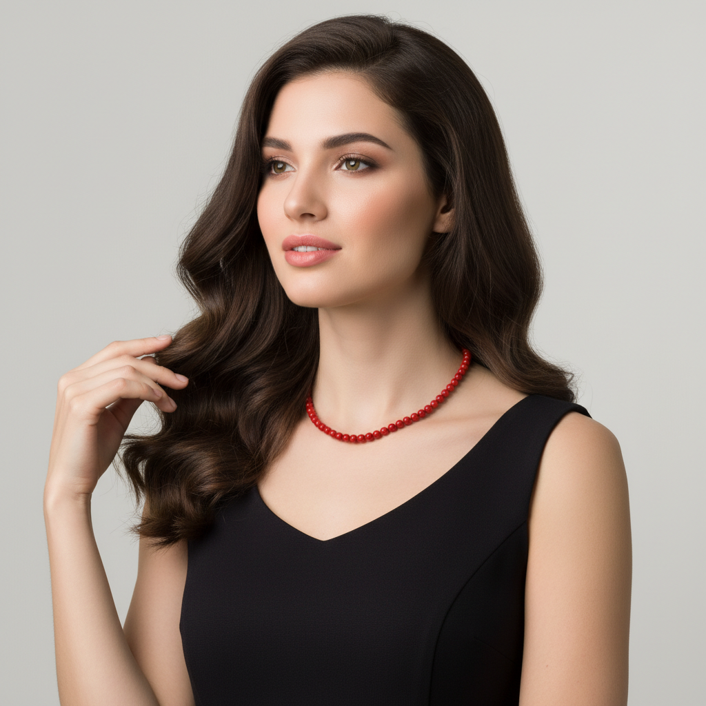 Коралловые бусы окрашены в сочный ярко красный цвет и создают выразительный акцент благодаря плотному цвету и гладкой круглой форме элементов. Украшение легко вписывается в повседневные и праздничные комплекты, добавляя тепла и насыщенности. Фурнитура выполнена из высококачественного бижутерного сплава, обеспечивая удобное ношение и стойкость изделия.