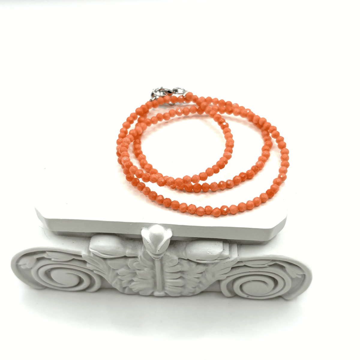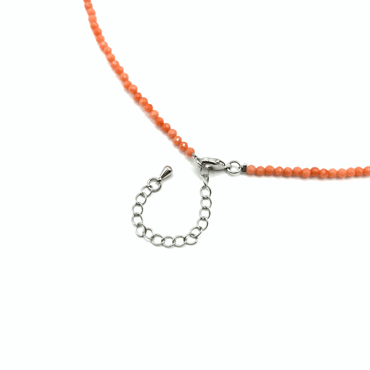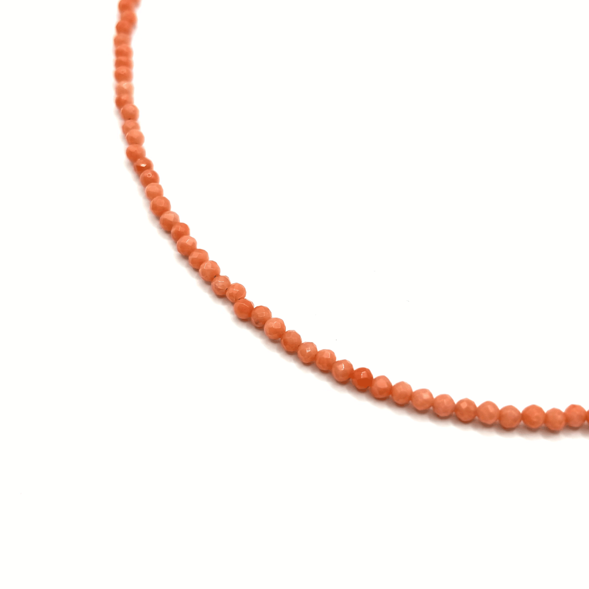 Чокер из коралла в оранжево-розовом оттенке сочетает лёгкость цвета и блеск гранёной поверхности. Небольшие бусины создают деликатную фактуру, подчёркивая женственность и лёгкость стиля. Украшение подходит для тёплых дневных образов. Фурнитура выполнена из высококачественного бижутерного сплава, изделие комфортно и прочное.