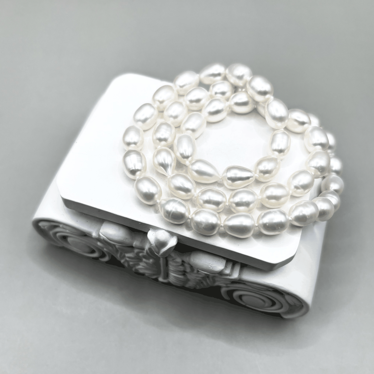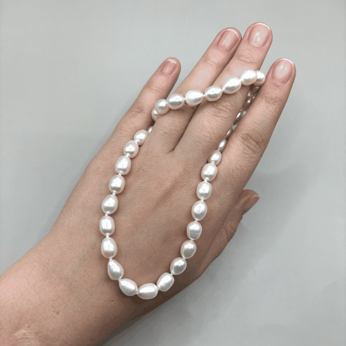 Бусы из речного жемчуга белого цвета выделяются мягким переливом и крупными овальными бусинами, создающими роскошную фактуру. Украшение подчёркивает индивидуальность и добавляет благородного сияния как дневным, так и вечерним образам. Фурнитура изготовлена из высококачественного бижутерного сплава, сохраняя прочность и удобство в носке.