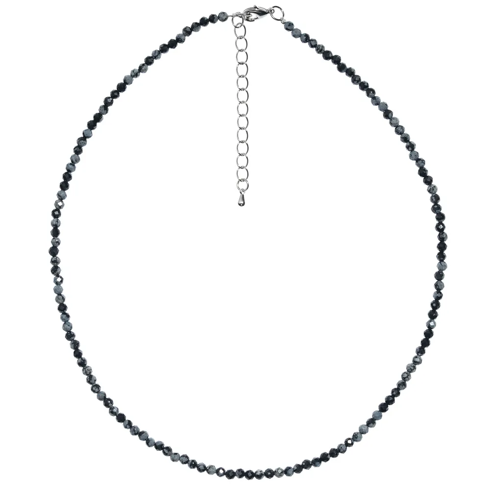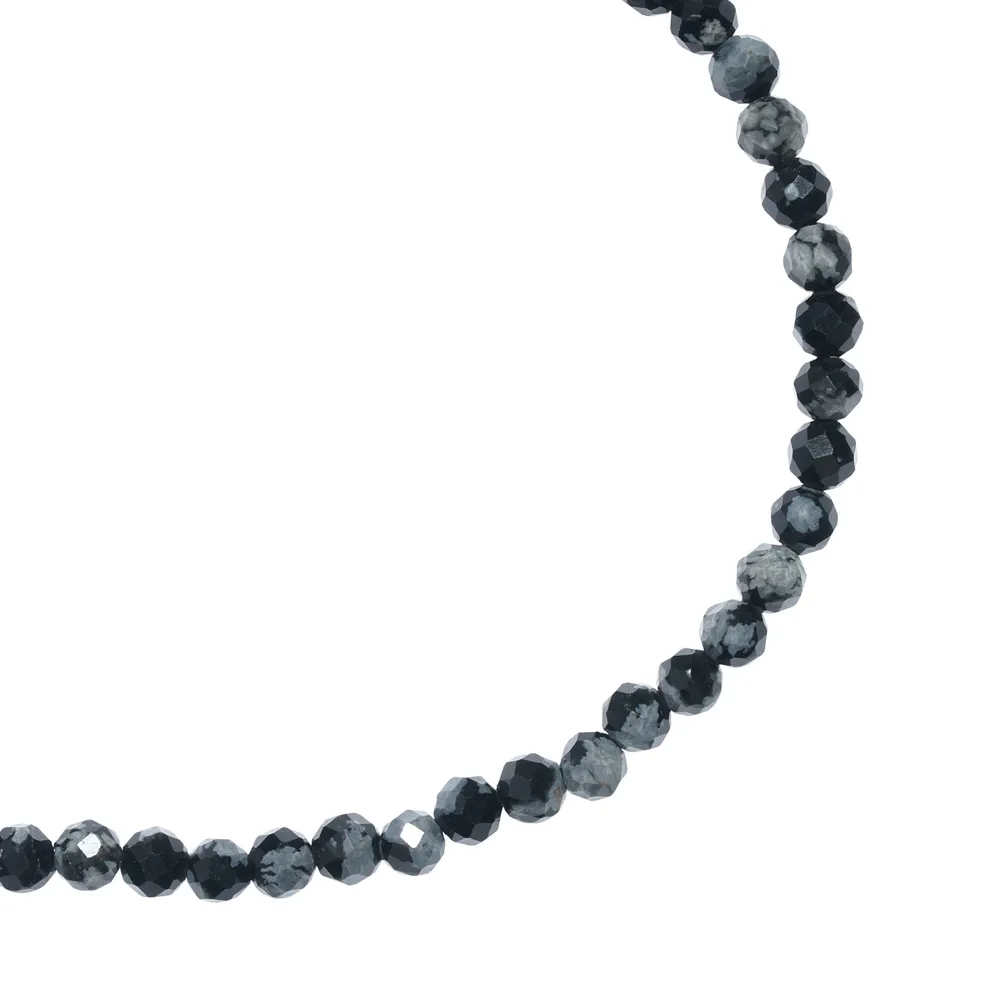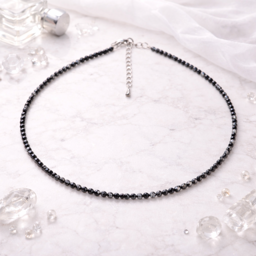 Чокер из натурального обсидиана притягивает внимание глубоким серым оттенком и мерцанием мелкой огранки. Камень создаёт выразительный, но спокойный акцент, подчёркивая индивидуальность и уверенность стиля. Лёгкая гранёная фактура добавляет украшению динамики. Замок-карабин из высококачественного бижутерного сплава надёжен и удобен для ежедневного ношения.