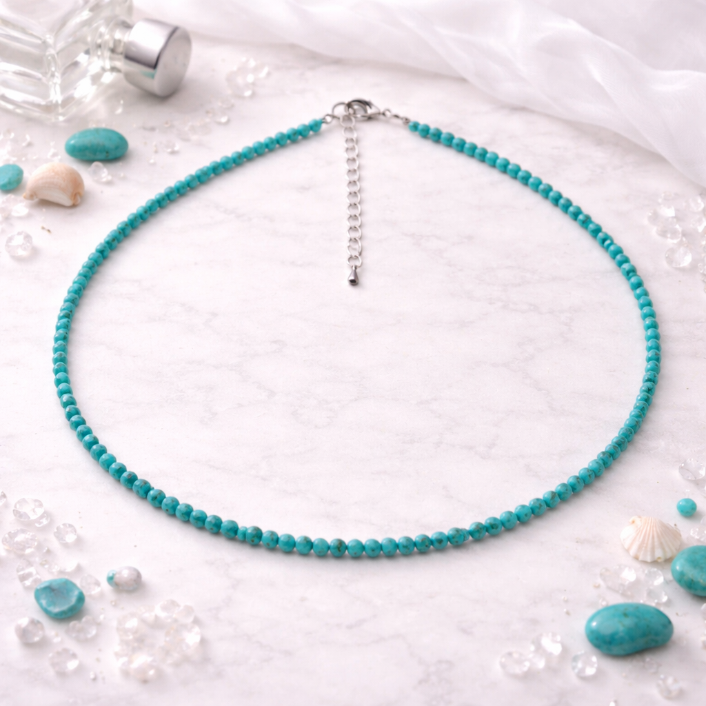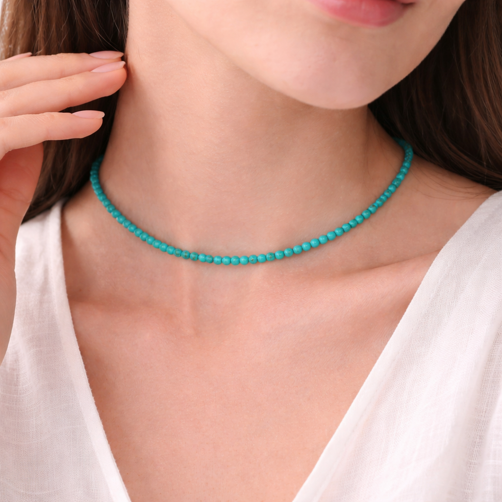 Чокер из окрашенного говлита в оттенке бирюзы создаёт яркий, свежий акцент и отлично подходит для летних образов. Мелкие гранёные бусины красиво играют на свету, а натуральная текстура камня добавляет изделию живости. Украшение лёгкое и универсальное. Надёжный карабин из высококачественного бижутерного сплава обеспечивает комфорт и устойчивую фиксацию.