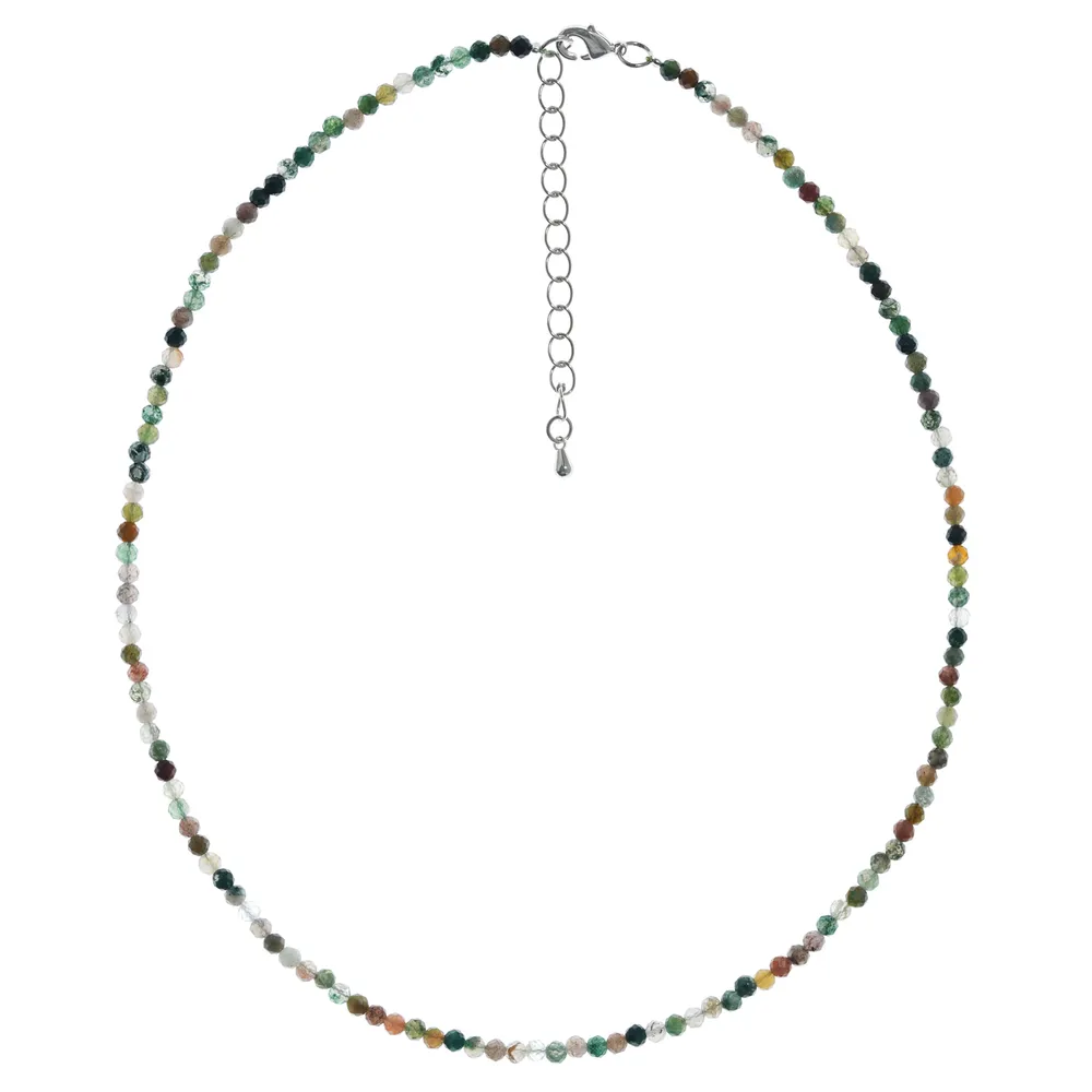 Чокер из натурального индийского агата сочетает зелёные, коричневые и светлые оттенки, создавая природный мягкий градиент. Гранёные бусины придают украшению мерцающую фактуру, которая подчёркивает глубину камня. Чокер легко вписывается в повседневные и богемные стильные образы. Карабин из высококачественного бижутерного сплава гарантирует долговечность и удобство.
