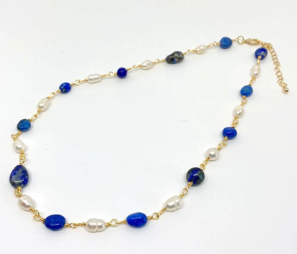Колье с речным жемчугом и лазуритом объединяет мягкое сияние жемчужин и благородный насыщенный синий оттенок природного камня. Барочные бусины делают украшение выразительным, а лазурит создаёт благородный акцент. Колье подходит как для минималистичных, так и для торжественных образов. Надёжный карабин из высококачественного бижутерного сплава обеспечивает комфорт.