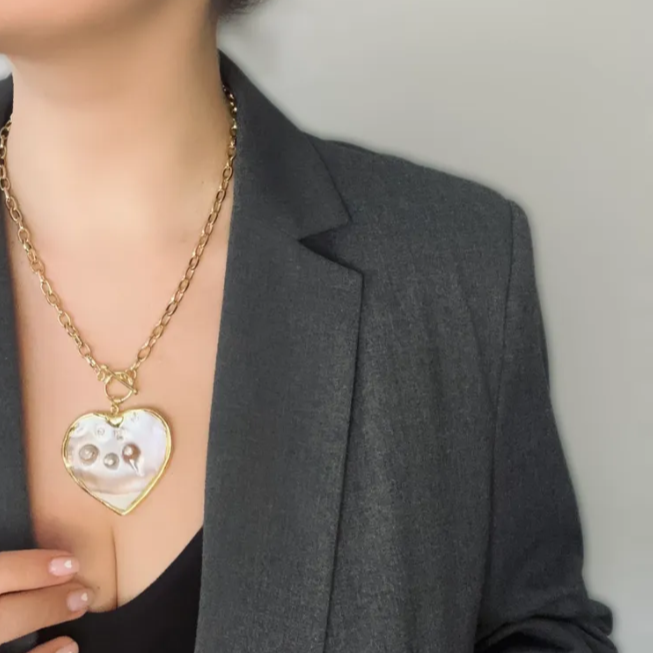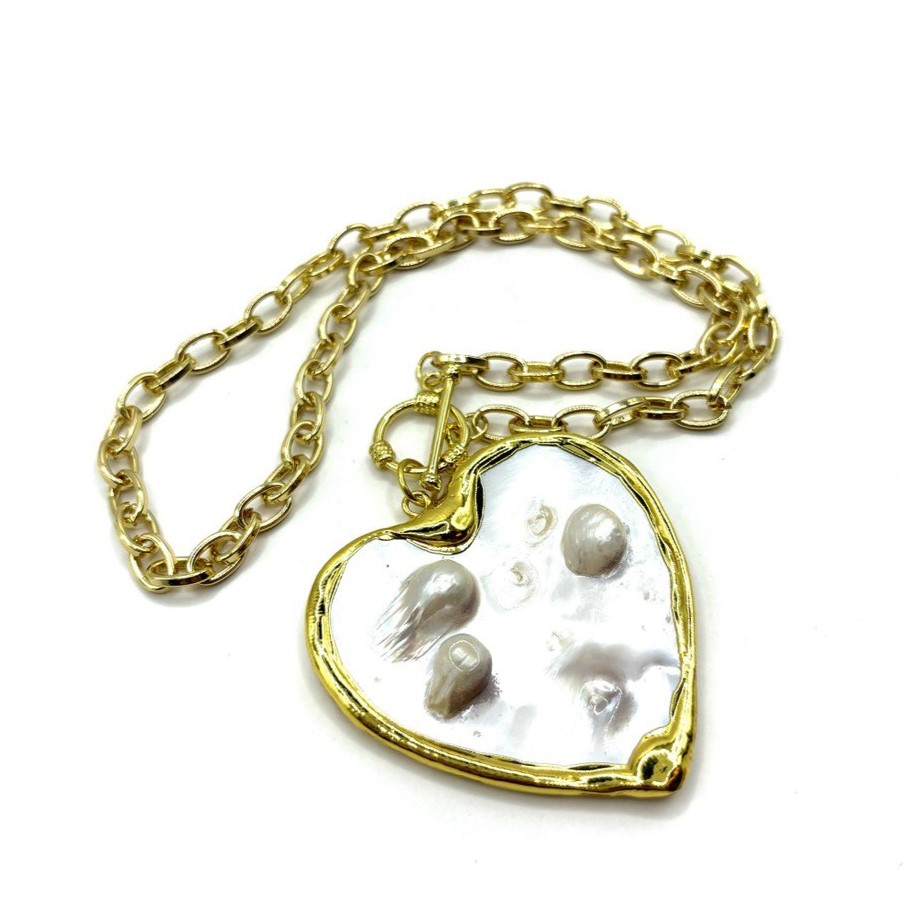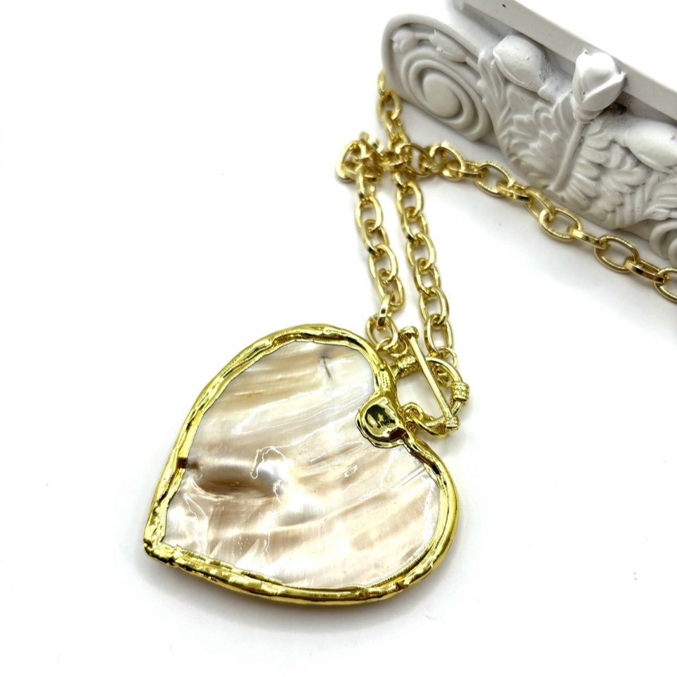 Колье-сердце с барочным жемчугом и перламутром создаёт выразительный акцент в образе благодаря сочетанию золотистого оттенка фурнитуры и природного блеска камней. Барочный жемчуг подчёркивает уникальность украшения, а перламутр добавляет глубокие переливы. Замок-тогл из высококачественного бижутерного сплава обеспечивает удобство и надёжность при носке.