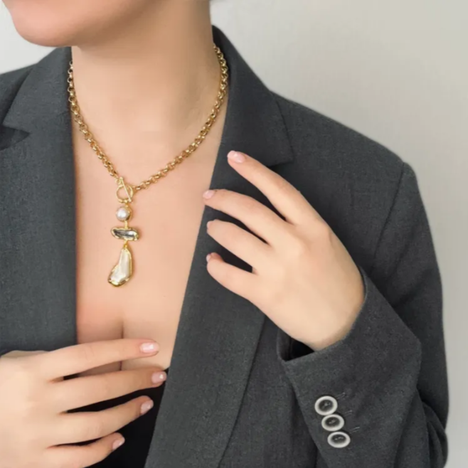 Колье с крупным барочным жемчугом и длинной подвеской выделяется необычной фактурой натуральных бусин и гармонией белых и насыщенно-фиолетовых оттенков. Барочная форма делает украшение неповторимым и выразительным. Колье идеально подходит для тех, кто любит смелые акценты. Замок-тогл из высококачественного бижутерного сплава обеспечивает комфорт и лёгкость в использовании.